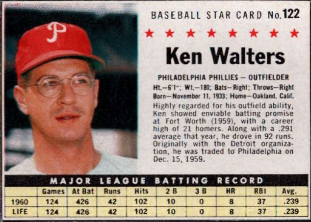 1961 Post Cereal Box Baseball Card #122b Ken Walters ( company)