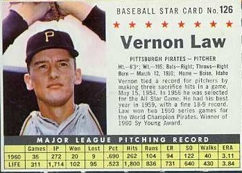 1961 Post Cereal Box Baseball Card #126a Vernon Law (box)