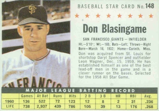 1961 Post Cereal Box Baseball Card #148a Don Blasingame (box)