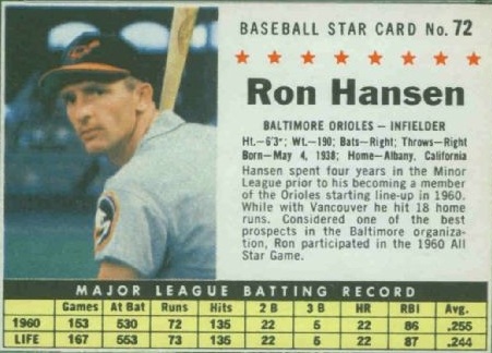 You have: 1961 Post Cereal Box Baseball Card #72b Ron Hansen (company)