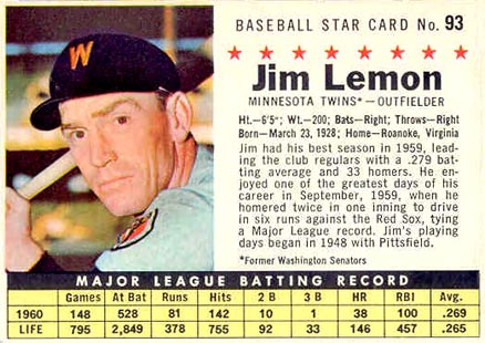 You have: 1961 Post Cereal Box Baseball Card #93a Jim Lemon (box, Minneapolis)