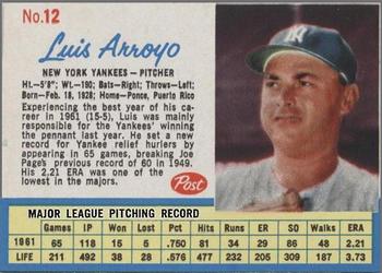 1962 Post Cereal Box Baseball Card #12 Luis Arroyo