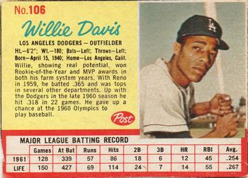 1962 Post Cereal Box Baseball Card #106 Willie Davis