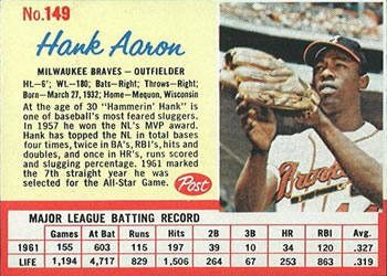 You have: 1962 Post Cereal Box Baseball Card #149 Hank Aaron (Hall of Fame)