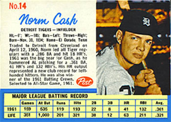 1962 Post Cereal Box Baseball Card #14a Norm Cash (throws right)