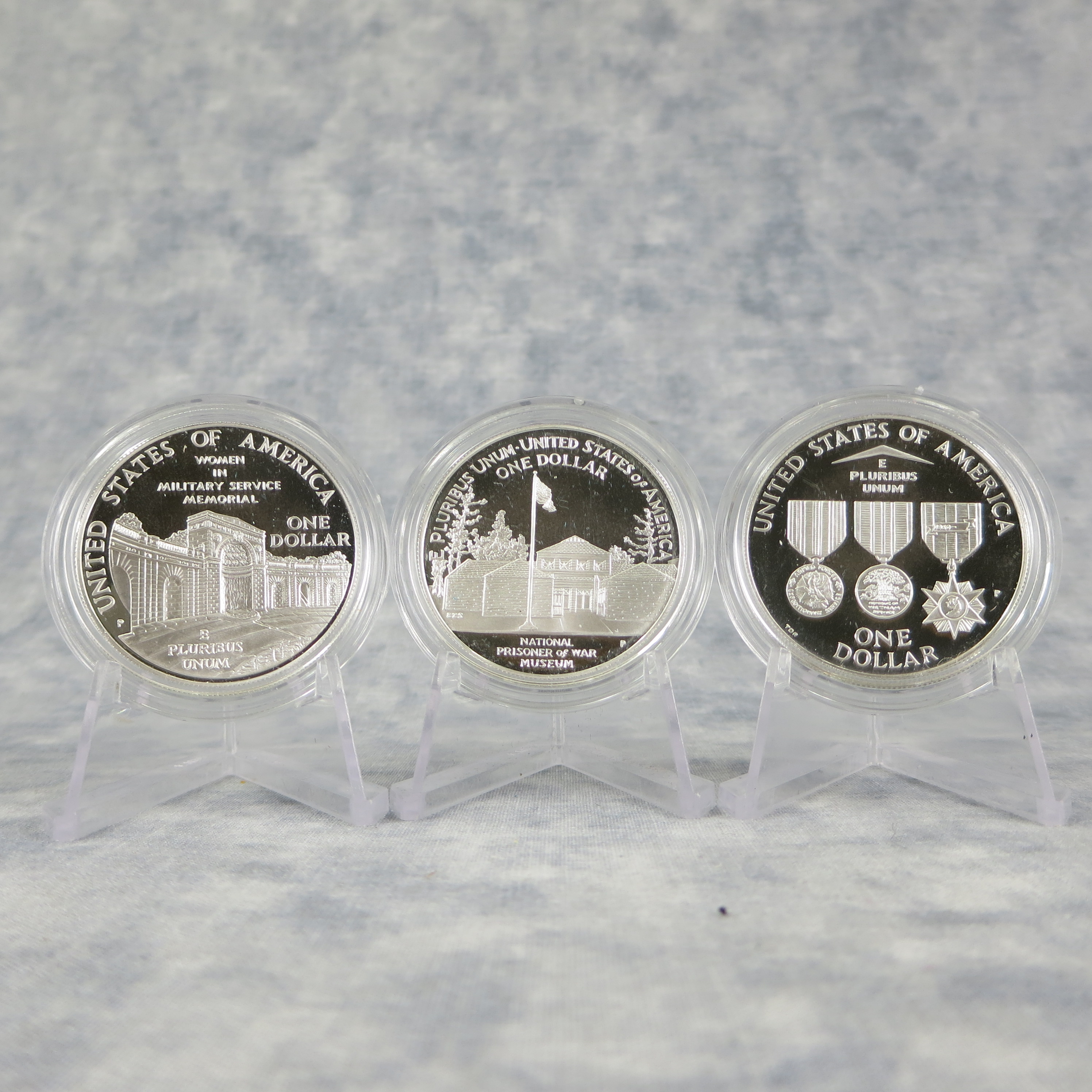 January 16, 2026 - Philadelphia Mint. Includes three commemorative silver dollars proofs: Prisoner of War, Vietnam Veterans Memorial, Women in Military Service; original US Mint box and sleeve, velvet display case and certificate of authenticity. Each silver dollar is comprised of 26.73 grams of 90% silver.