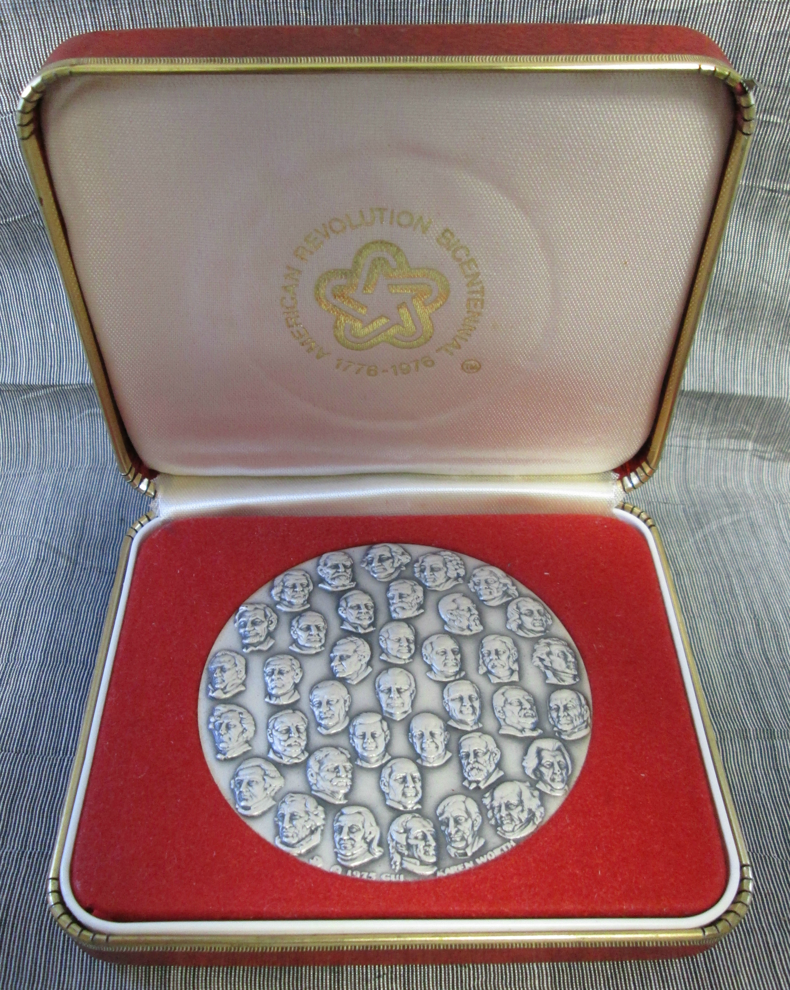 December 31, 2025 - This beautiful Commemorative Silver Medal features The first 37 Presidents of The United States from 1776 to 1976. "It is an officially recognized Commemorative of the American Revolution Bicentennial Administration Authorized under public law 93-179." All this is stated with 2 Certificates of Authenticity. Moreover it has been created under the direction of Robert Weber and sculpted by the famous artist Karen Worth ~ Fellow Of The National Sculpture Society ~ a most esteemed medalist, who was commissioned to create this beauty! Comes in a Red Keepsake ~ Presentation Case. This metal contains more than 4.25 troy ounces of fine (.999) silver.