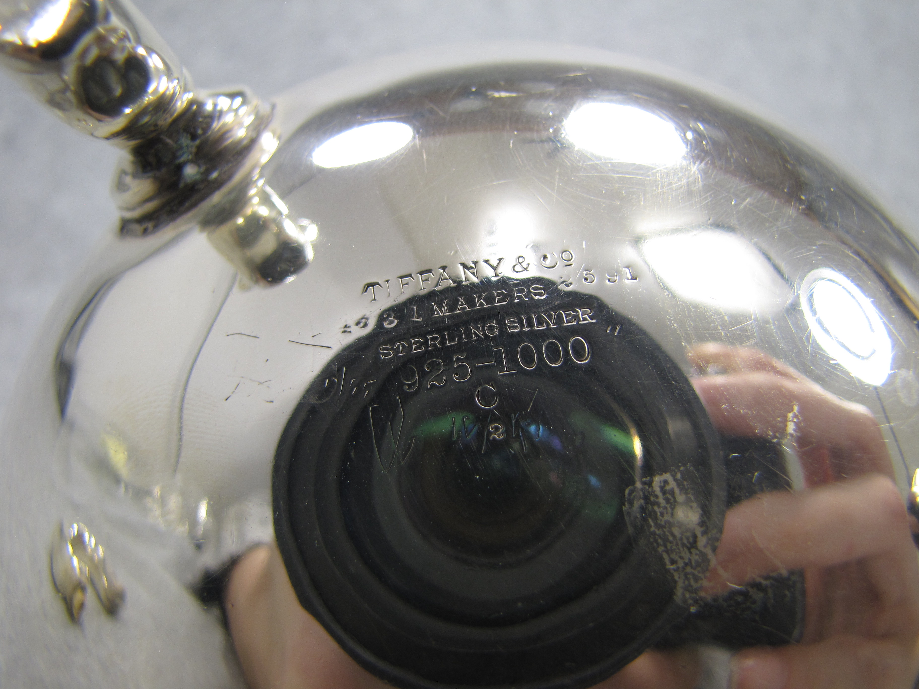 December 06, 2025 - Solid Sterling Silver. Vintage three footed pot with scroll handle and wavy top. Height: 5 inches. Weight: 319 grams. Pattern number 4531. Stamped 'Tiffany & Co., 4531 makers 2591, Sterling Silver, 925-1000' on bottom.  Makers mark indicates this piece was made between 1902-1907 by silversmith Charles T. Cook.