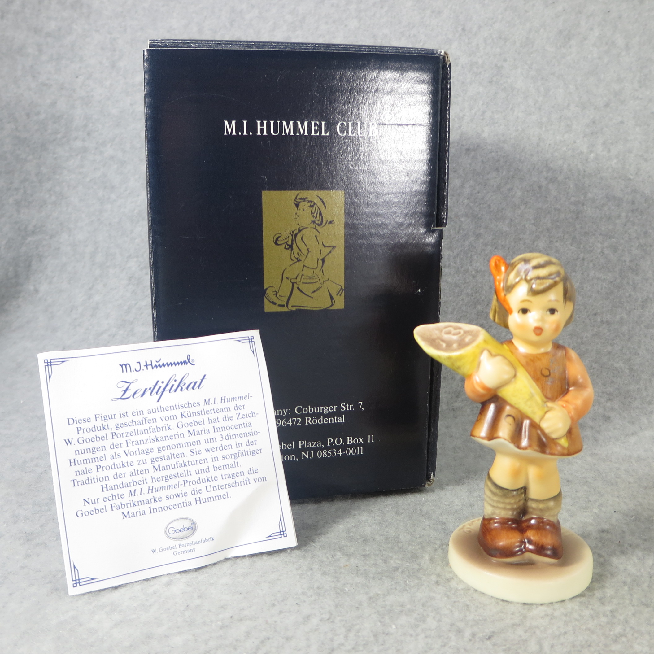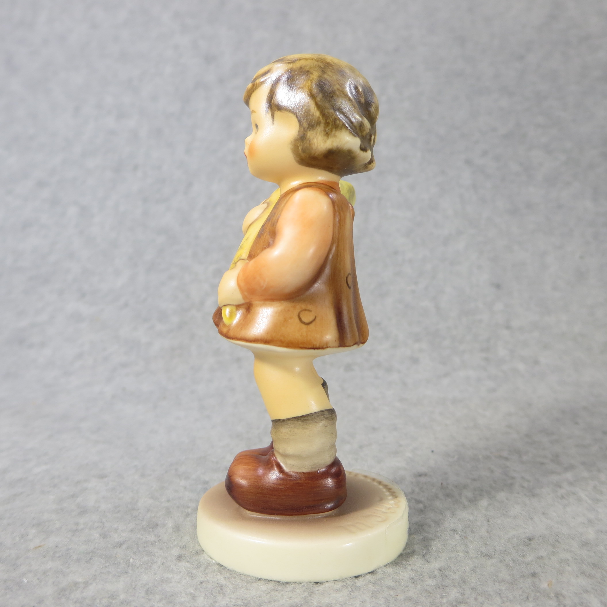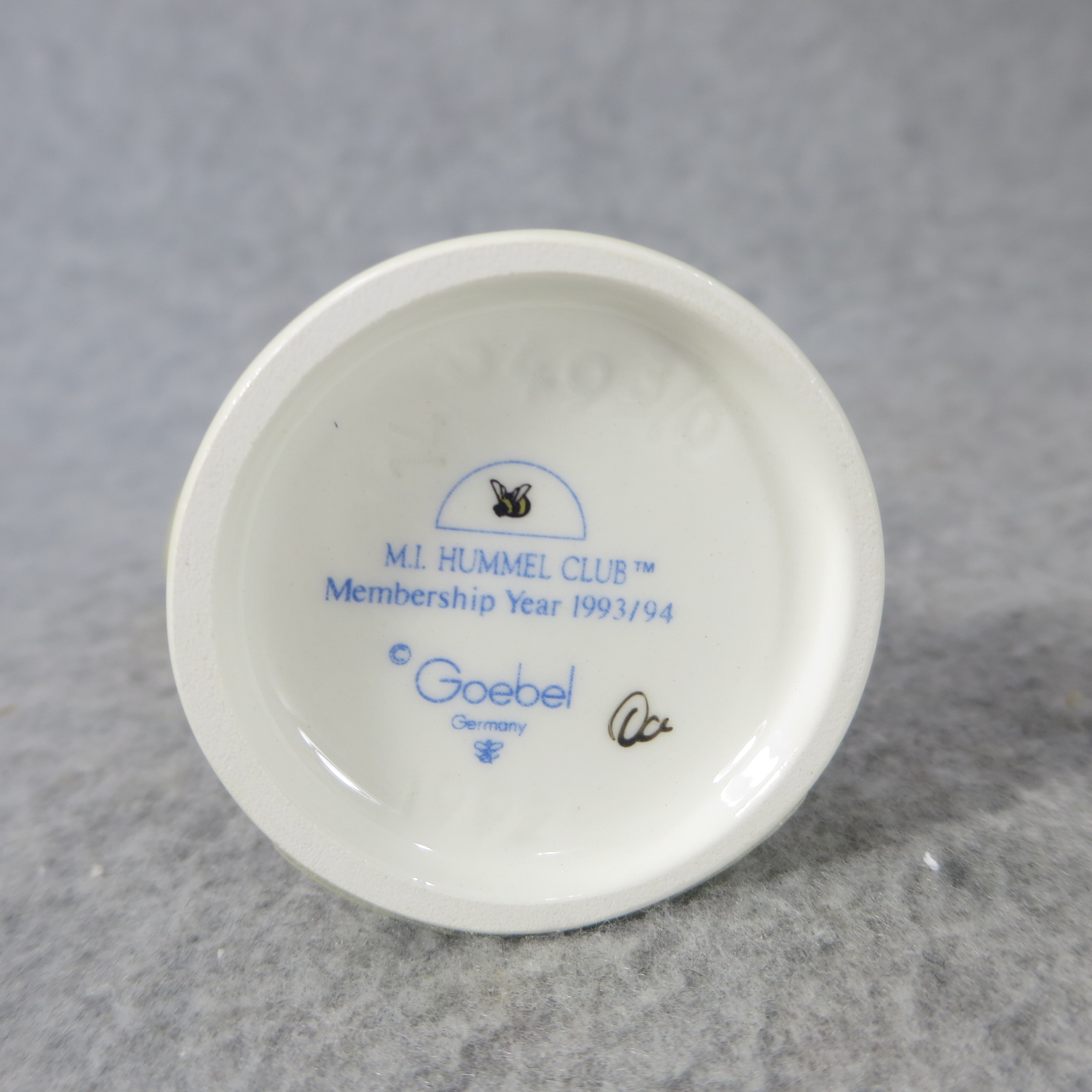 3 1/2 inches tall. Base incised 549 3/0 and 1992. Geobel TMK 7 trademark and 'M.I. HUMMEL CLUB/Membership Year 1993/94' imprinted in blue on bottom of base. Painter hand-initialed in black on bottom of base.
