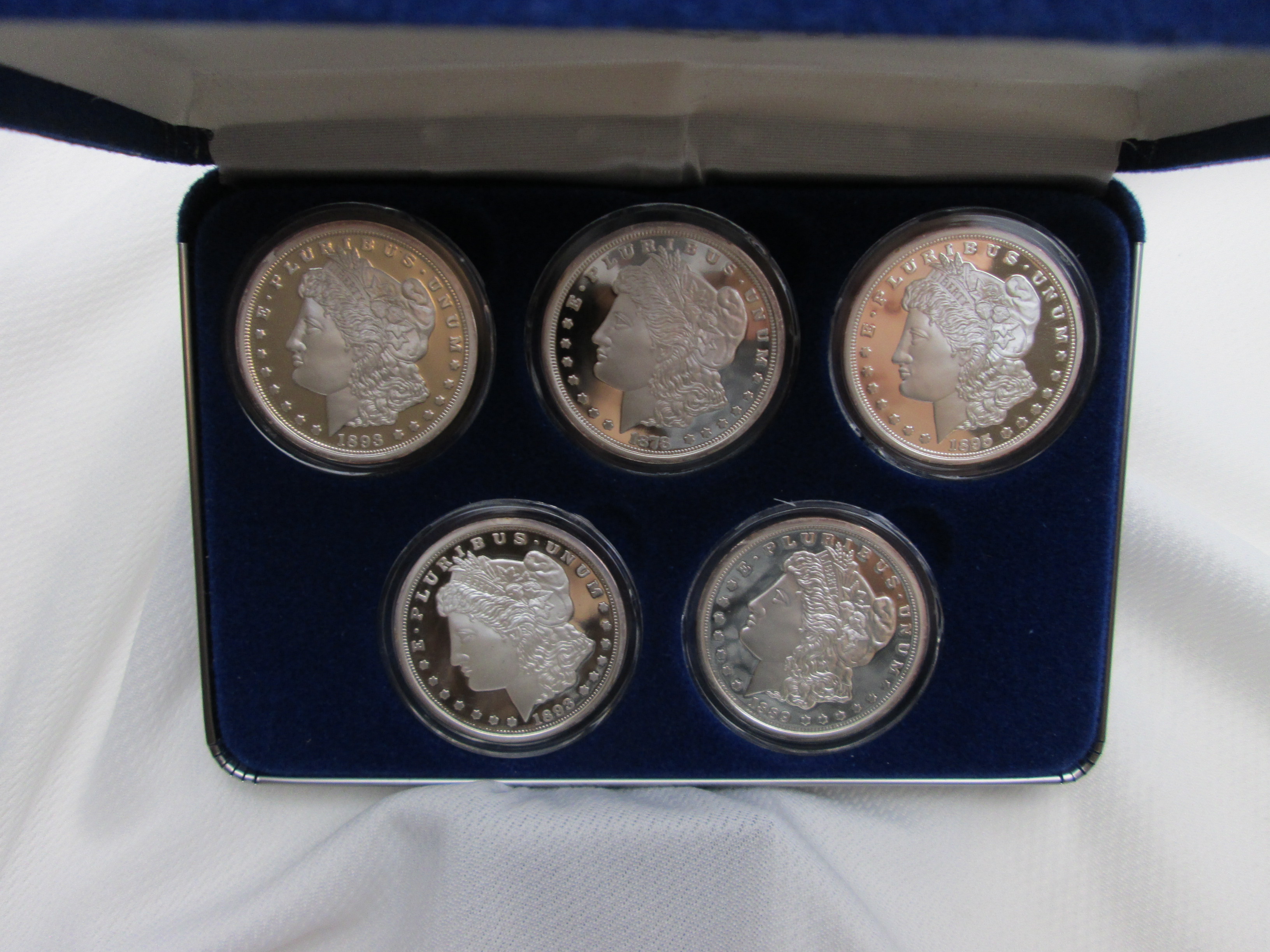 April 04, 2026 - Each Collector's desired proof coin is struck in 100 Mil .999 Silver Clad Base. All bear a date and mint-mark of the rarest and most expensive Morgan Silver Dollars including: the 1893 Carson City Mint design which sold at auction for $529,000; the 1893 San Francisco Mint design which sold for over $410,000; the 1893 New Orleans Mint design which has sold for up to $200,000; and the 1895 Philadelphia Mint design which sold for over $85,000. Also included is the tribute to the first-year-of-issue 1878. With original box, protective sleeve and COA.