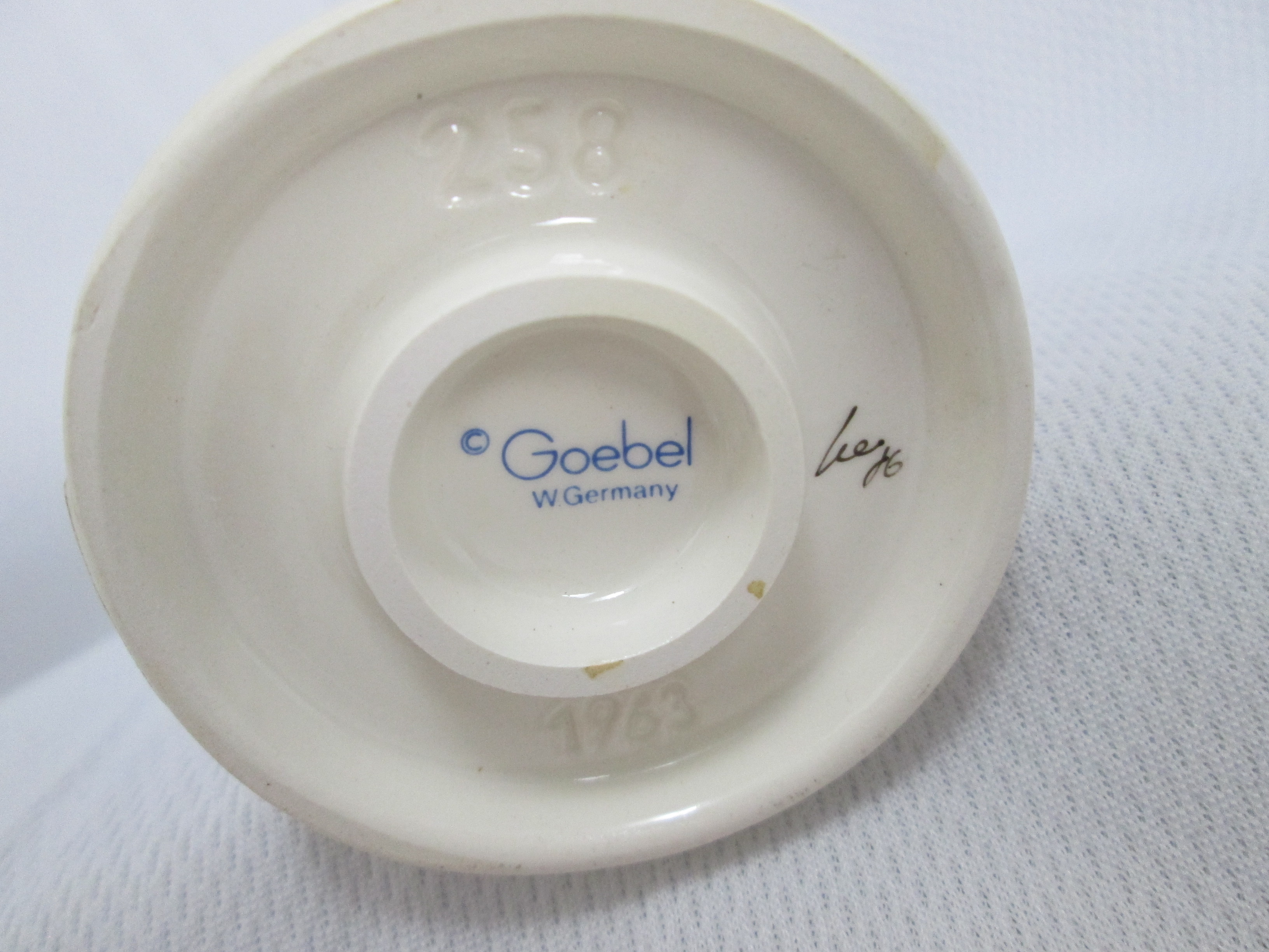 March 13, 2026 - 5 inches tall. Base is incised 258 and 1963. Goebel TMK 6 trademark imprinted in blue on bottom of base. Artist hand initialed and dated in black ink.