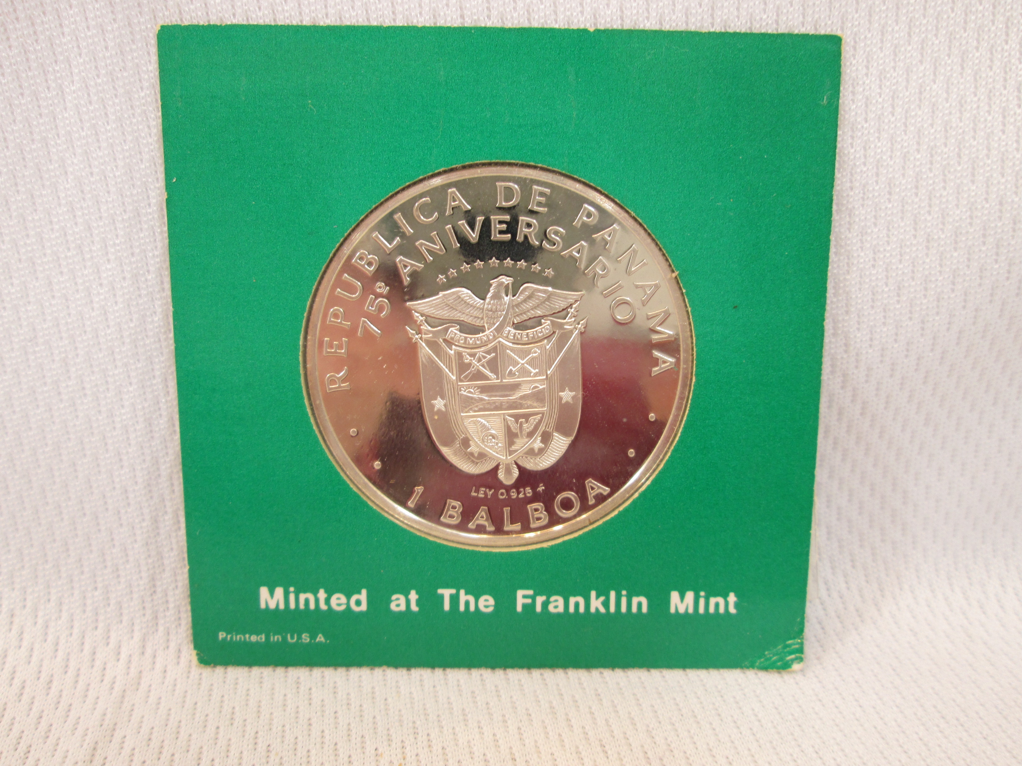 April 21, 2026 - 38 millimeters (1 1/2 inches) in diameter. Solid sterling silver proof weighing ~27 grams. Limited mintage of only 13,000. Issued to celebrate the 75th anniversary of Panamanian independence. Minted by The Franklin Mint under authorization of the Panamanian government. Hermetically sealed on official Republic of Panama display card.