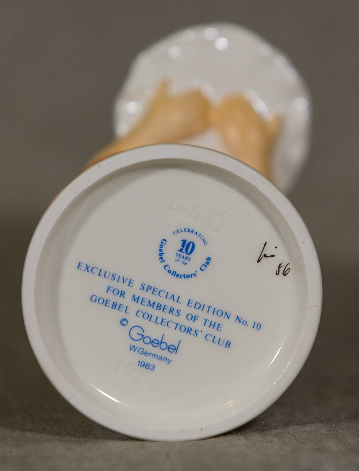 April 19, 2026 - 5-1/2 inches tall. Base is incised 440 and 1983. Goebel TMK 6 trademark 1983 and CELEBRATING 10 YEARS OF THE GOEBEL COLLECTORS' CLUB, EXCLUSIVE SPECIAL EDITION NO. 10 FOR MEMBERS OF THE GOEBEL COLLECTORS' CLUB imprinted in blue on bottom of base. Painter hand-initialed and dated in black ink on bottom of base.