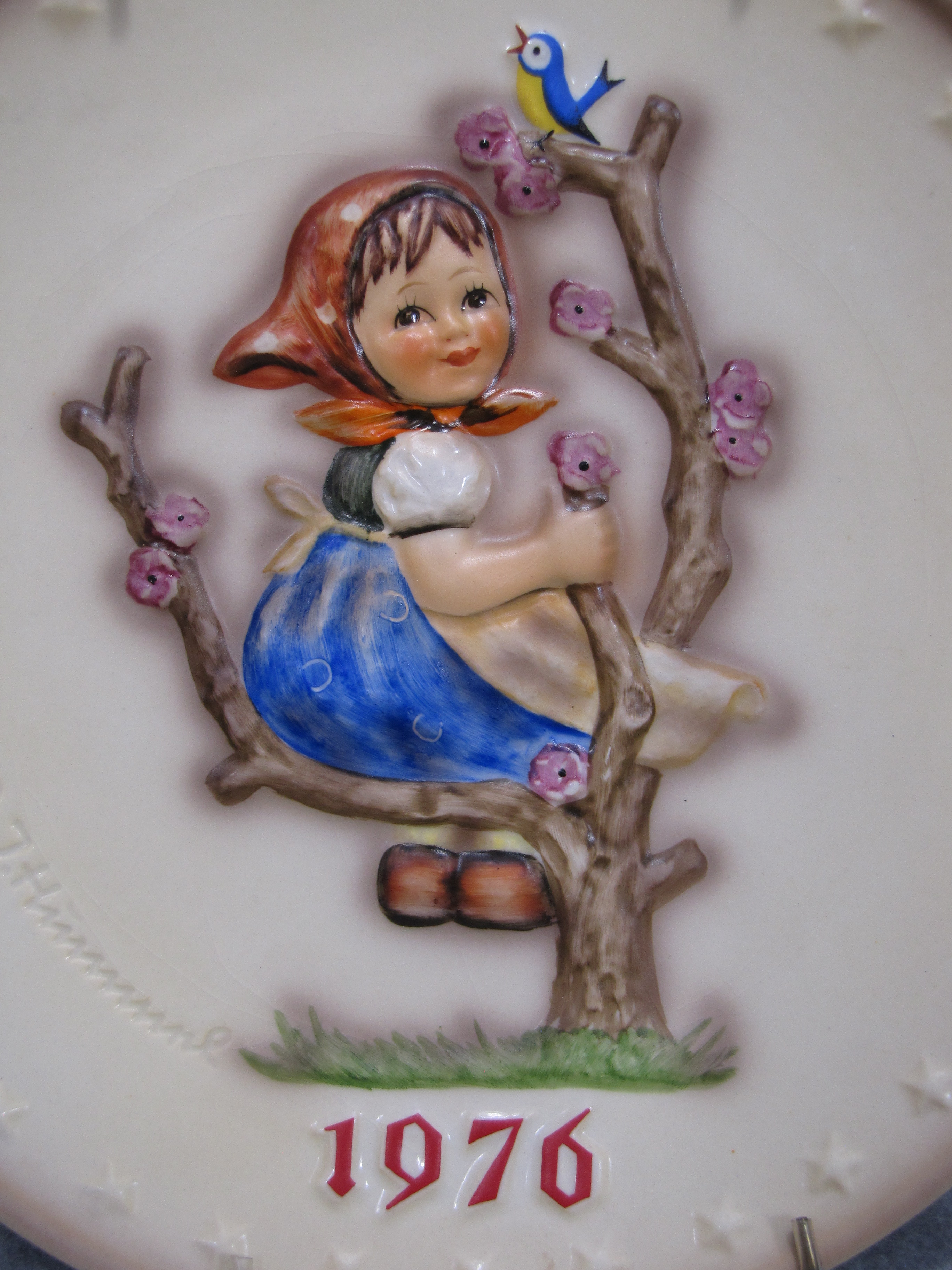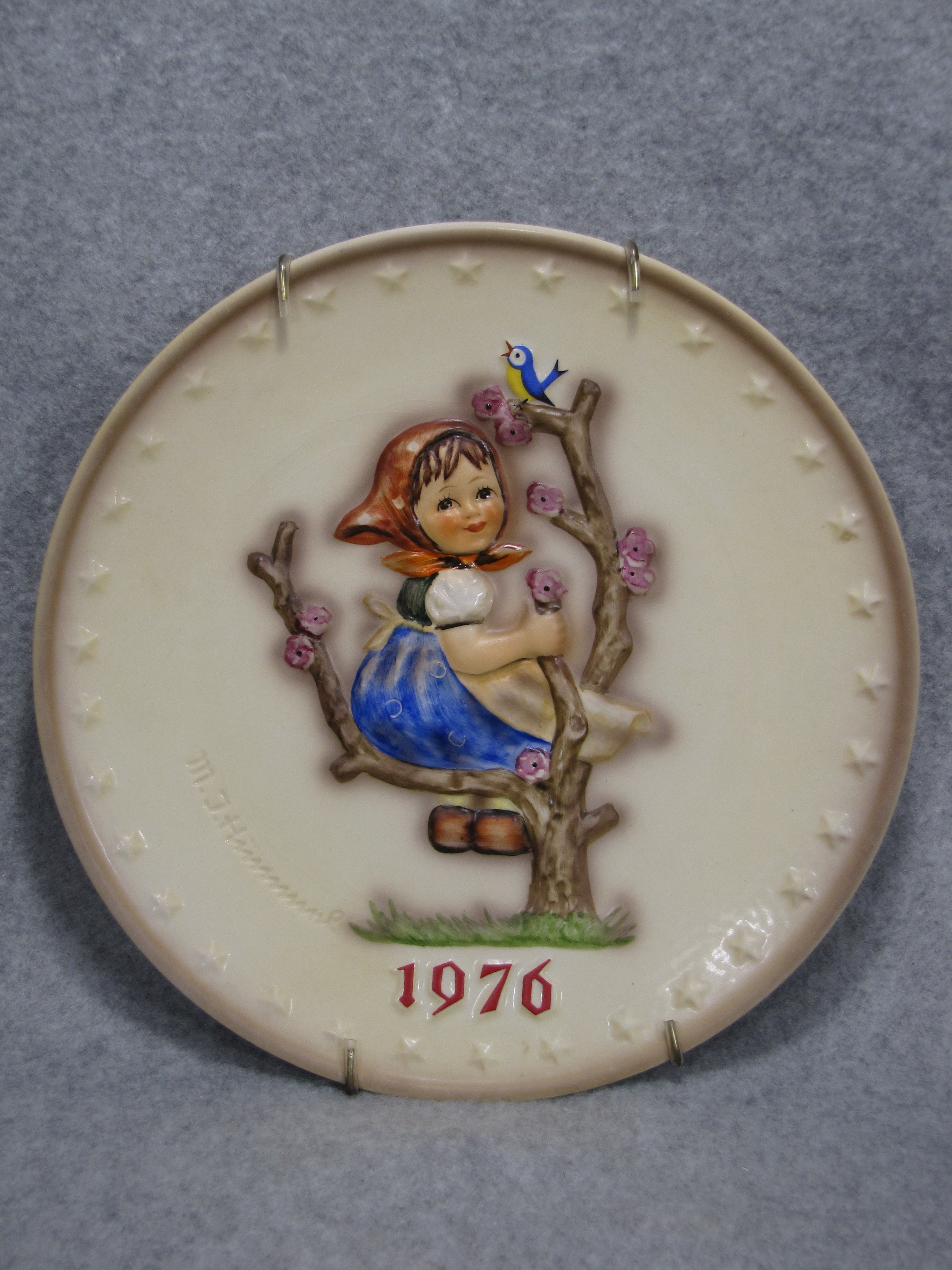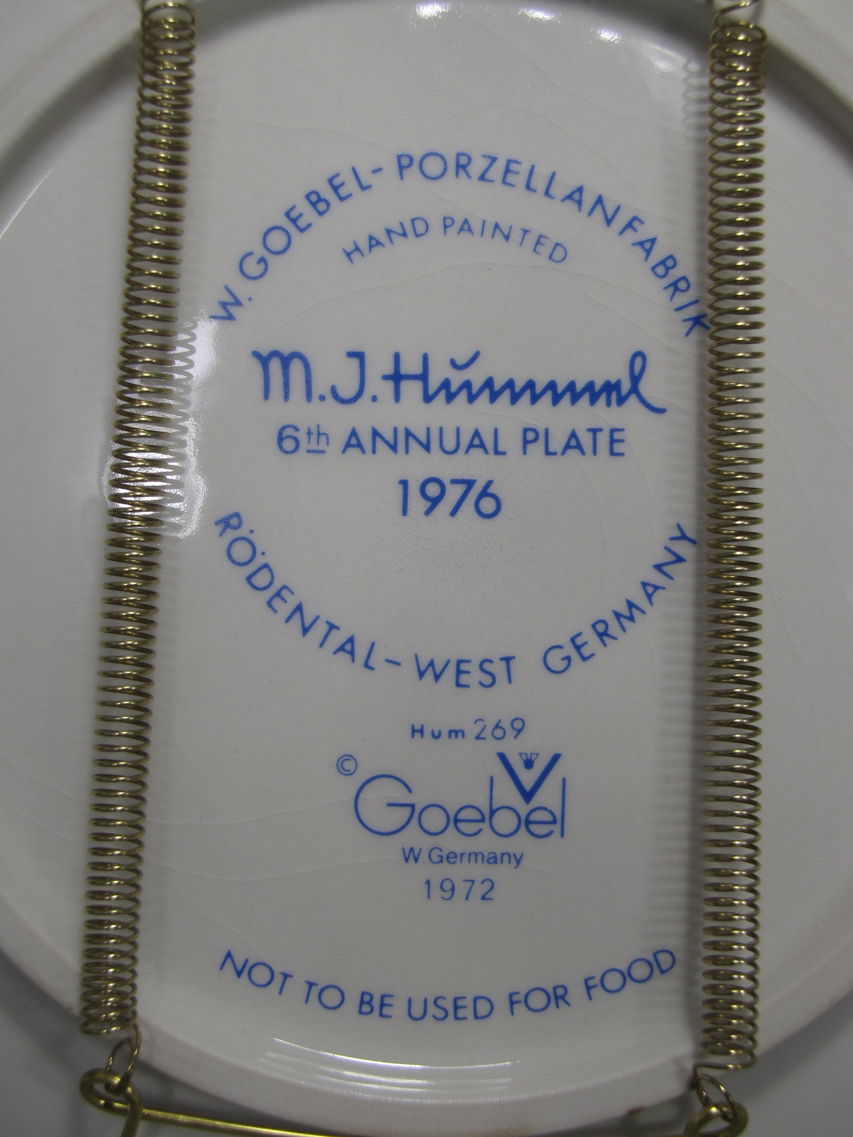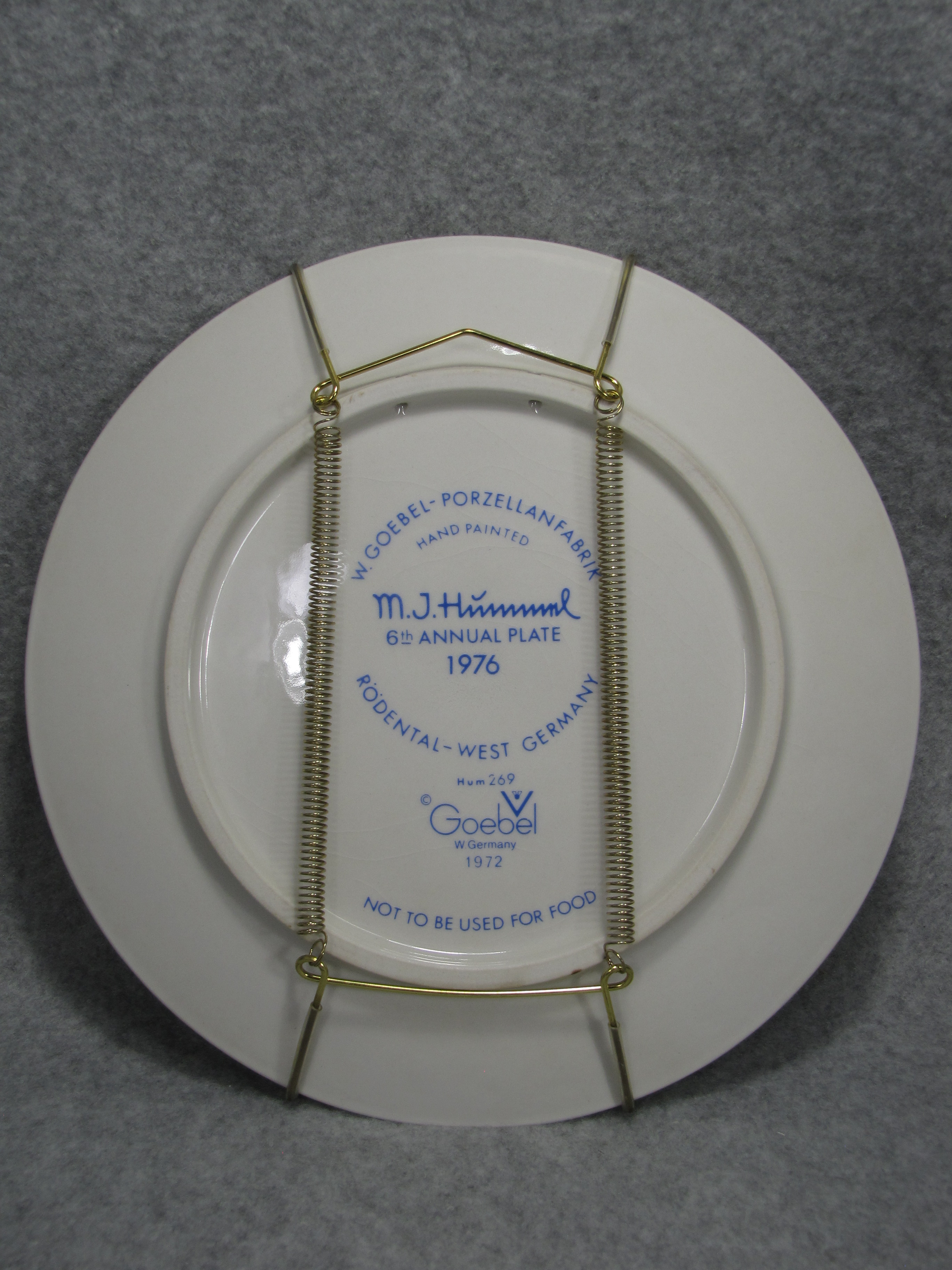 April 19, 2026 - 7-1/2 inches in diameter. The following is imprinted in blue on bottom of base: Hum 269, Goebel TMK 5 trademark, W. GOEBEL - PORZELLANFABRIK, RODENTAL - WEST GERMANY, HAND PAINTED, M.I. HUMMEL 6th ANNUAL PLATE 1976