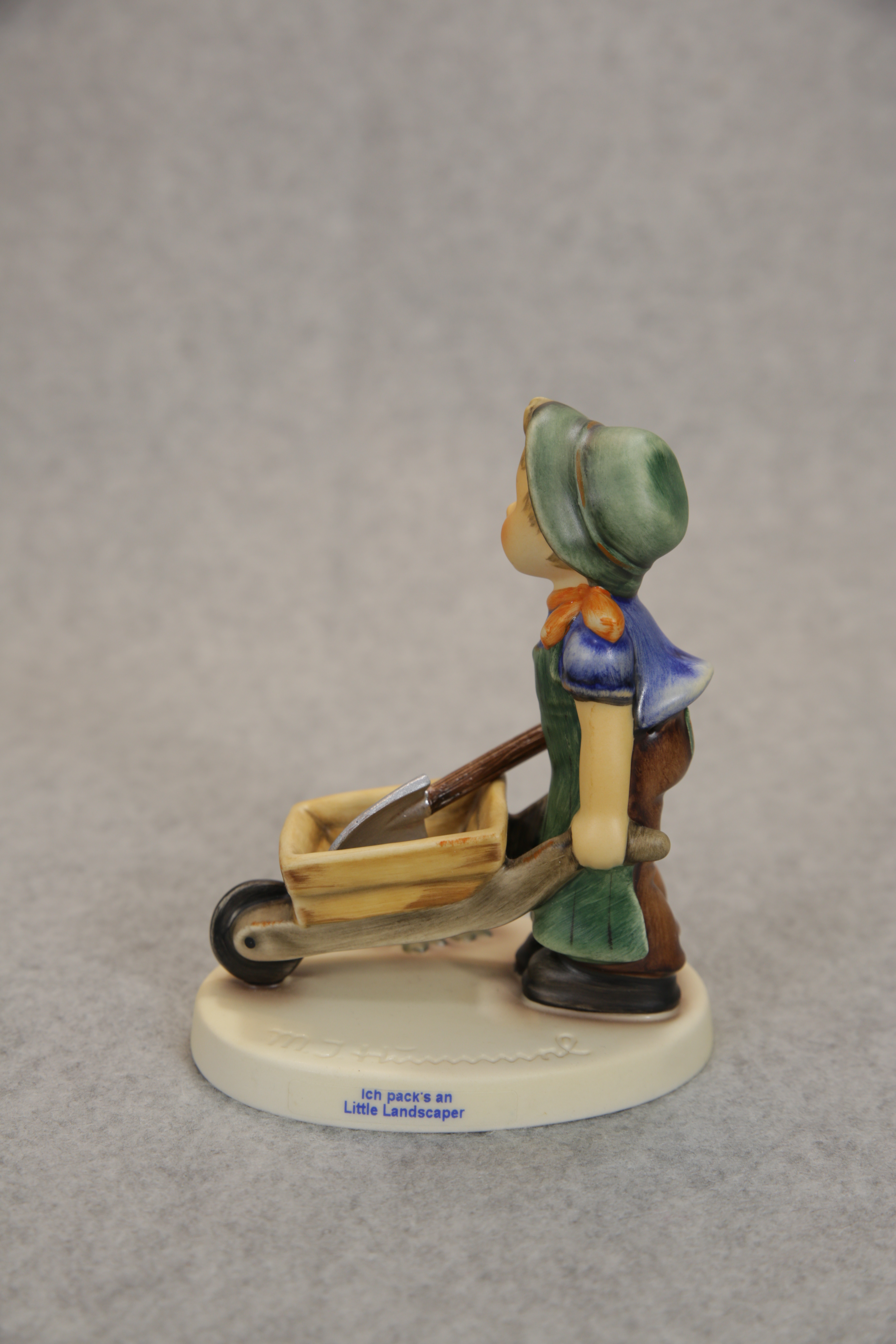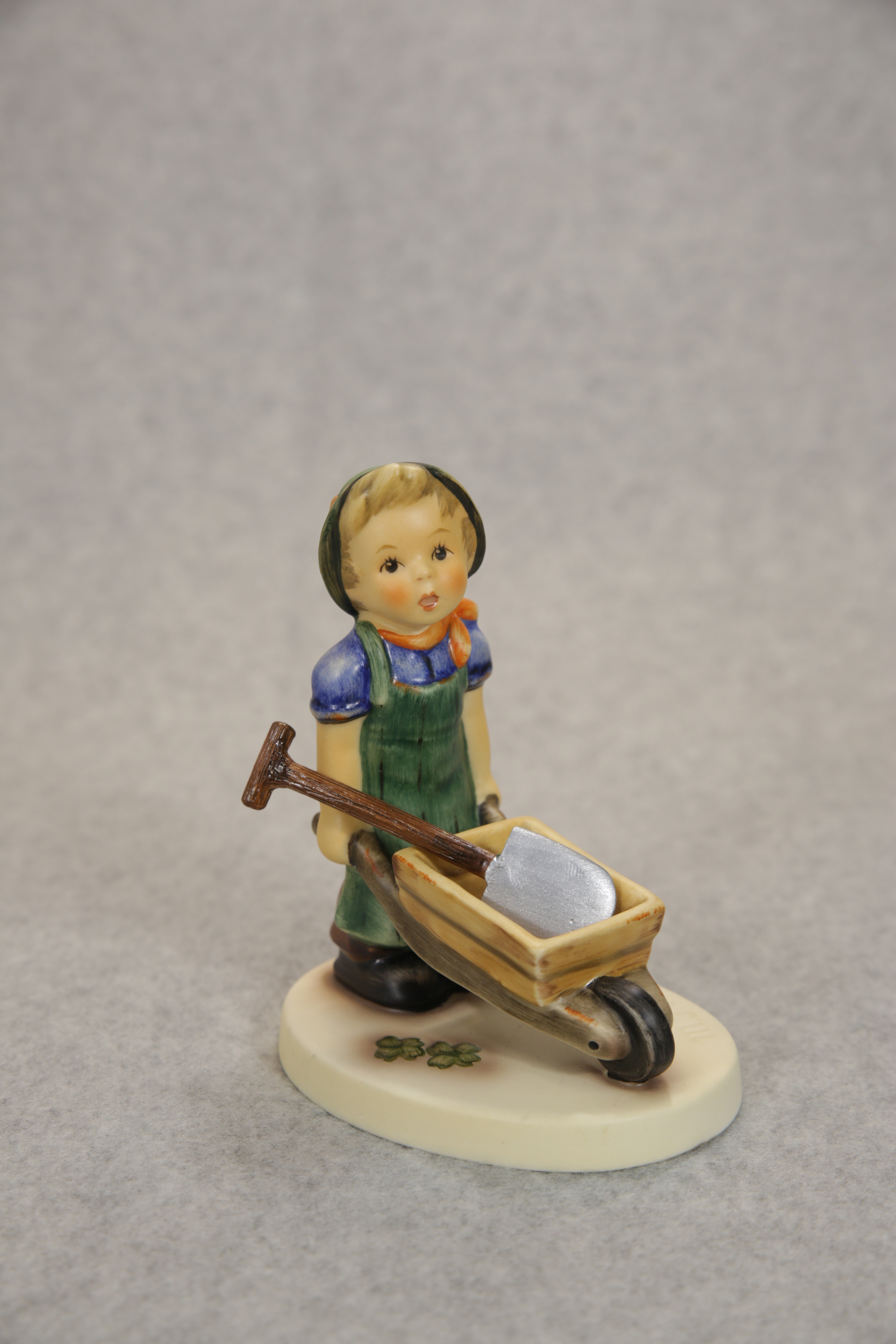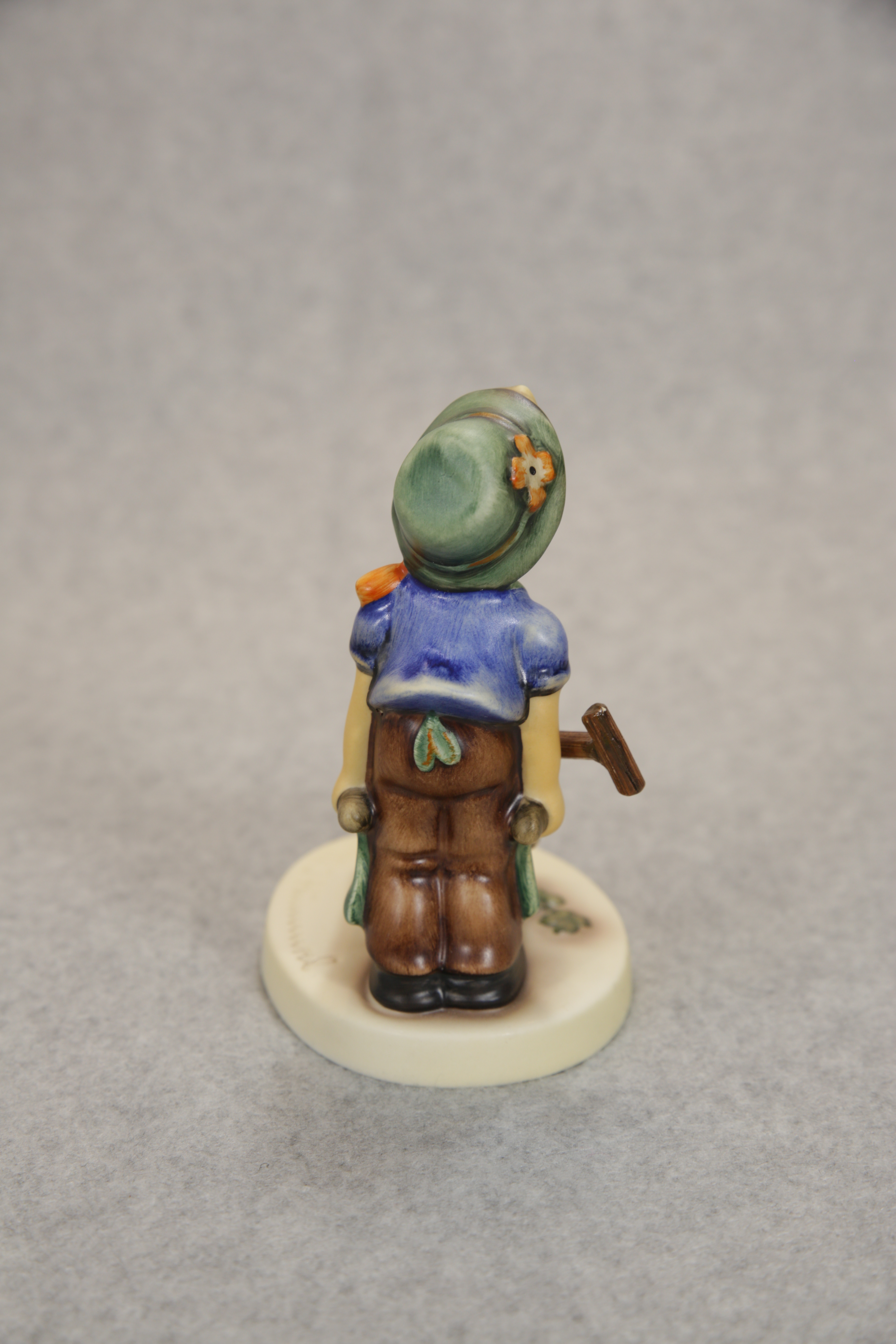 The figurine is 4 1/2 inches tall. Base is incised 2011 and 1996 . Goebel TMK 8 trademark imprinted in blue on bottom of base. Also in blue ink: First Issue, Erste Ausgabe, 2002. Artist hand initialed in black ink. Includes separate shovel.