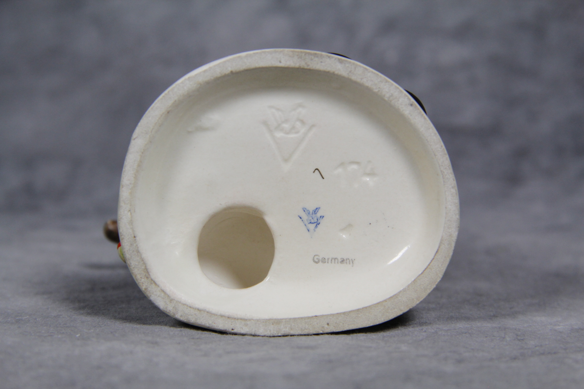 November 19, 2025 - 4-1/4 inches tall. Base is incised with the full bee trademark 2 and 174. Goebel TMK 2 trademark imprinted in blue on bottom of base. 'Germany' stamped in black ink on bottom of base.