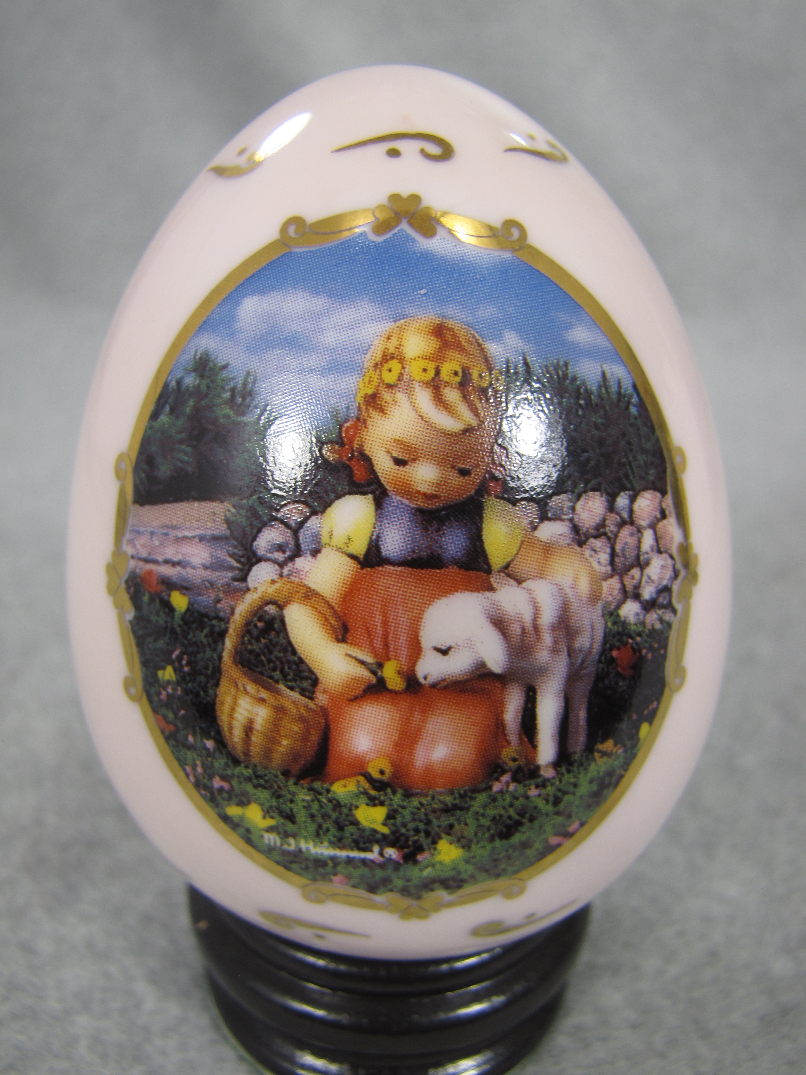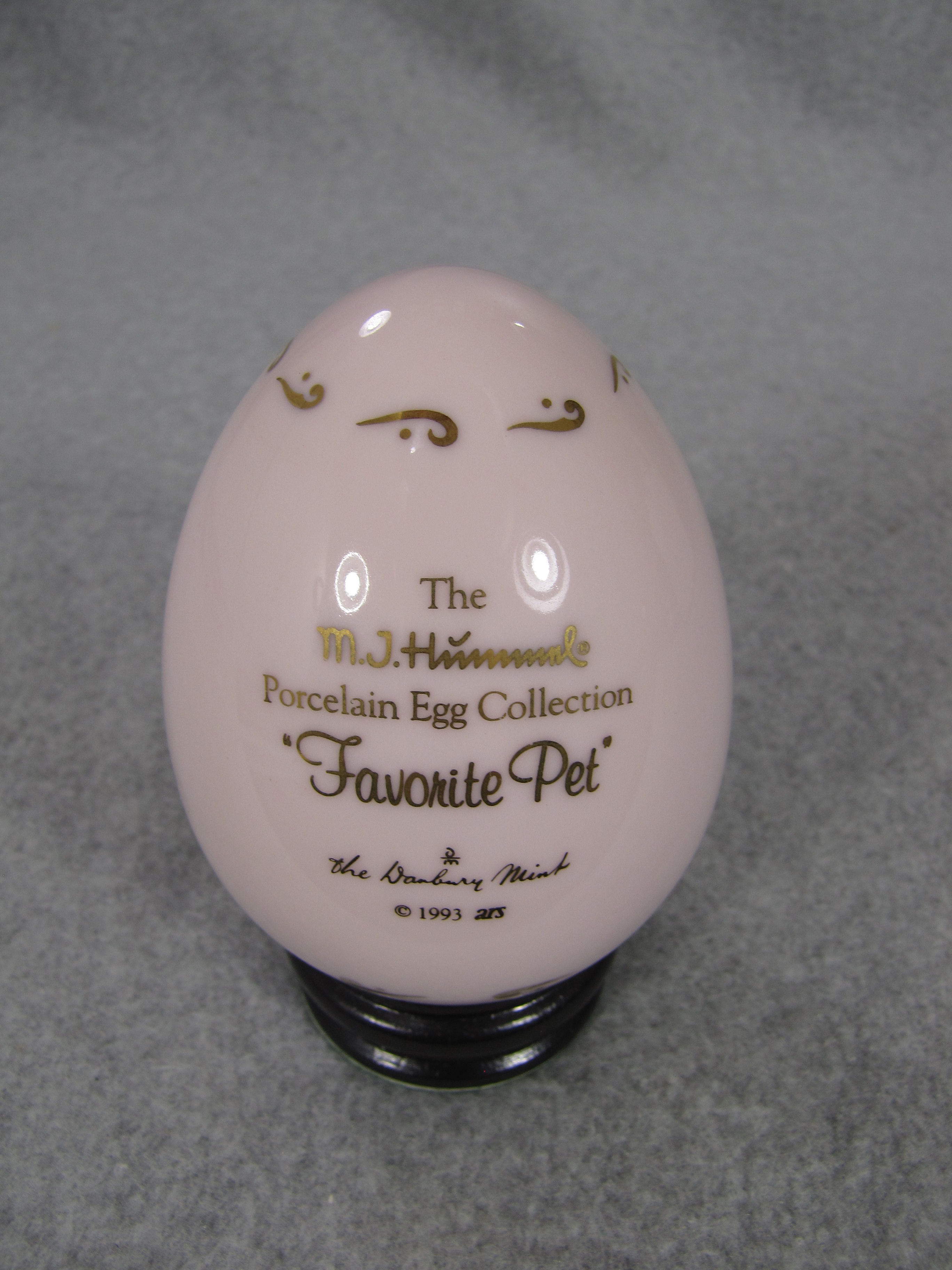 January 16, 2026 - 3-1/2 inches tall (4-1/4 inches tall with included base). From the M.I. Hummel Porcelain Egg Collection, titled "Favorite Pet". 'The Danbury Mint © 1993 ARS' is imprinted on back of egg in gold.