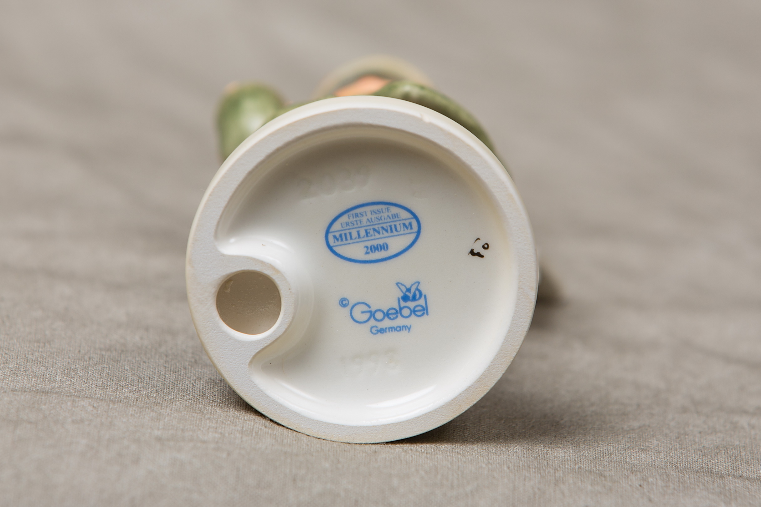 January 16, 2026 - 4-1/2 inches tall. Base is incised 2039 and 1998. Goebel TMK 8 trademark and 'FIRST ISSUE MILLENNIUM 200' imprinted in blue on bottom of base. Painter hand-initialed in black ink on bottom of base. Name stick still attached.
