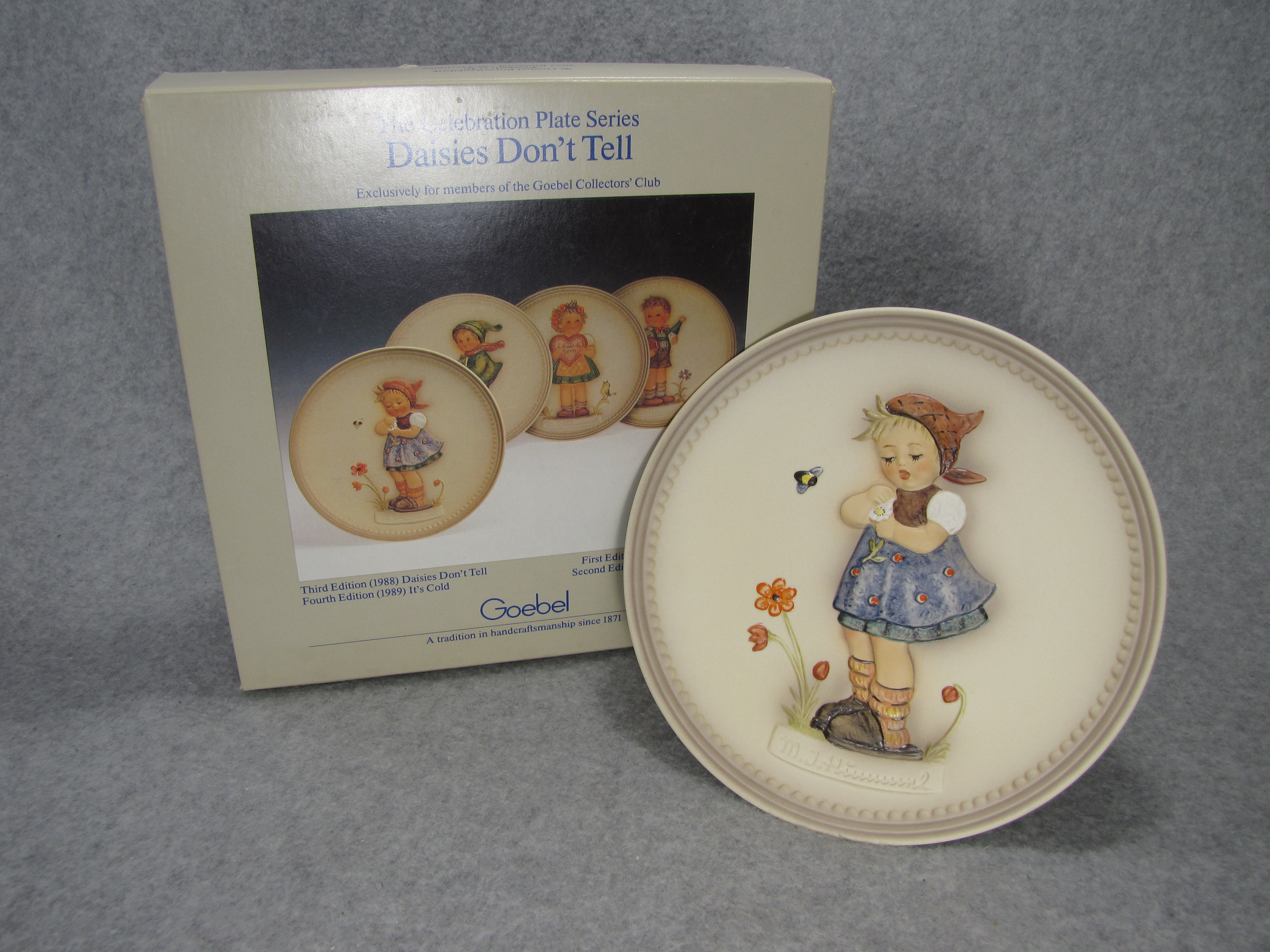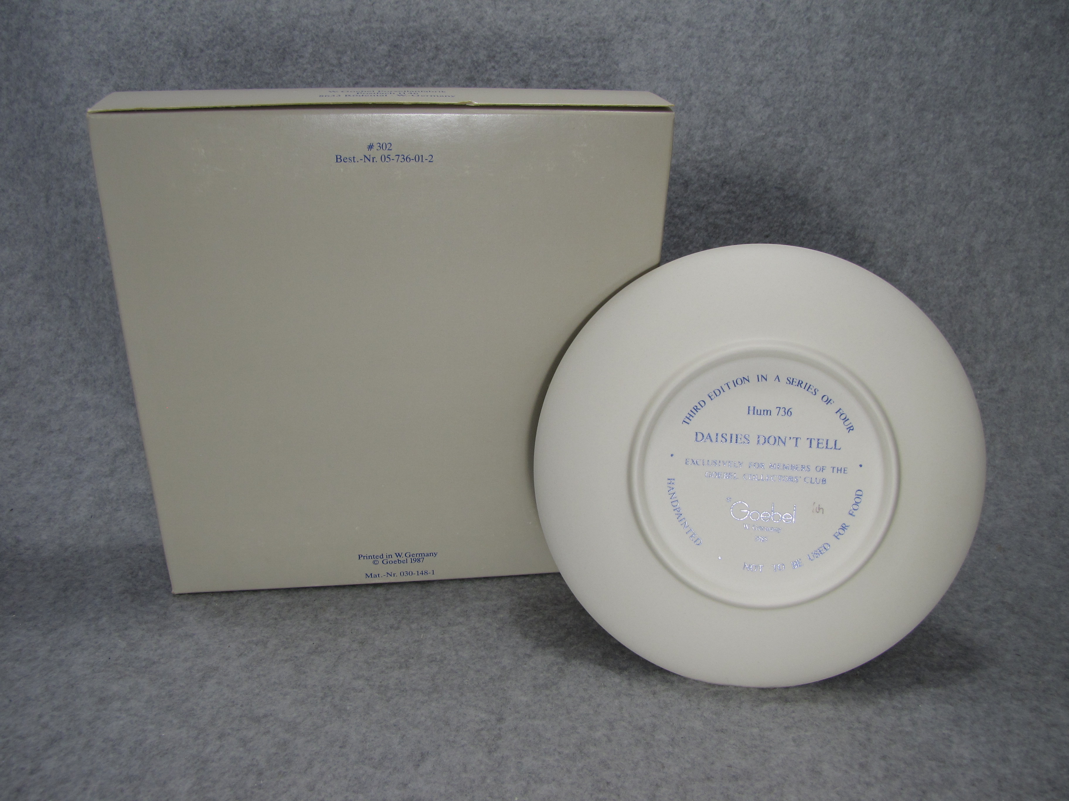 January 16, 2026 - 6-1/4 inches in diameter. The following is imprinted in blue on bottom of plate: THIRD EDITION IN A SERIES OF FOUR, Hum 736, VALENTINE GIFT, EXCLUSIVELY FOR MEMBERS OF THE GOEBEL COLLECTORS' CLUB, Goebel TMK 6 trademark, HANDPAINTED, NOT TO BE USED FOR FOOD. Artist hand initialed in black ink.