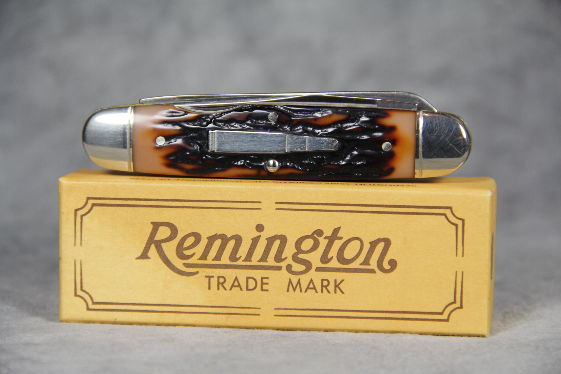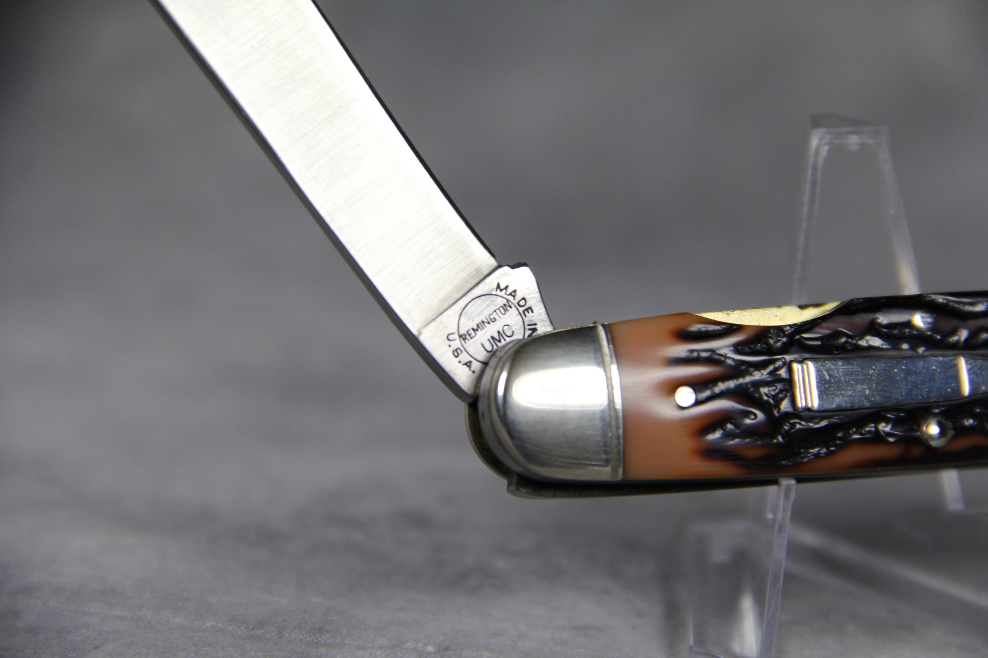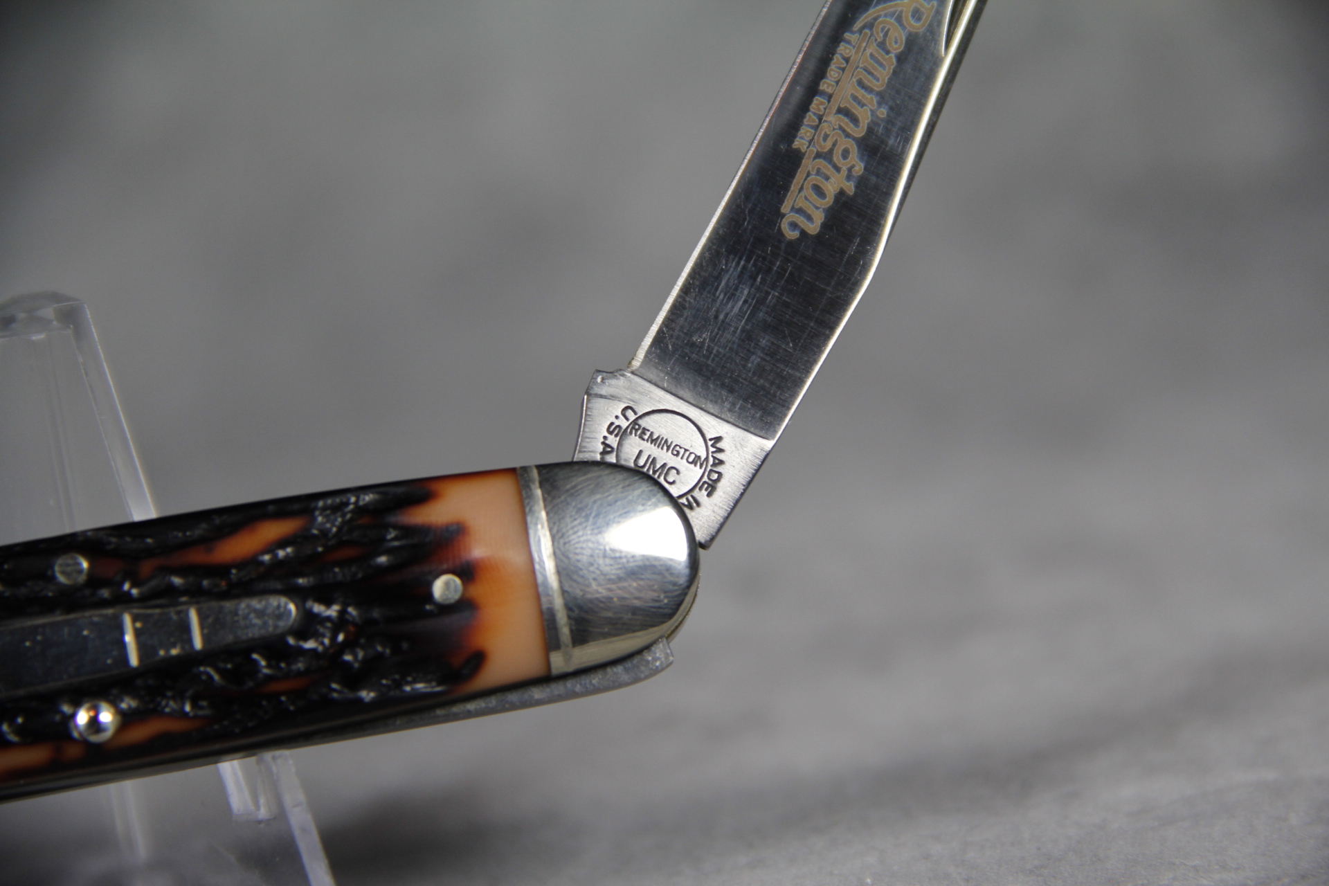 November 06, 2025 - 2-Blade Muskrat. 3-3/4 inches closed. 6-1/2 inches open. Made in USA. 'Remington UMC Made in USA' and 'R4466' and '1988' tang stamp. Bullet shield. Stainless steel blades. Delrin handle. Brass liner. With original box and paperwork.