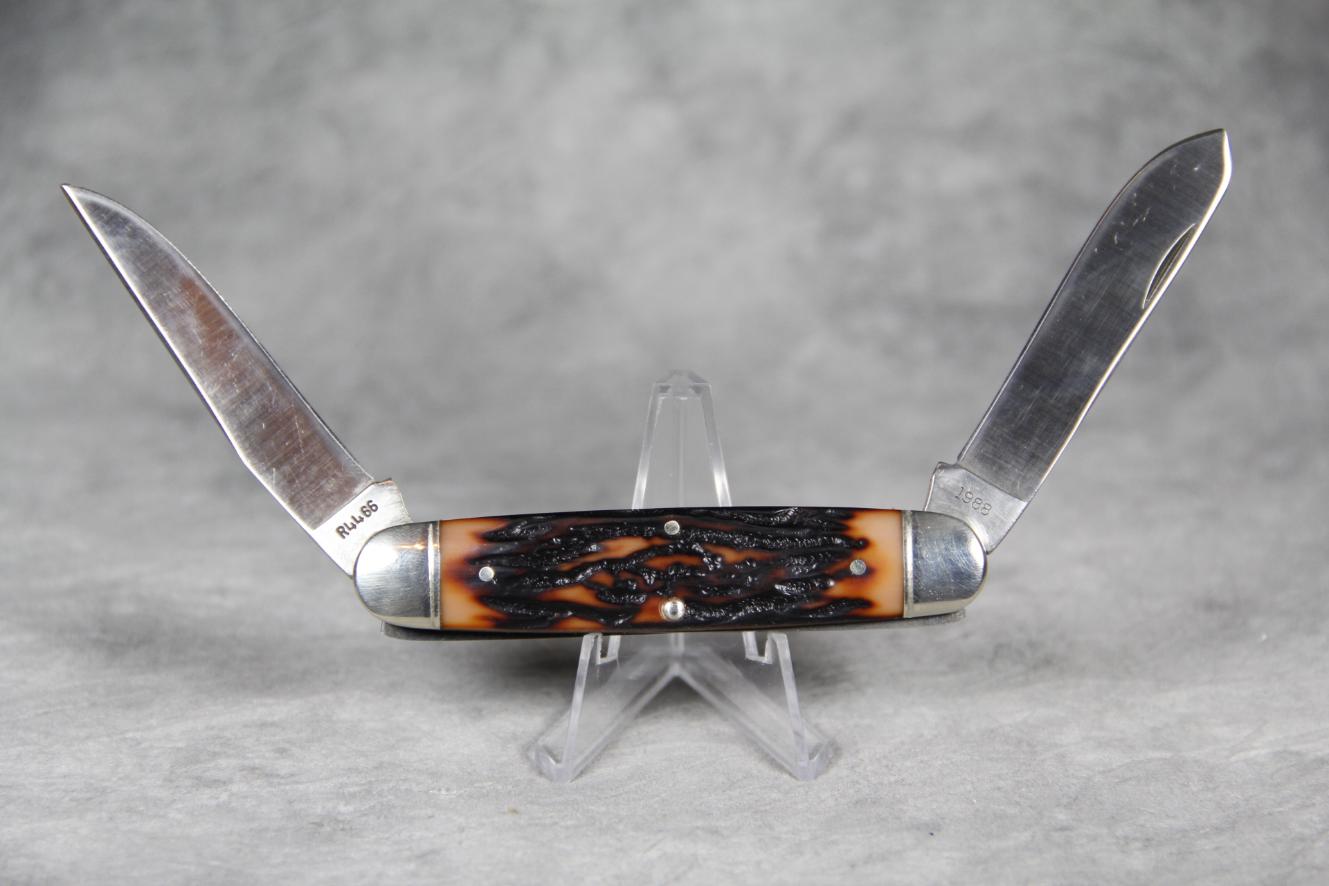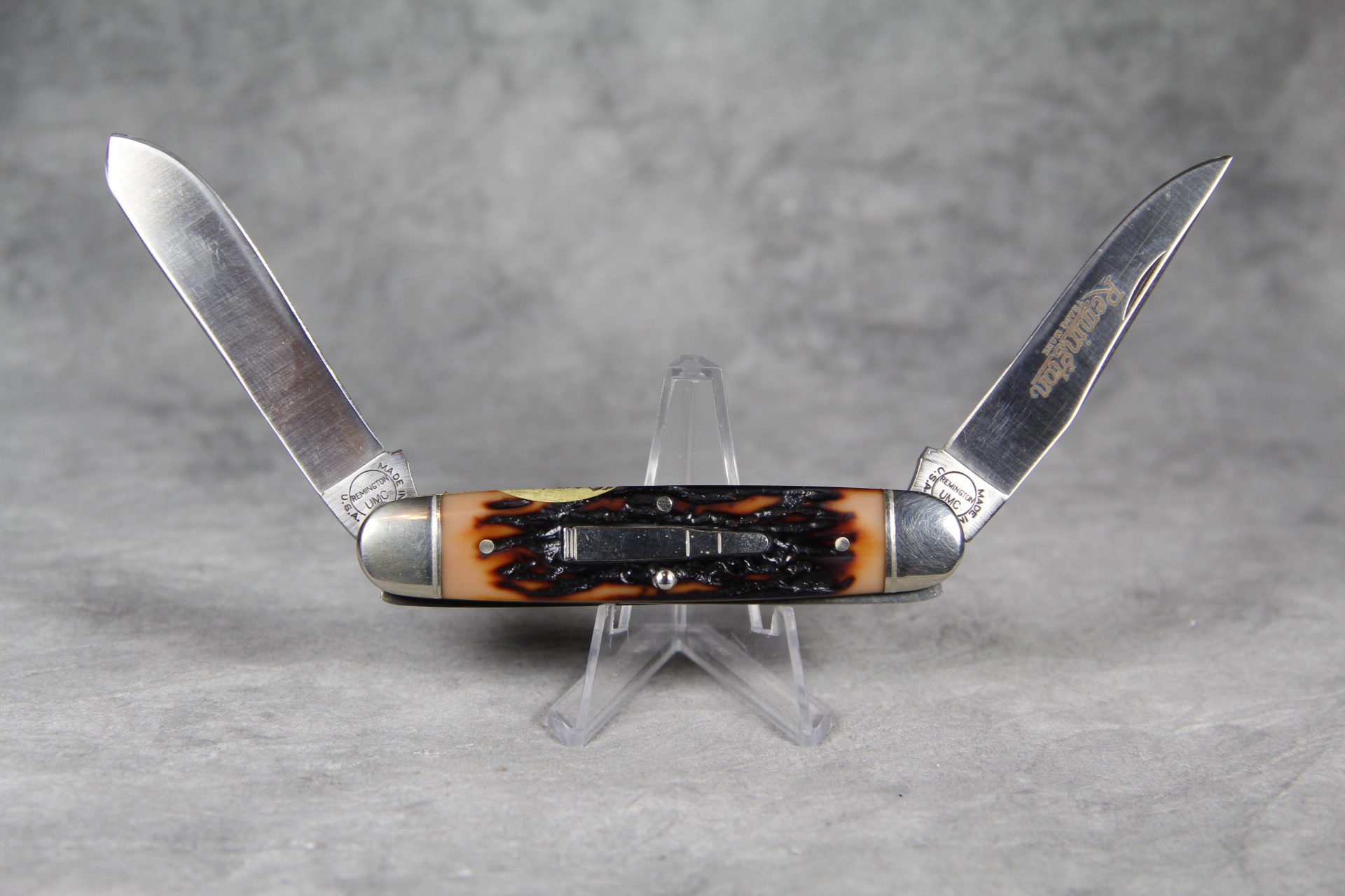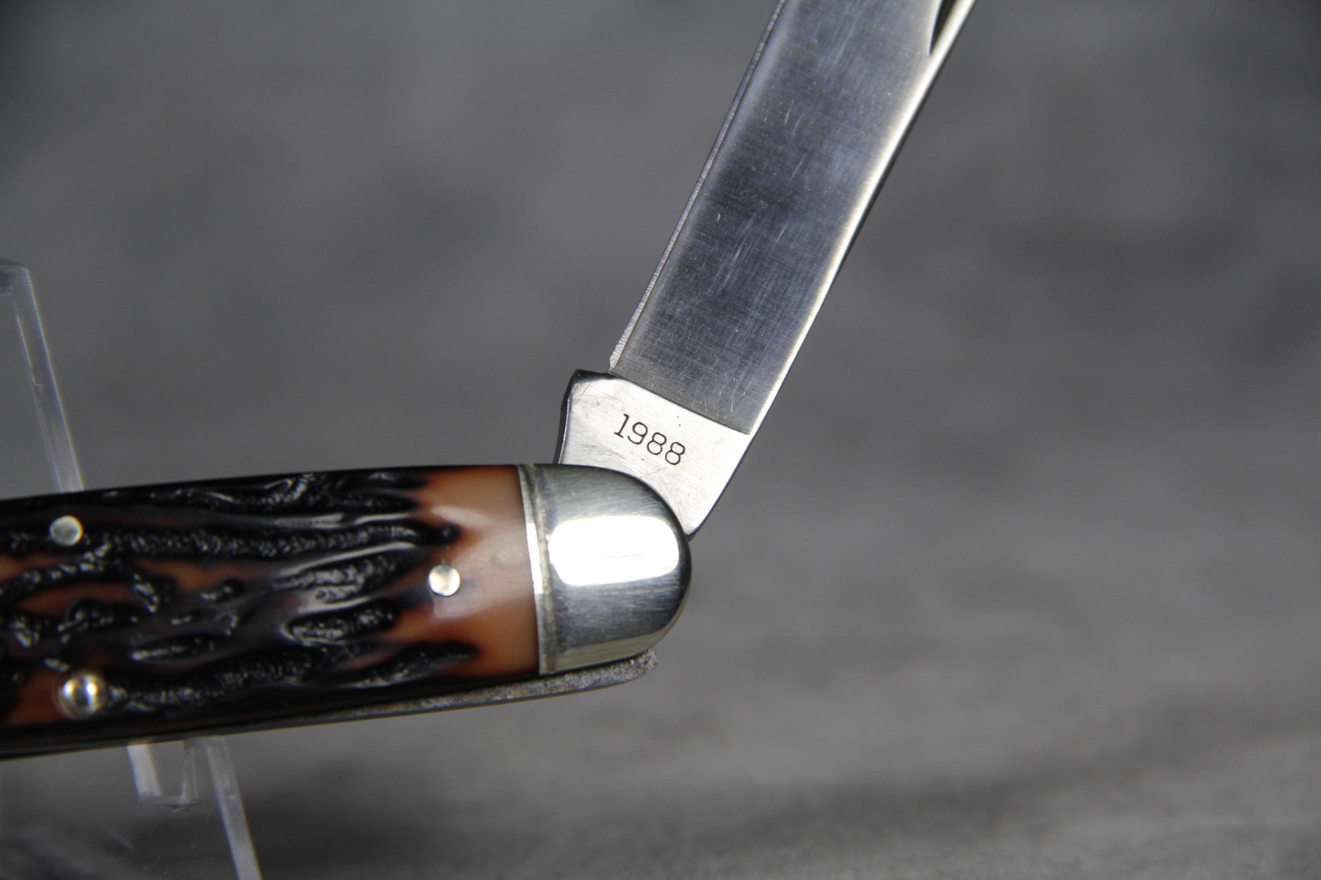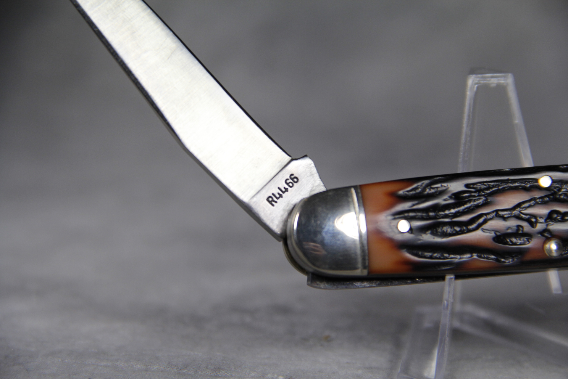 November 06, 2025 - 2-Blade Muskrat. 3-3/4 inches closed. 6-1/2 inches open. Made in USA. 'Remington UMC Made in USA' and 'R4466' and '1988' tang stamp. Bullet shield. Stainless steel blades. Delrin handle. Brass liner. With original box and paperwork.