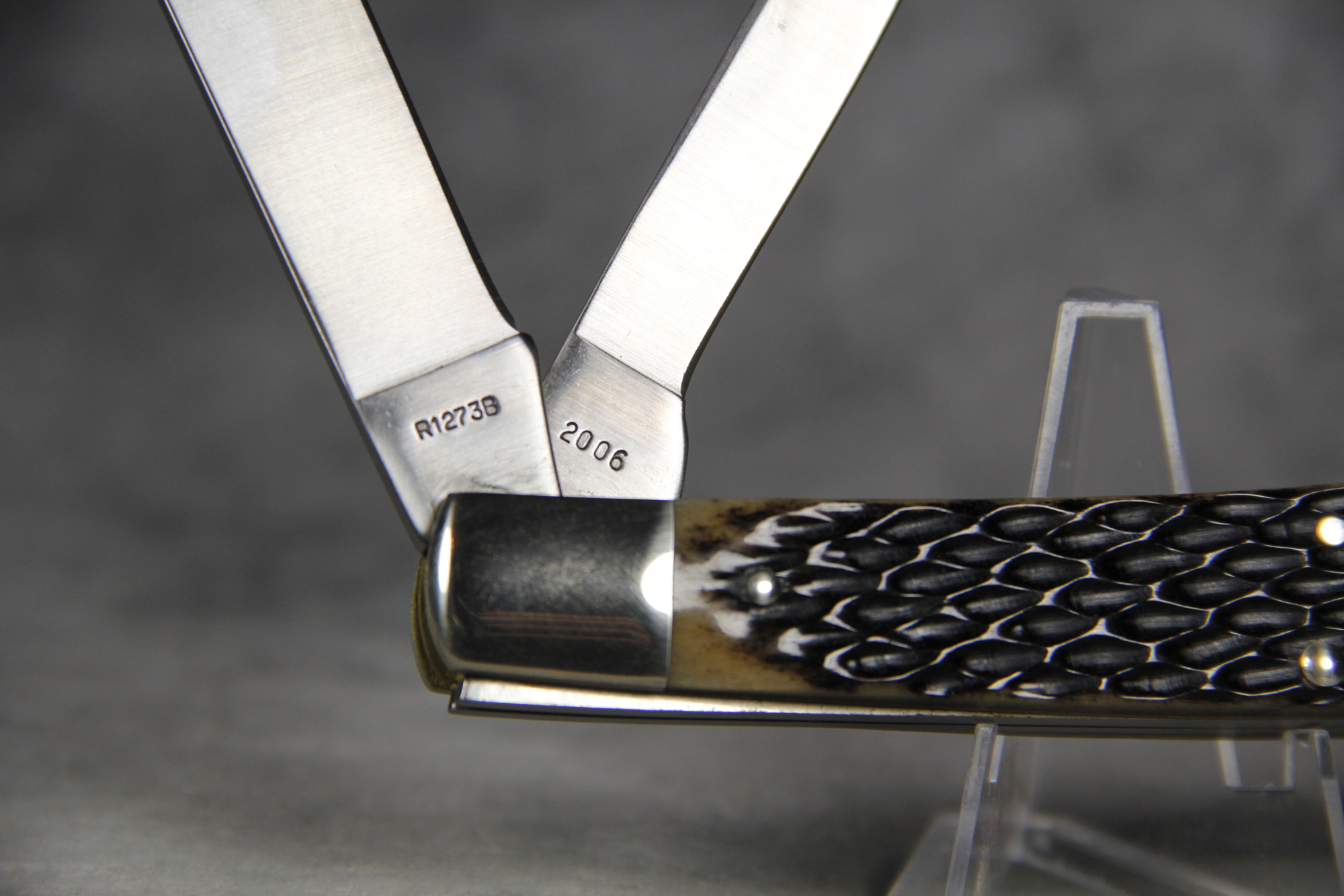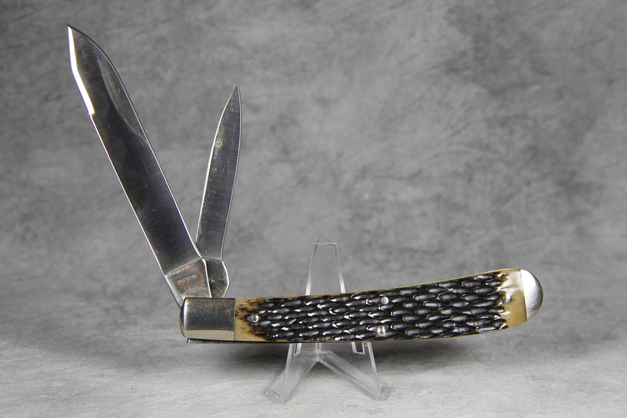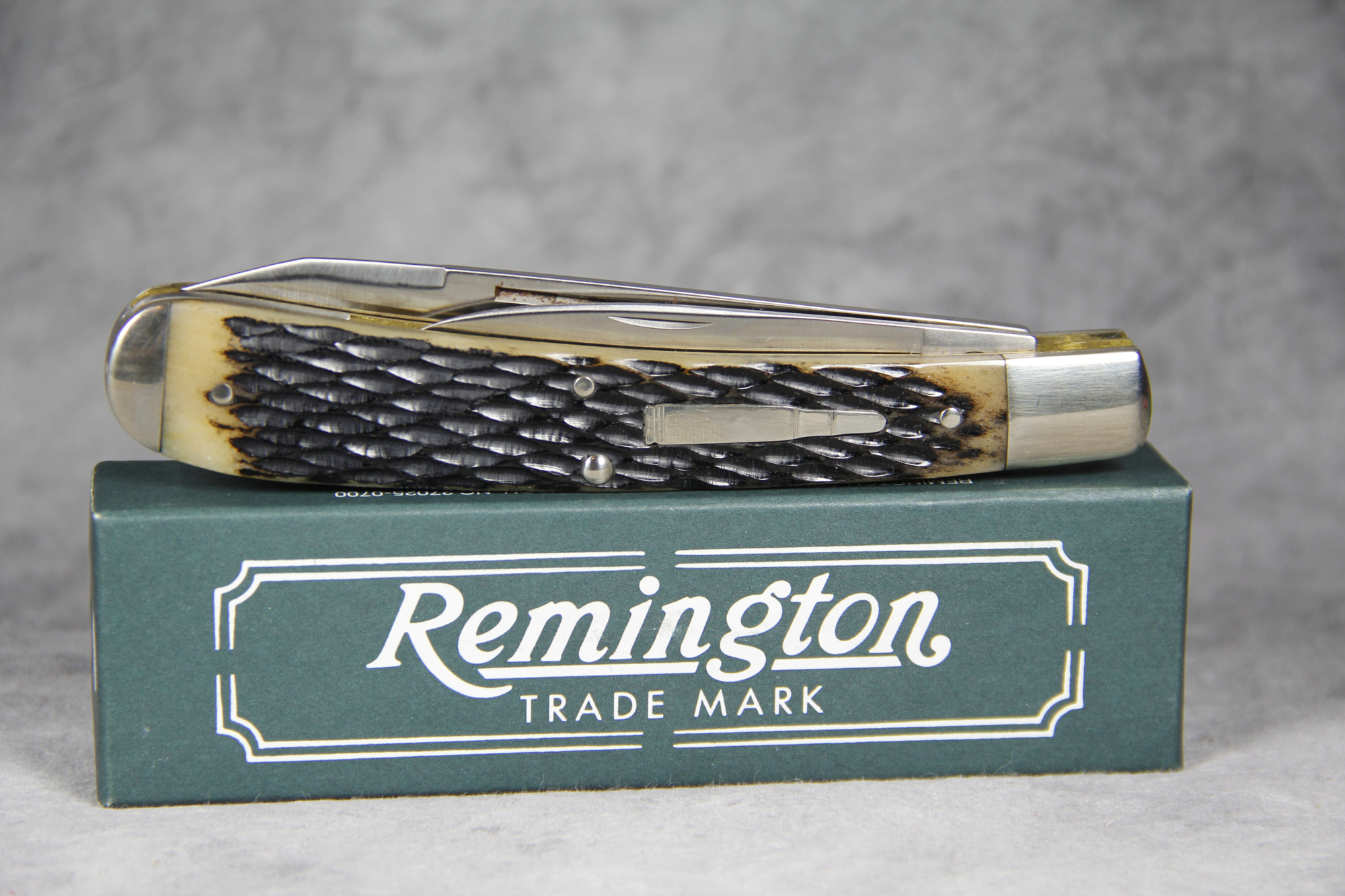 November 03, 2025 - 2-Blade Limited Edition "Trail Boss" Trapper Bullet Knife. 5-1/4 inches closed. 9-1/2 inches open. Made in USA. 'Remington UMC Made in USA', 'R1273B', and '2006' tang stamps. Bullet shield. Stainless Steel blades. Jigged Bone handle. Nickel Silver bolsters. Brass liner. With original box and paperwork.