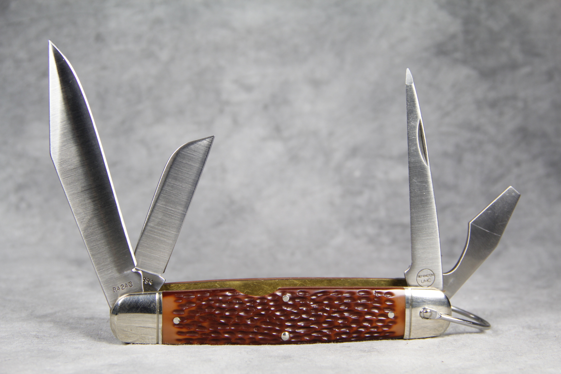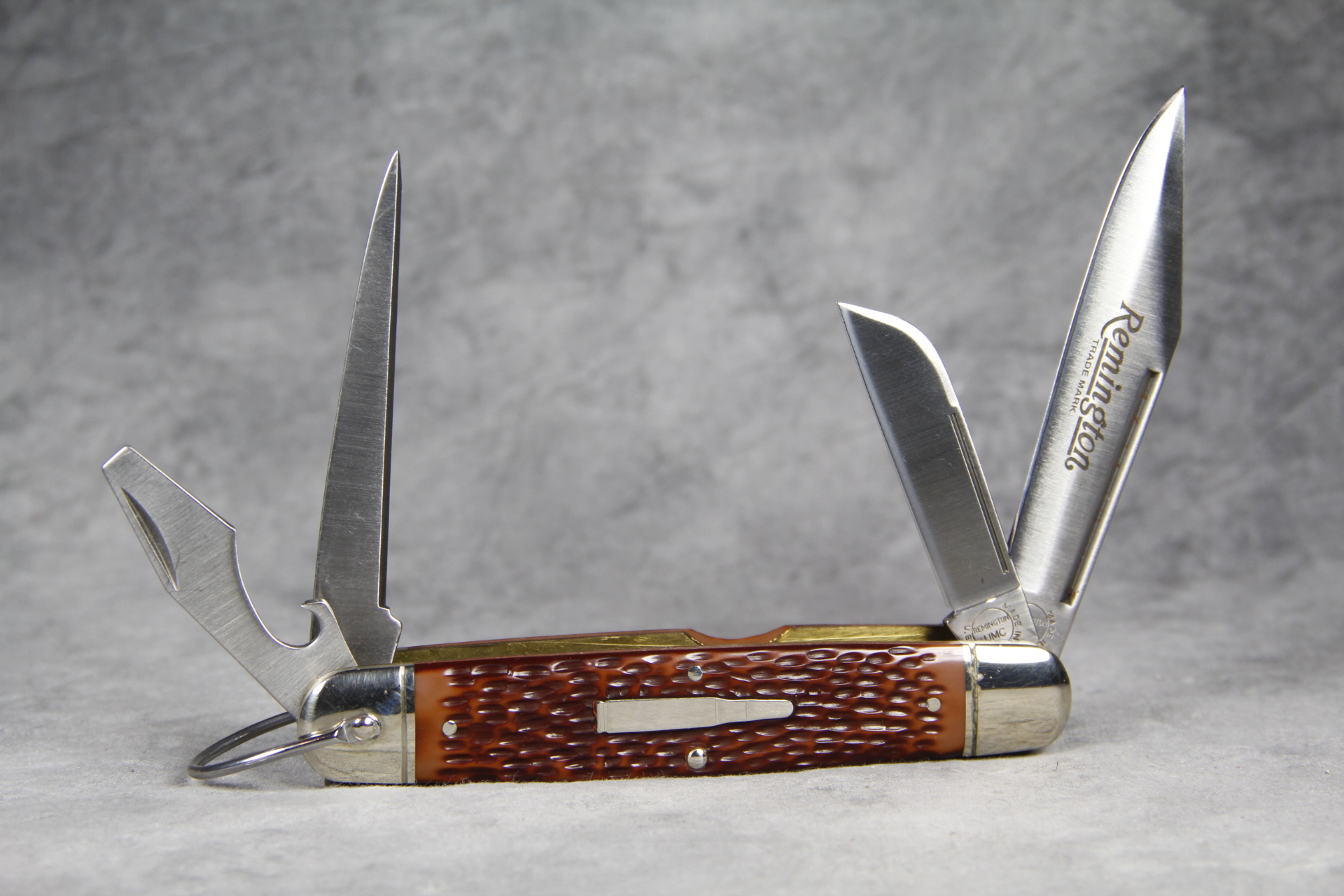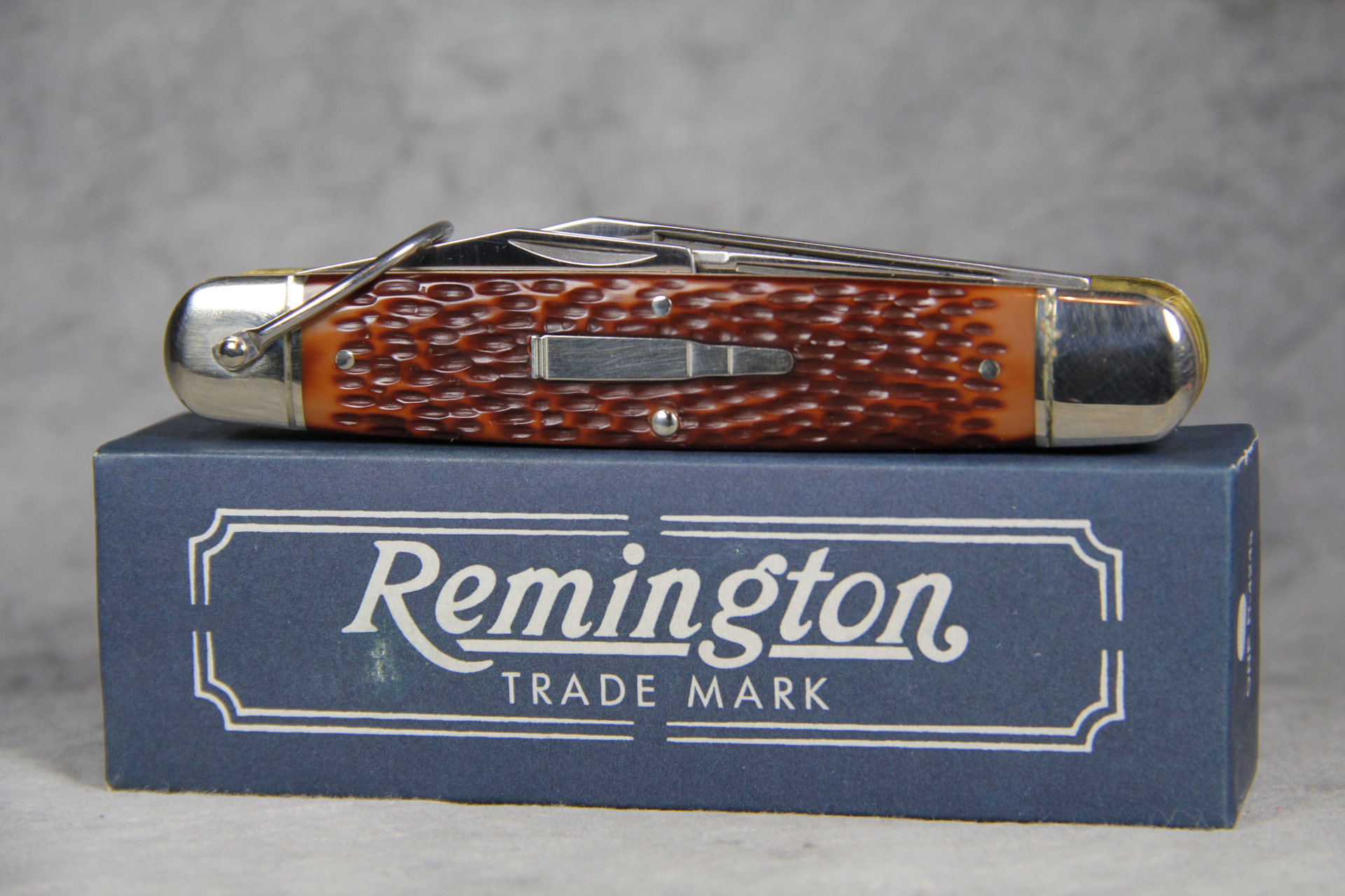 January 08, 2026 - 4-Blade Limited Edition Camp Bullet Knife. Serial # 18553. 4-3/4 inches closed. 8-1/4 inches open. Made in USA. 'Remington UMC Made in USA', 'R4243', and '1994' tang stamps. Bullet shield. Stainless Steel blades. Brown Delrin handle. Nickel Silver bolsters. Brass liner. With original box and paperwork.