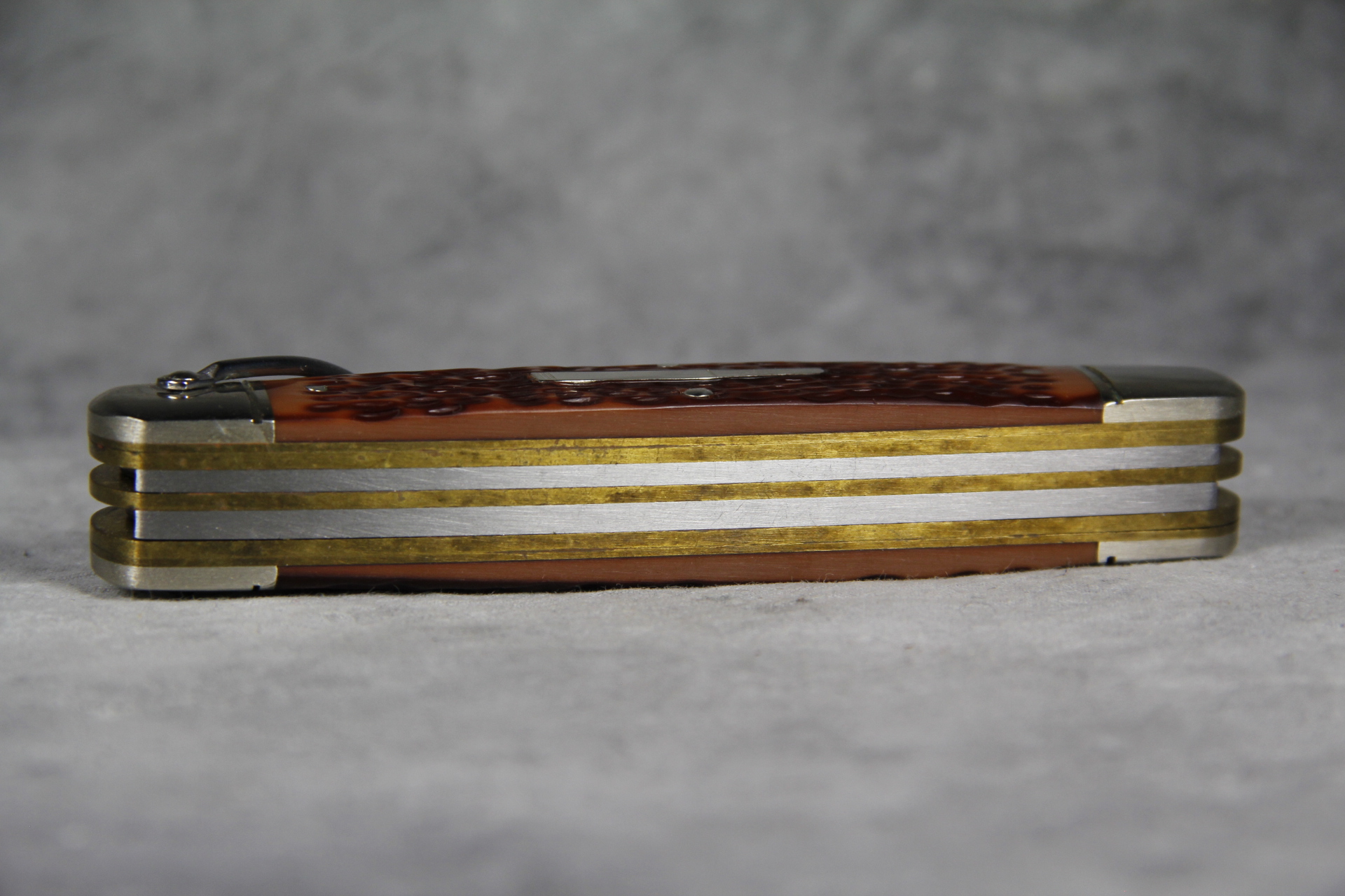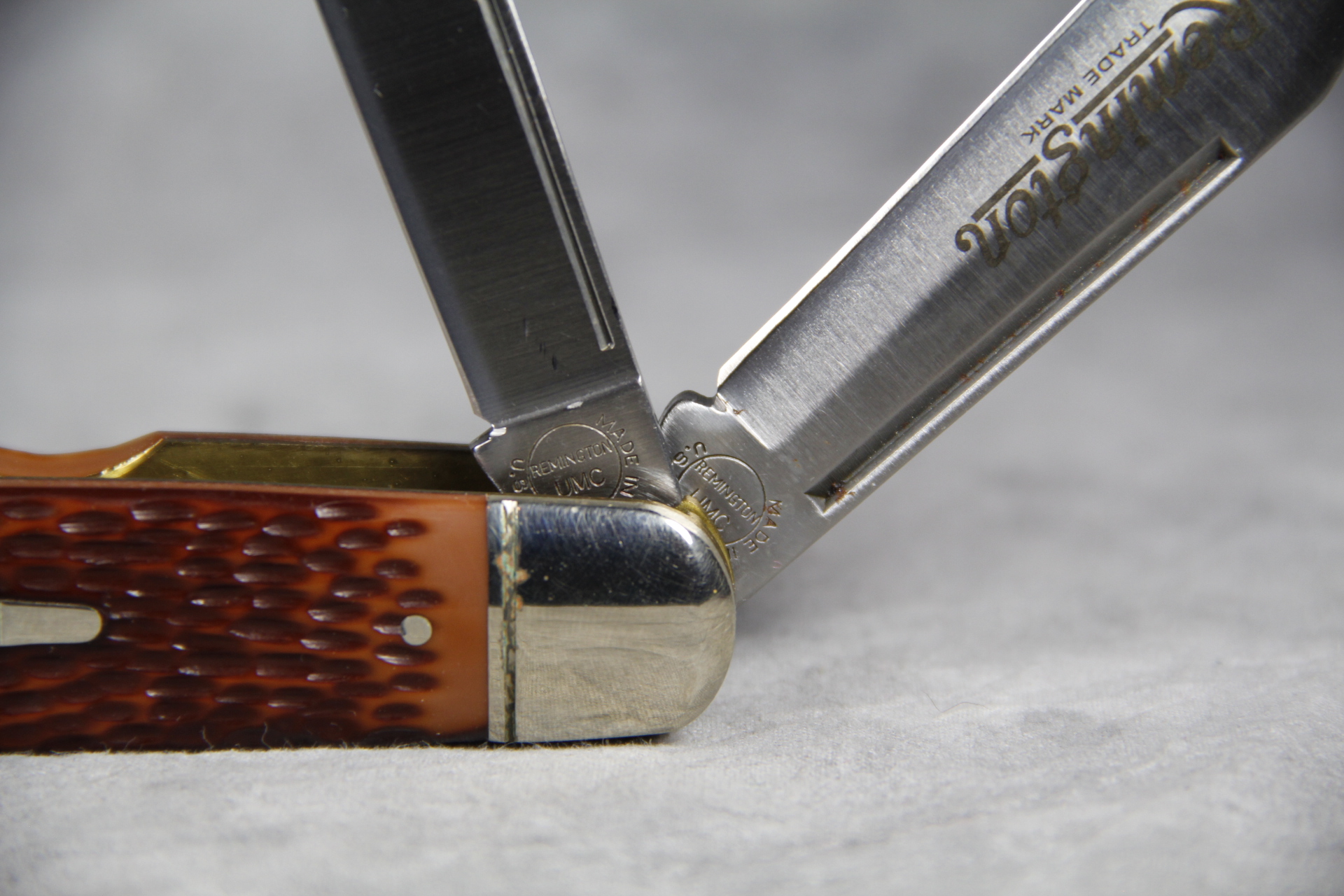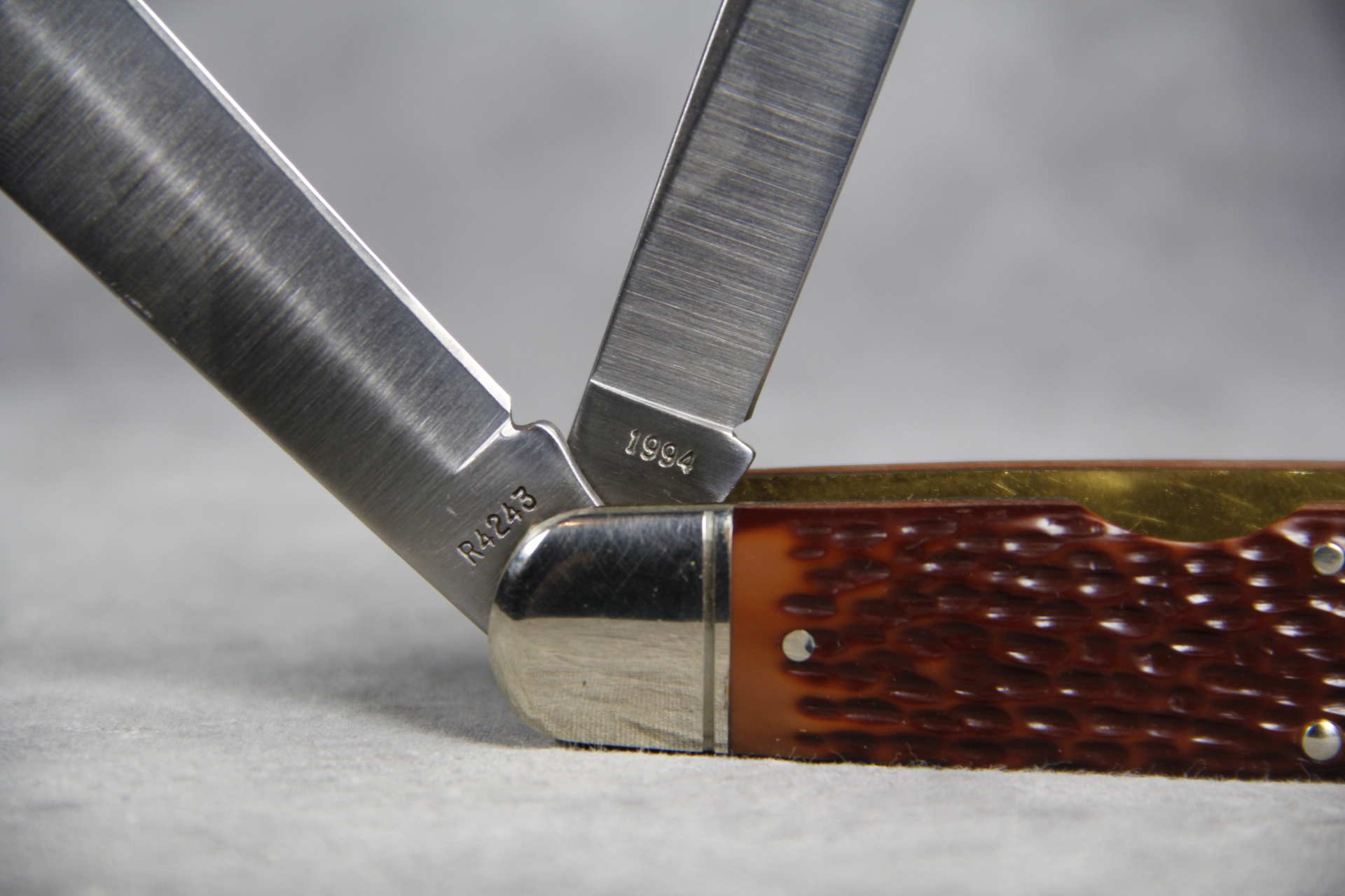 January 08, 2026 - 4-Blade Limited Edition Camp Bullet Knife. Serial # 18553. 4-3/4 inches closed. 8-1/4 inches open. Made in USA. 'Remington UMC Made in USA', 'R4243', and '1994' tang stamps. Bullet shield. Stainless Steel blades. Brown Delrin handle. Nickel Silver bolsters. Brass liner. With original box and paperwork.