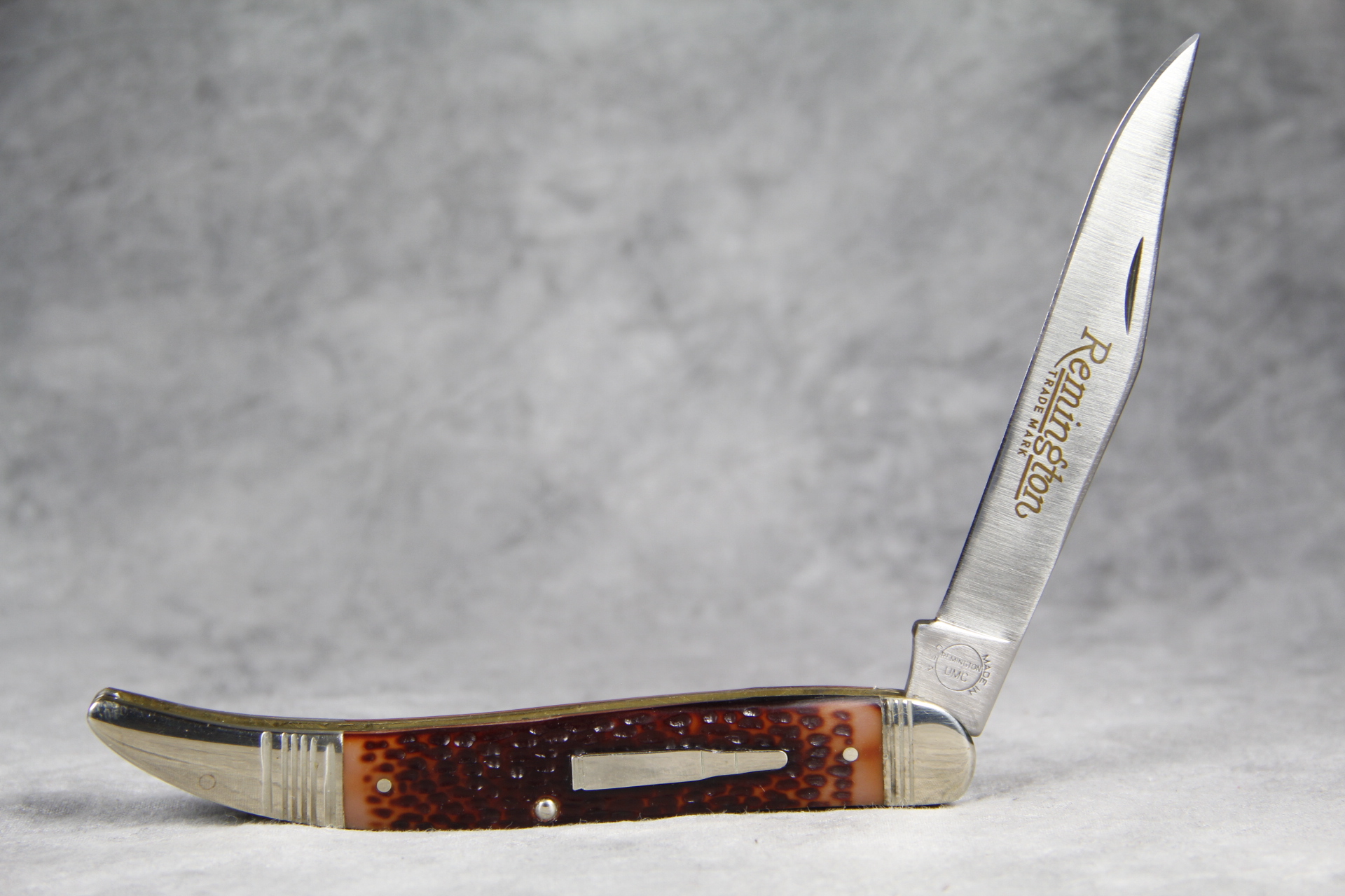 December 07, 2025 - Single Blade Special Edition Fisherman Bullet Knife. 5 inches closed. 8-7/8 inches open. Made in USA. 'Remington UMC Made in USA' and 'R1613 1987' tang stamps. Bullet shield. Stainless Steel blades. Delrin handle. Nickel Silver bolsters. Brass liner. With original box and paperwork.
