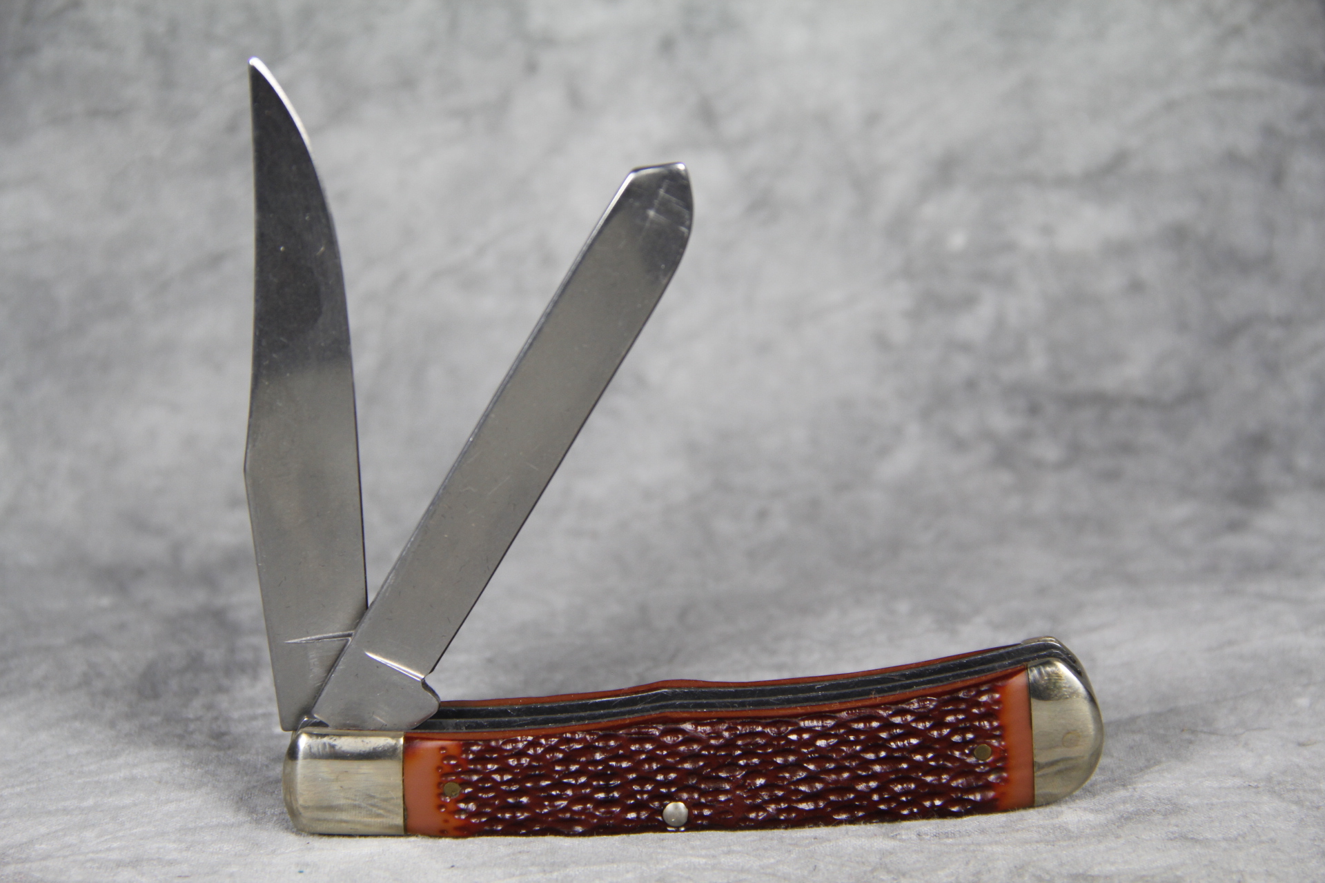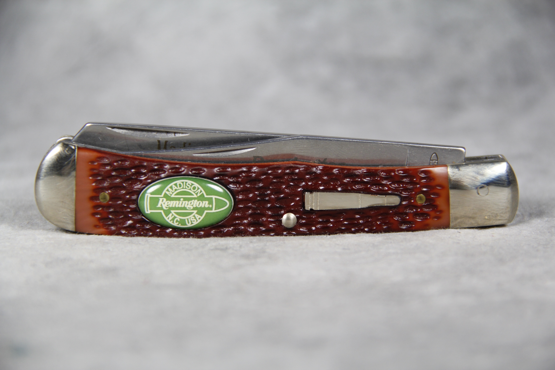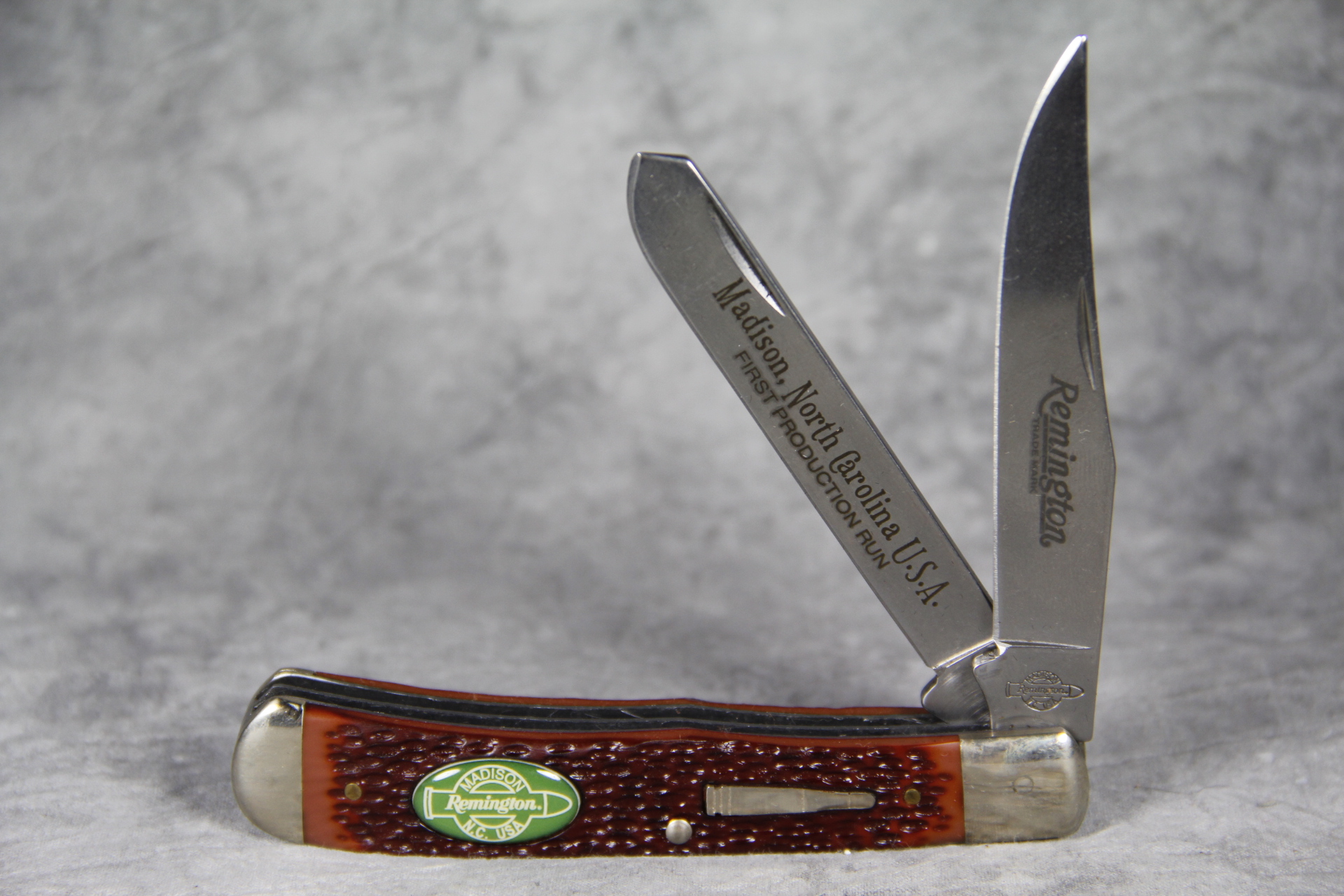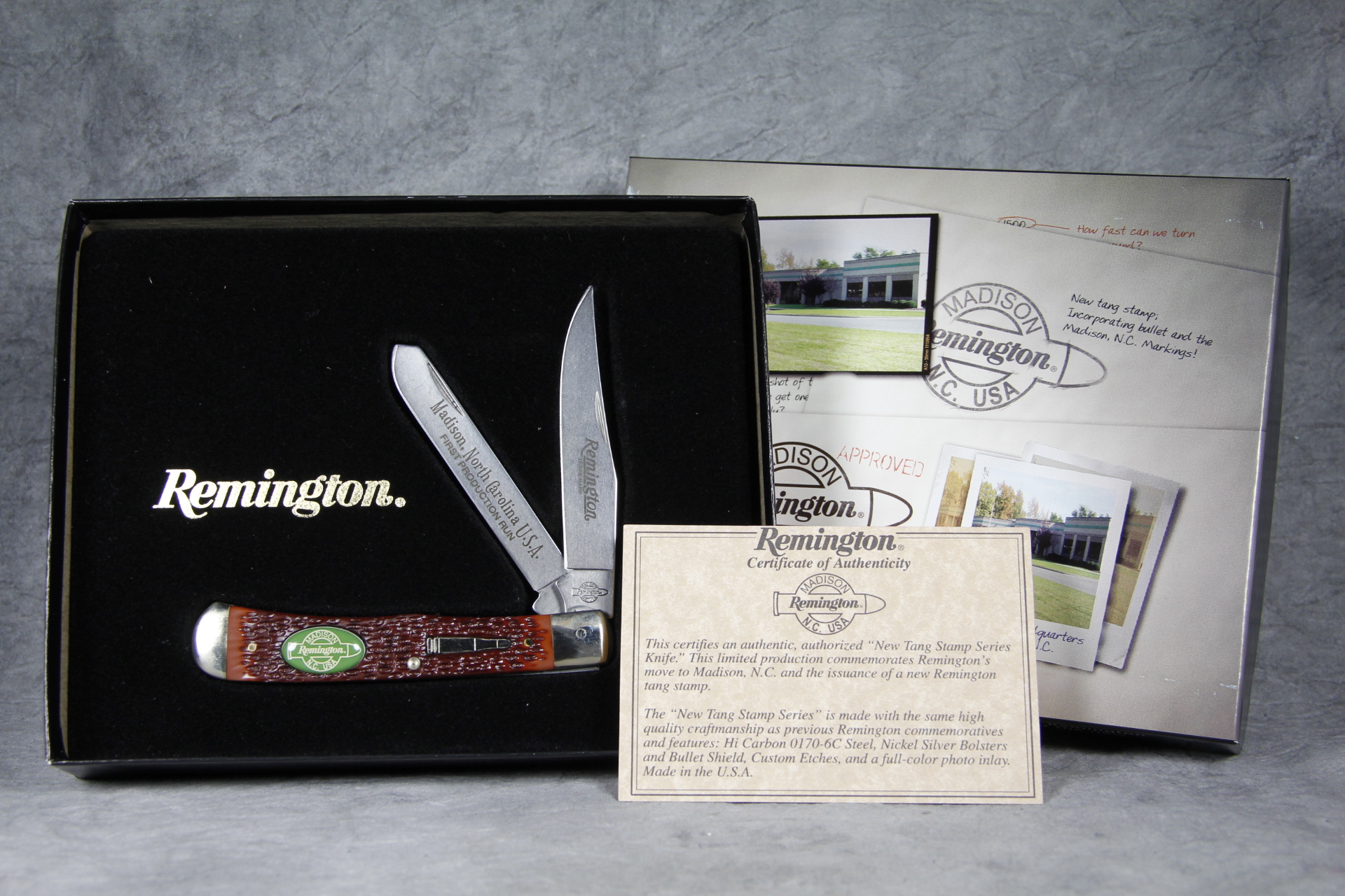 November 14, 2025 - 2-Blade Bullet Trapper Knife. Serial # 18305. Made to commemorate and celebrate the opening of the new Remington headquarters in Madison, N.C. USA. 4-1/8 inches closed. 7-1/2 inches open. Made in USA. 'Remington Madison N.C. USA' tang stamp. Bullet shield. Full-color photo inlay on handle. High Carbon 0170-6C Steel blades. Custom etching on blade: "Madison, North Carolina U.S.A. FIRST PRODUCTION RUN". Delrin handle. Nickel Silver bolsters. Steel liner. With original box and certificate of authenticity.