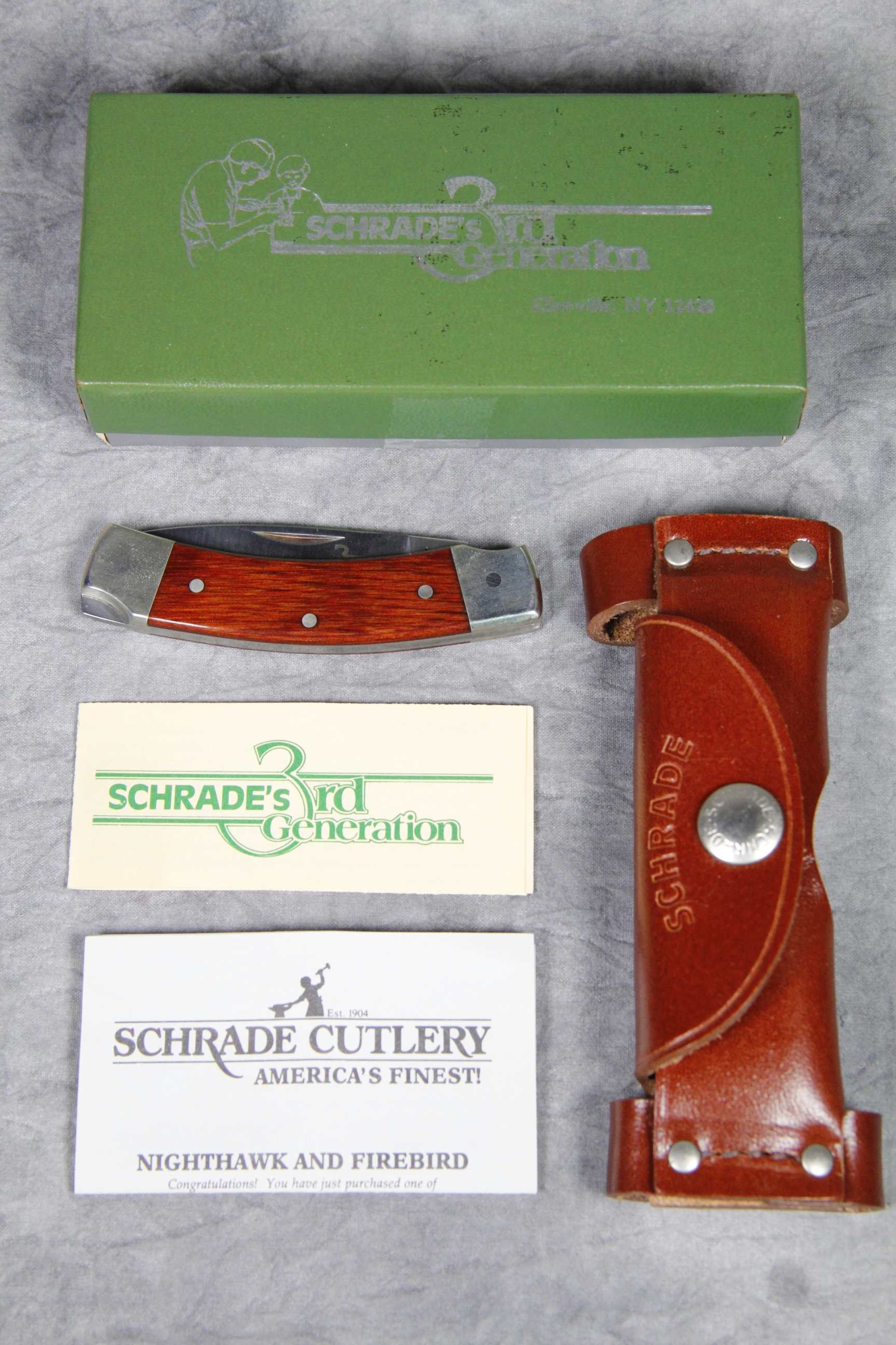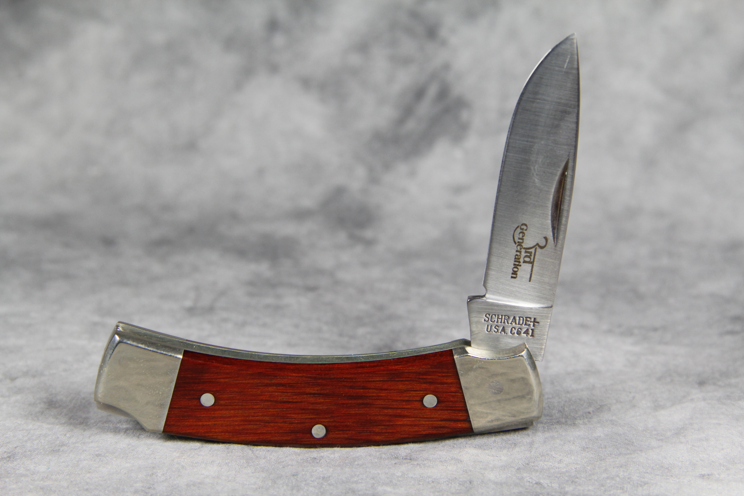 November 03, 2025 - Single Blade Folding Lockback Knife. 3-3/8 inches closed. 5-3/4 inches open. Made in USA. 'Schrade+ USA C641' tang stamp. Stainless Steel blade etched with '3rd Generation'. Cocobolo handle. Nickel Silver bolsters. Nickel Silver liner. With original box, leather sheath, and paperwork.