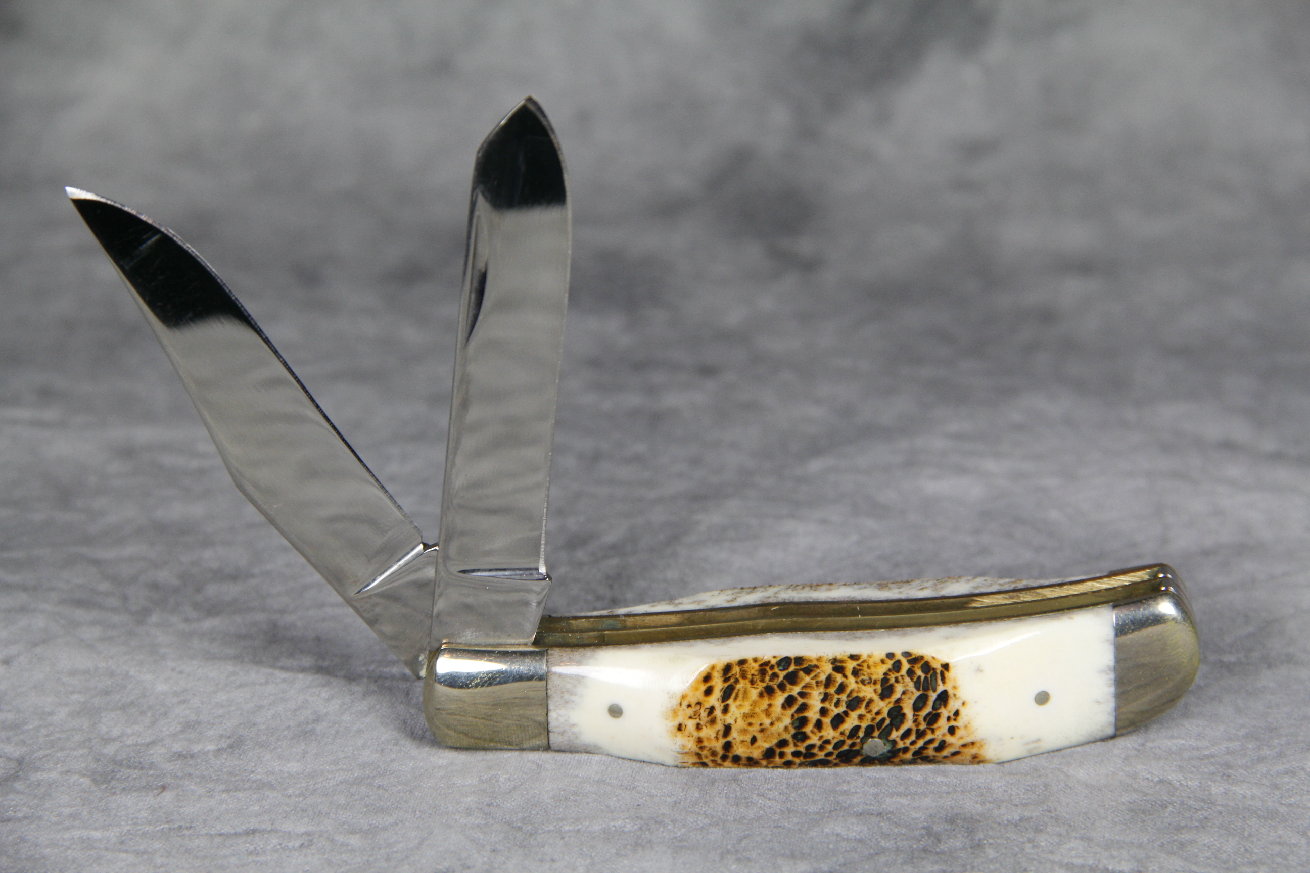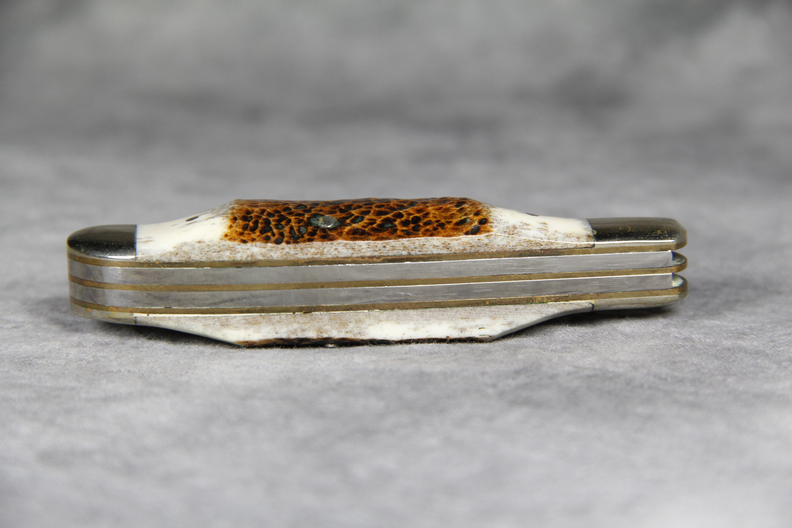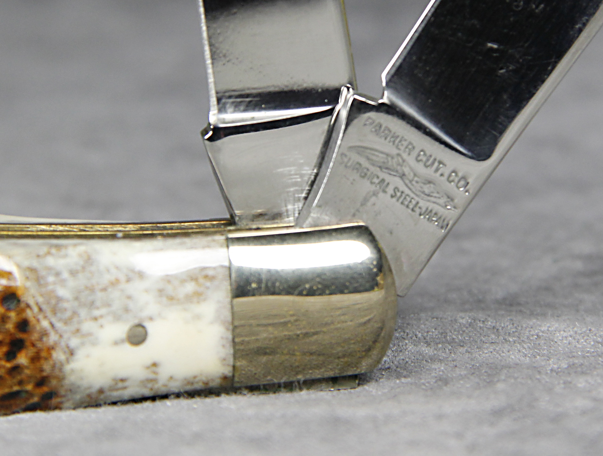 December 22, 2025 - 3-3/8 inches closed. 5-7/8 inches open. Made in USA. 'Parker Cut. Co.', Eagle Logo, and 'Surgical Steel - Japan' tang stamps. Surgical Steel blades. Stag handle. Nickel Silver bolsters. Brass liner. With box.