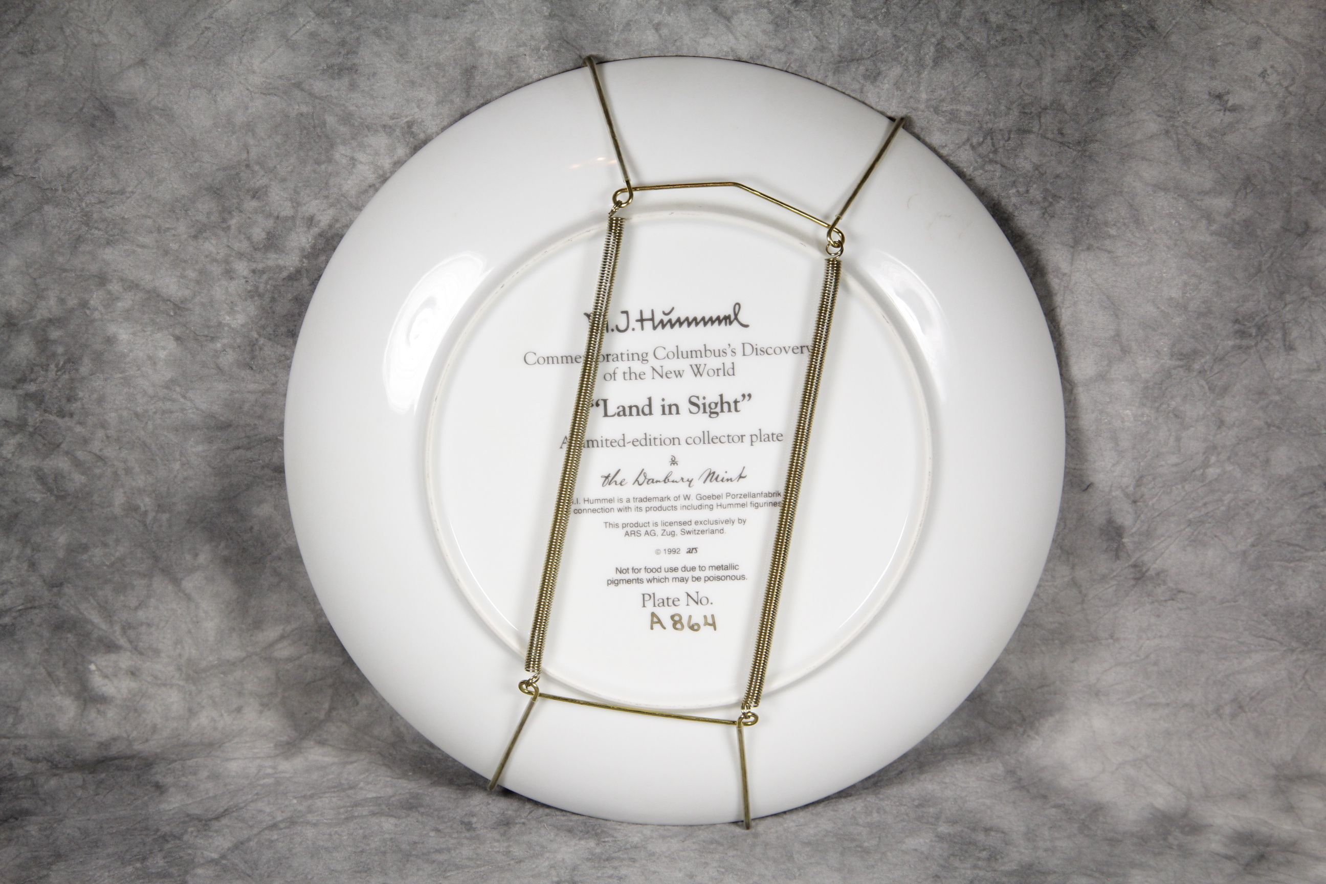 January 16, 2026 - 10-1/4 inches in diameter. The following is imprinted in black on bottom of plate: 'M.I. Hummel Commemorating Columbus's Discovery of the New World "Land In Sight" limited-edition collector plate; the Danbury Mint; M.I. Hummel is a trademark of W. Goebel Porzellanfabrik in connection with its products including Hummel figurines.; This product is licensed exclusively by ARS AG, Zug, Switzerland. (c) 1992 ars; (c) ARS; Plate No. _____ is hand-written in black.
