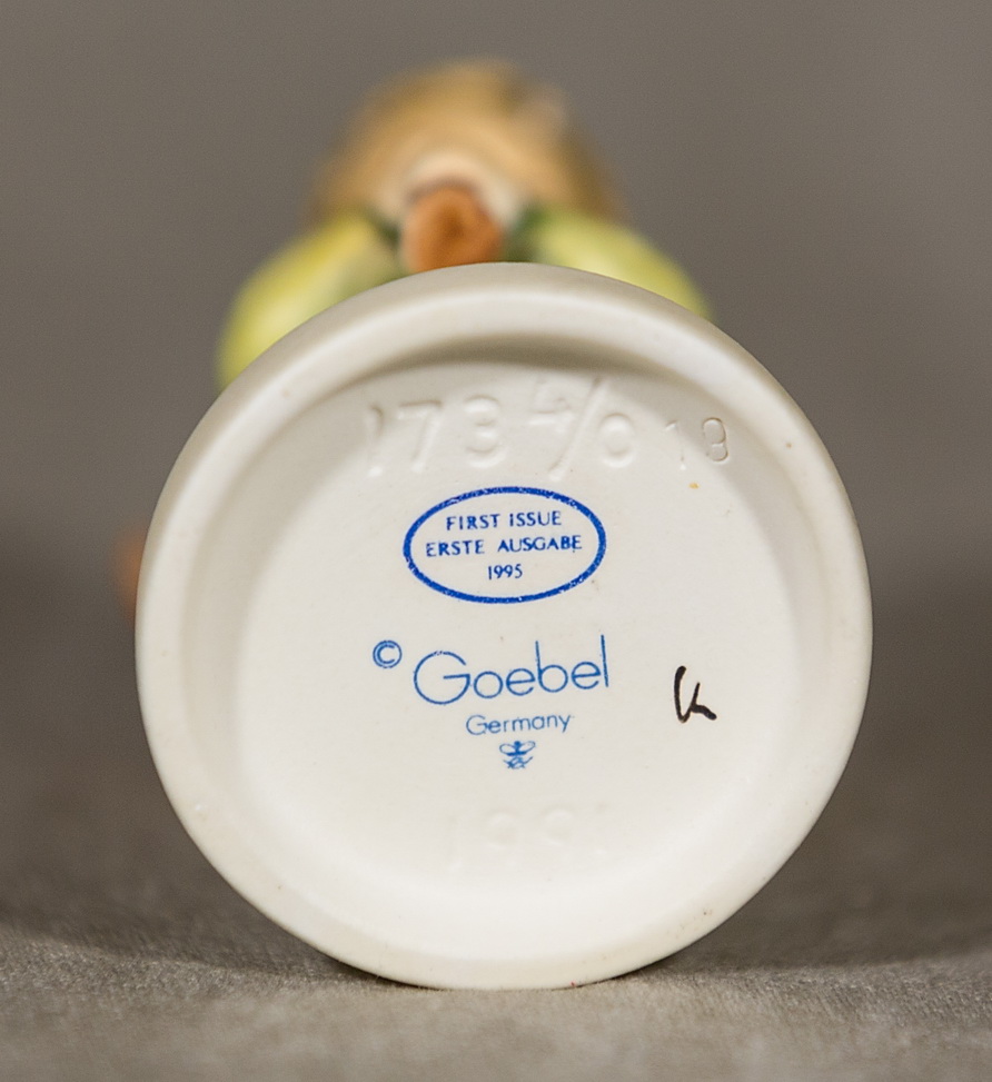 April 19, 2026 - 3-1/8 inches tall. Base is incised 173 4/0 and 1991. Goebel TMK 7 trademark and 'FIRST ISSUE / ERSTE AUSGABE / 1995' imprinted in blue on bottom of base. Painter hand-initialed in black ink on bottom of base.