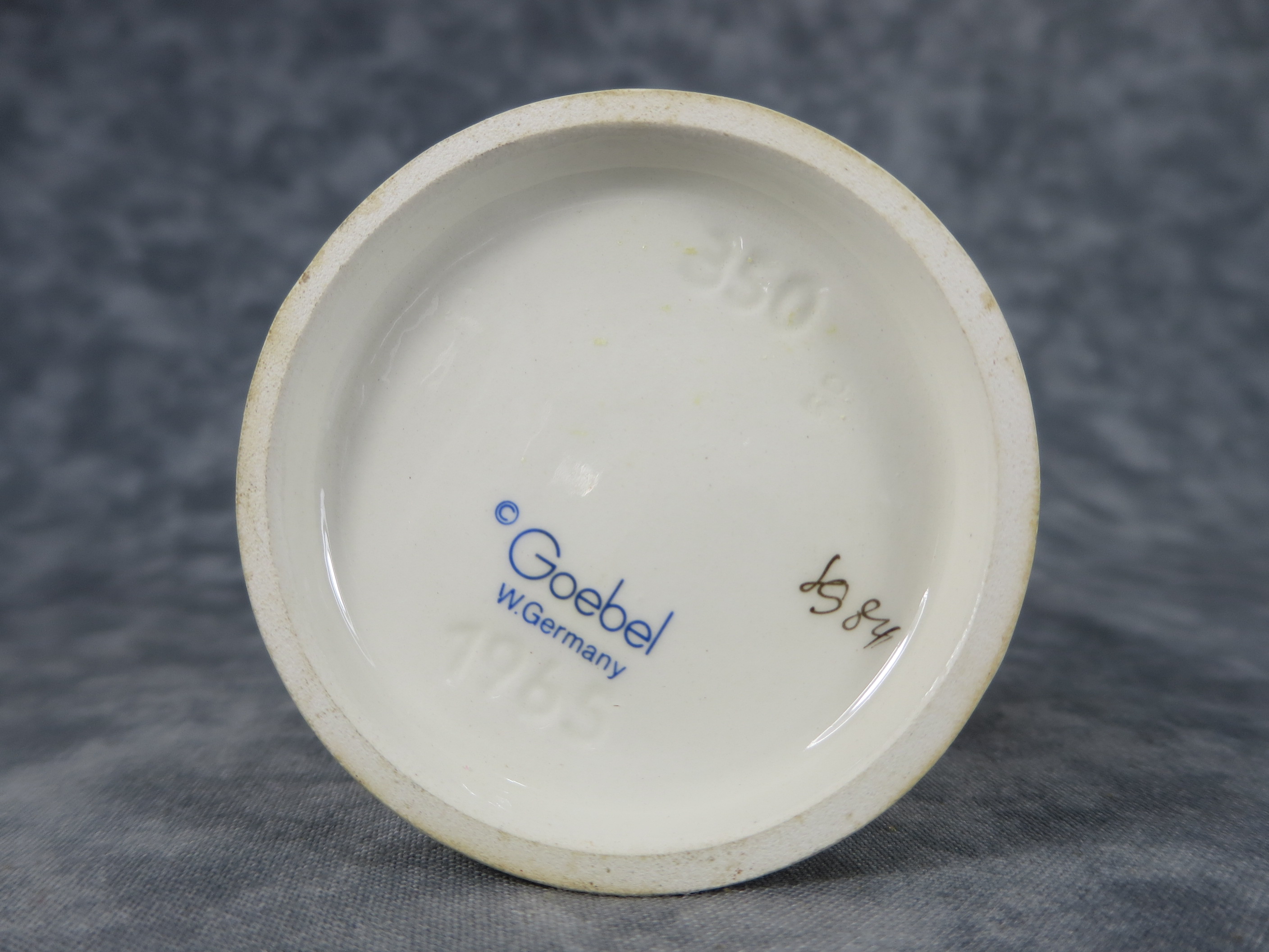 January 18, 2026 - 4 inches tall. Base is incised 350 and 1965. Goebel TMK 6 trademark imprinted in blue on bottom of base. Painter hand-initialed and dated in black ink on bottom of base.