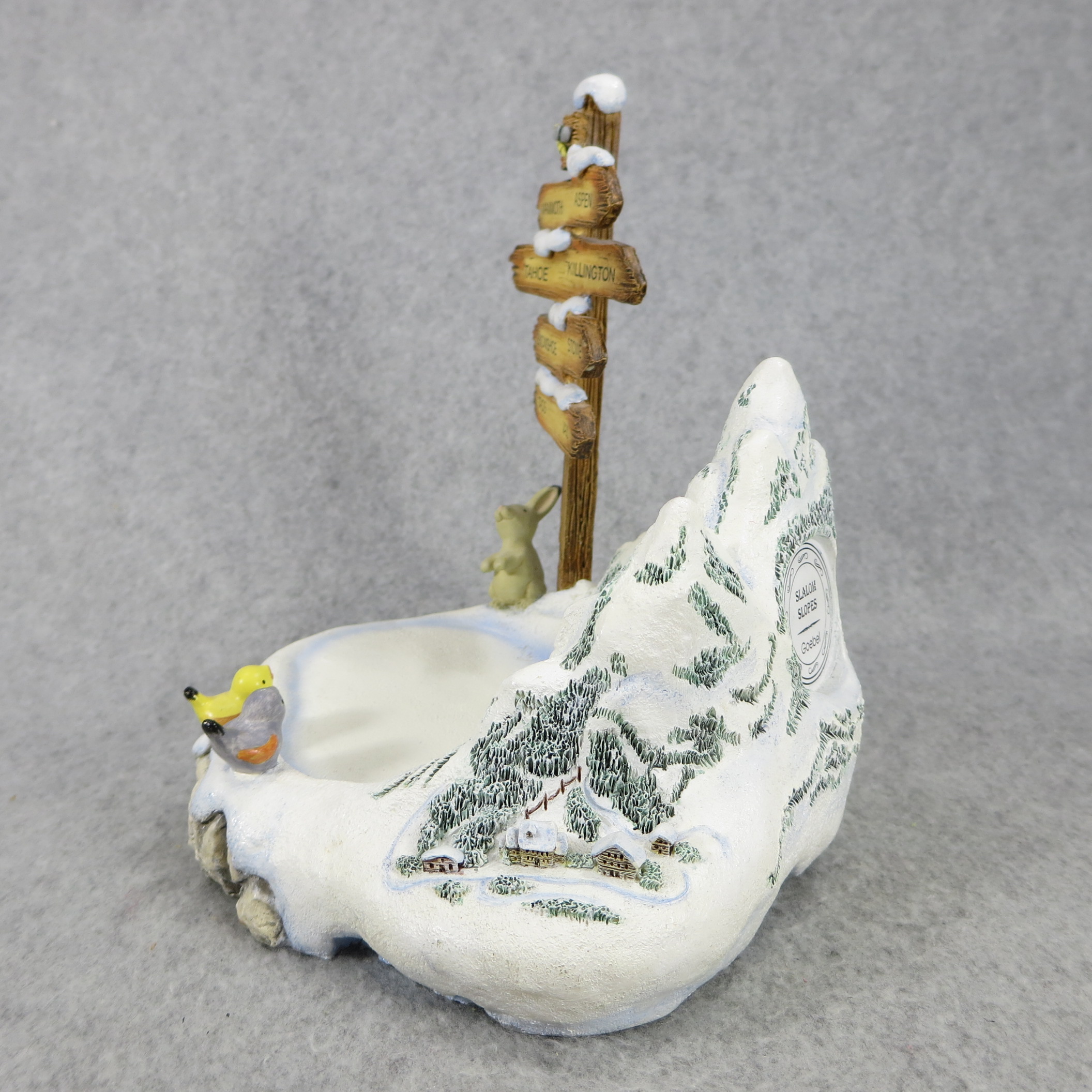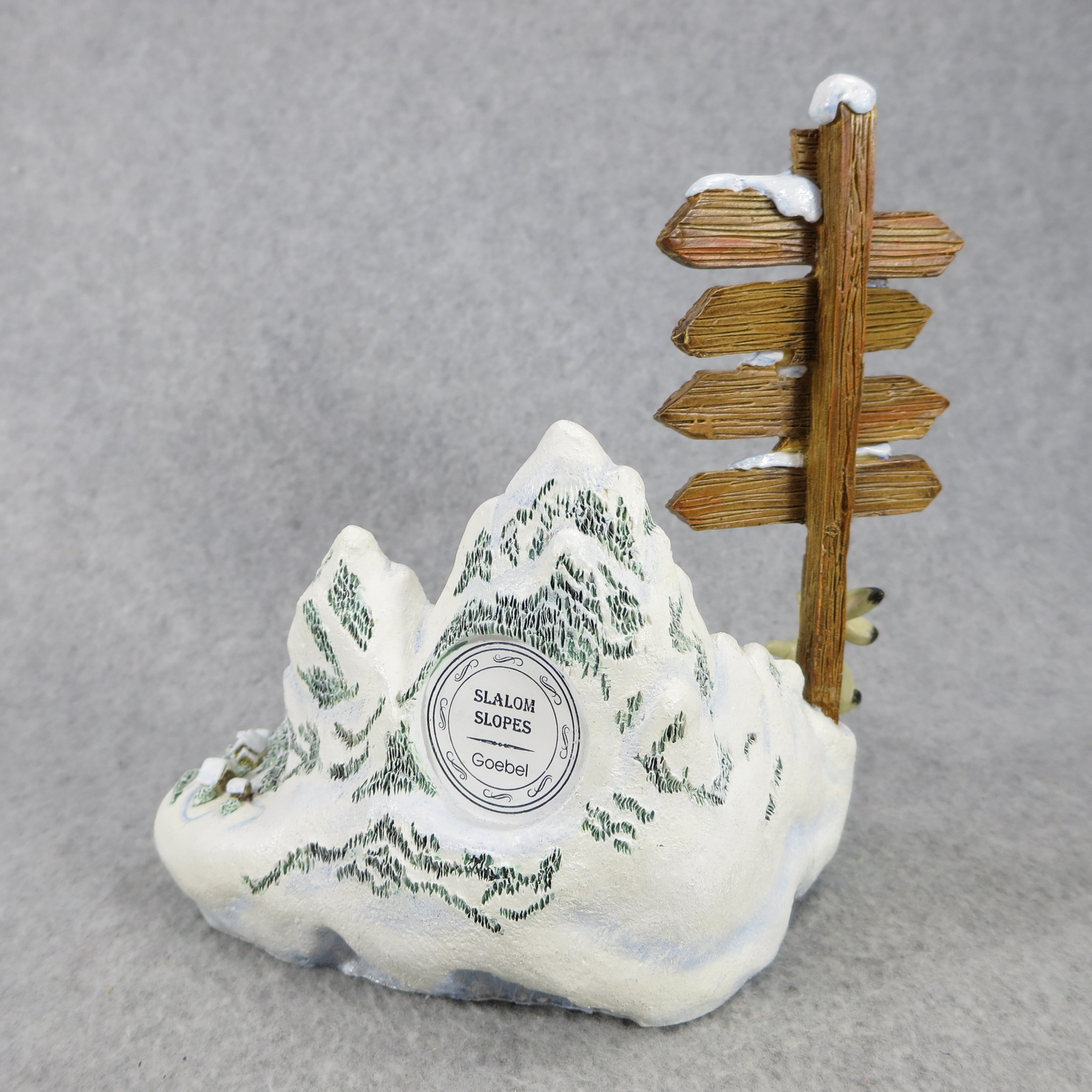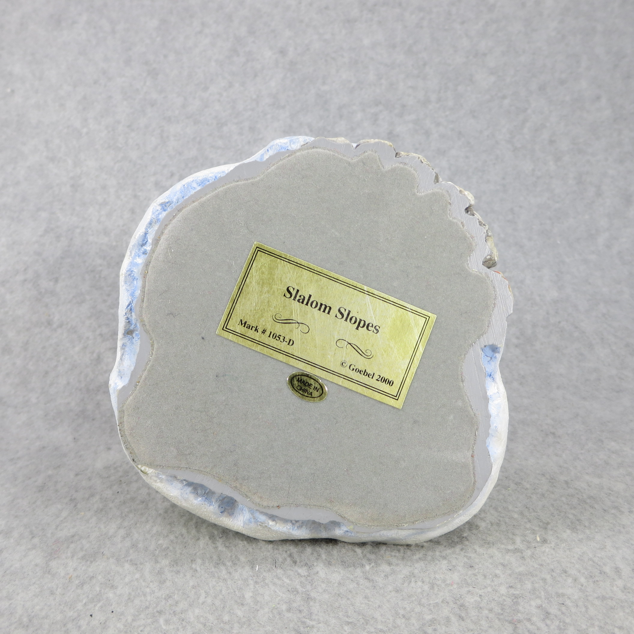 January 16, 2026 - 4-1/4 inches tall by 8-1/2 inches wide at base. Nameplate attached to bottom of base reads 'SLALOM SLOPES / Mark #1035-D / (c) Goebel 2000'. Use as base for Hummel figurine 2028 Winter Adventure.