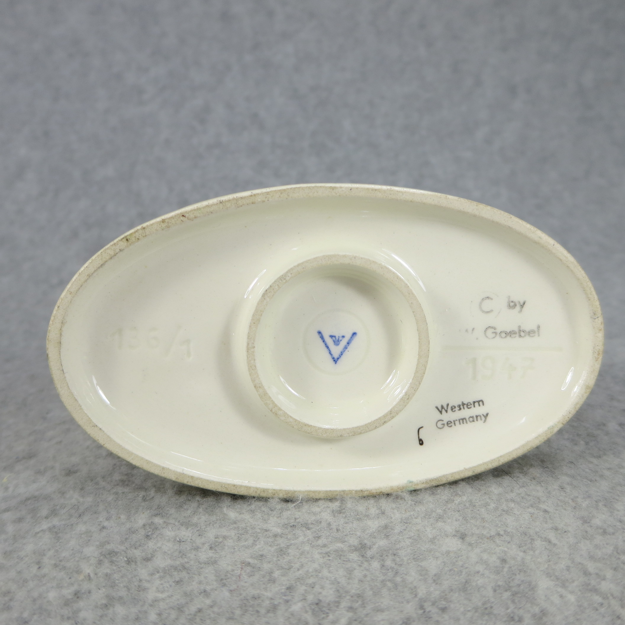 January 16, 2026 - 5-1/4 inches tall. Base is incised 136/1 and 1947. Goebel TMK 3 trademark imprinted in blue and 'Western Germany' and 'c by Goebel' stamped in black in on bottom of base. Painter hand-initialed in black ink on bottom of base.