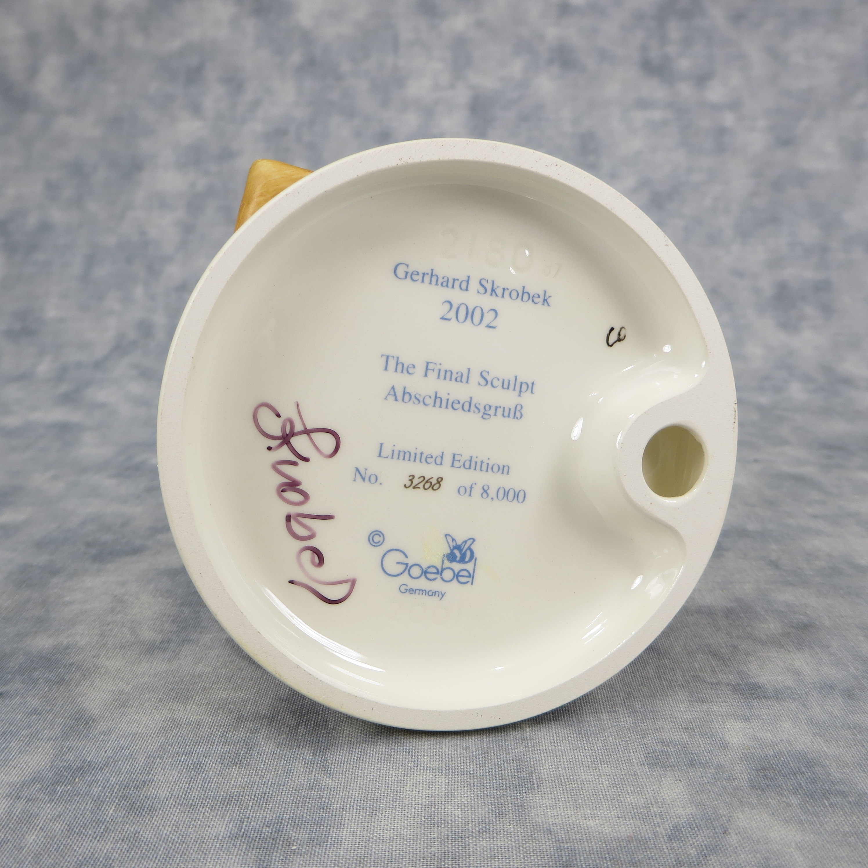 January 18, 2026 - 5-1/4 inches tall. Base is incised 2180 and 2001. Goebel TMK 8 trademark, 'Gerhard Skrobek 2002 The Final Sculpt AbschiedsgruB', and Limited Edition No. xxxx of 8,000 imprinted in blue on bottom of base. Painter hand-initialed in black ink on bottom of base. Artist signed in sharpie on bottom of base.