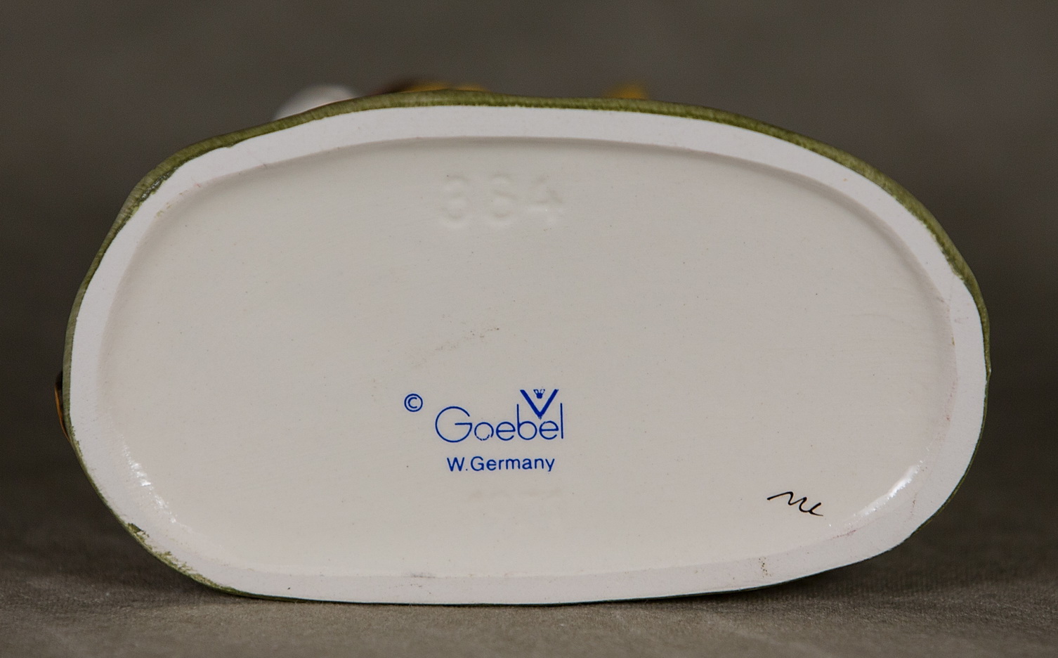 January 16, 2026 - 4-1/4 inches tall. Base is incised 384 and 1971. Goebel TMK 5 trademark imprinted in blue on bottom of base. Painter hand-initialed in black ink on bottom of base.
