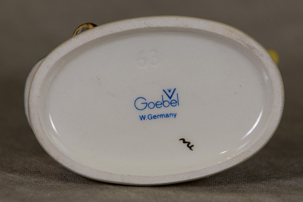 November 19, 2025 - 3 inches tall. Base is incised 63. Goebel TMK 5 trademark imprinted in blue on bottom of base. Painter hand-initialed in black ink on bottom of base.