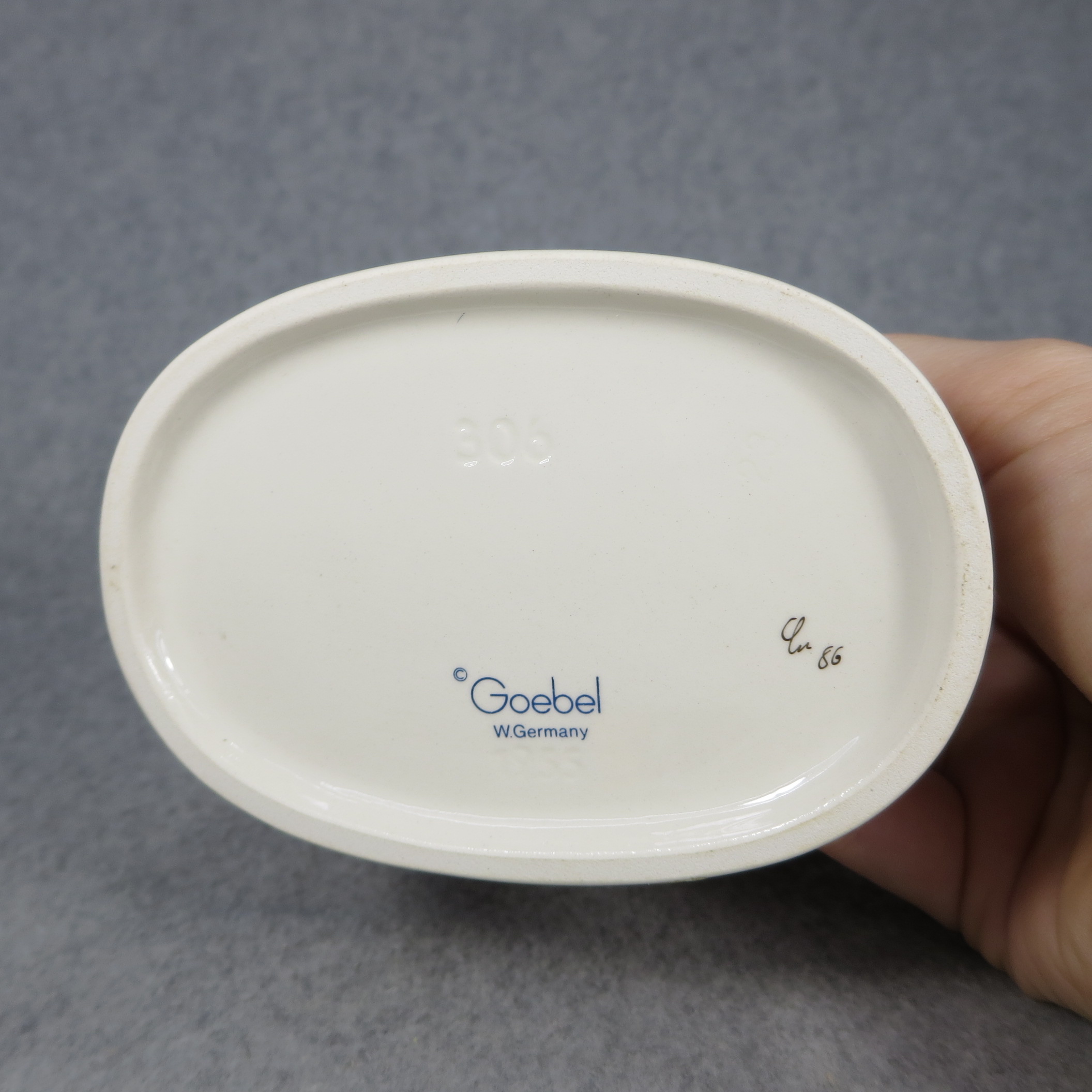 January 16, 2026 - 4-1/2 inches tall. Base is incised 306 and 1955. Goebel TMK 6 trademark imprinted in blue on bottom of base. Painter hand-initialed and dated in black ink on bottom of base.