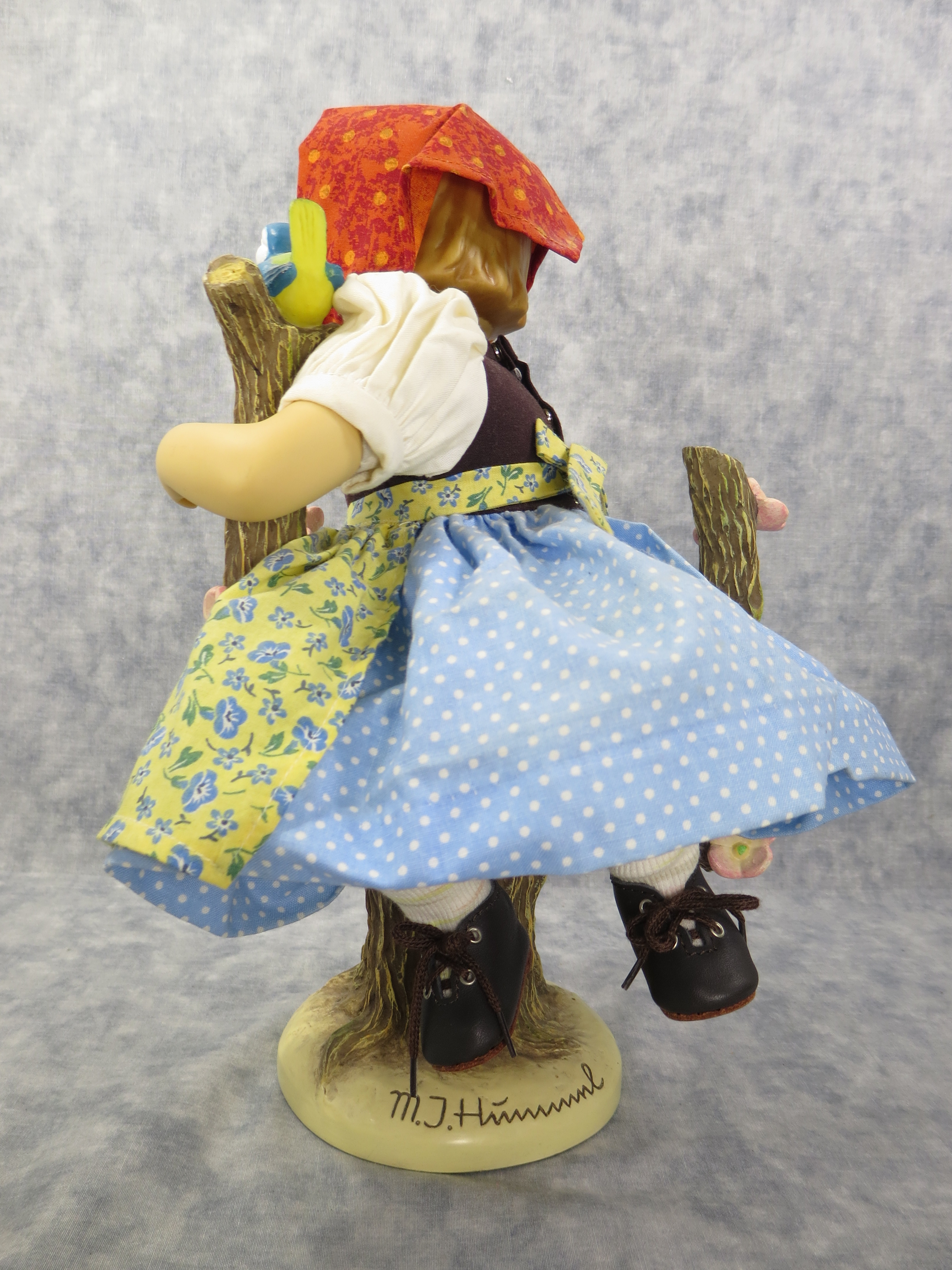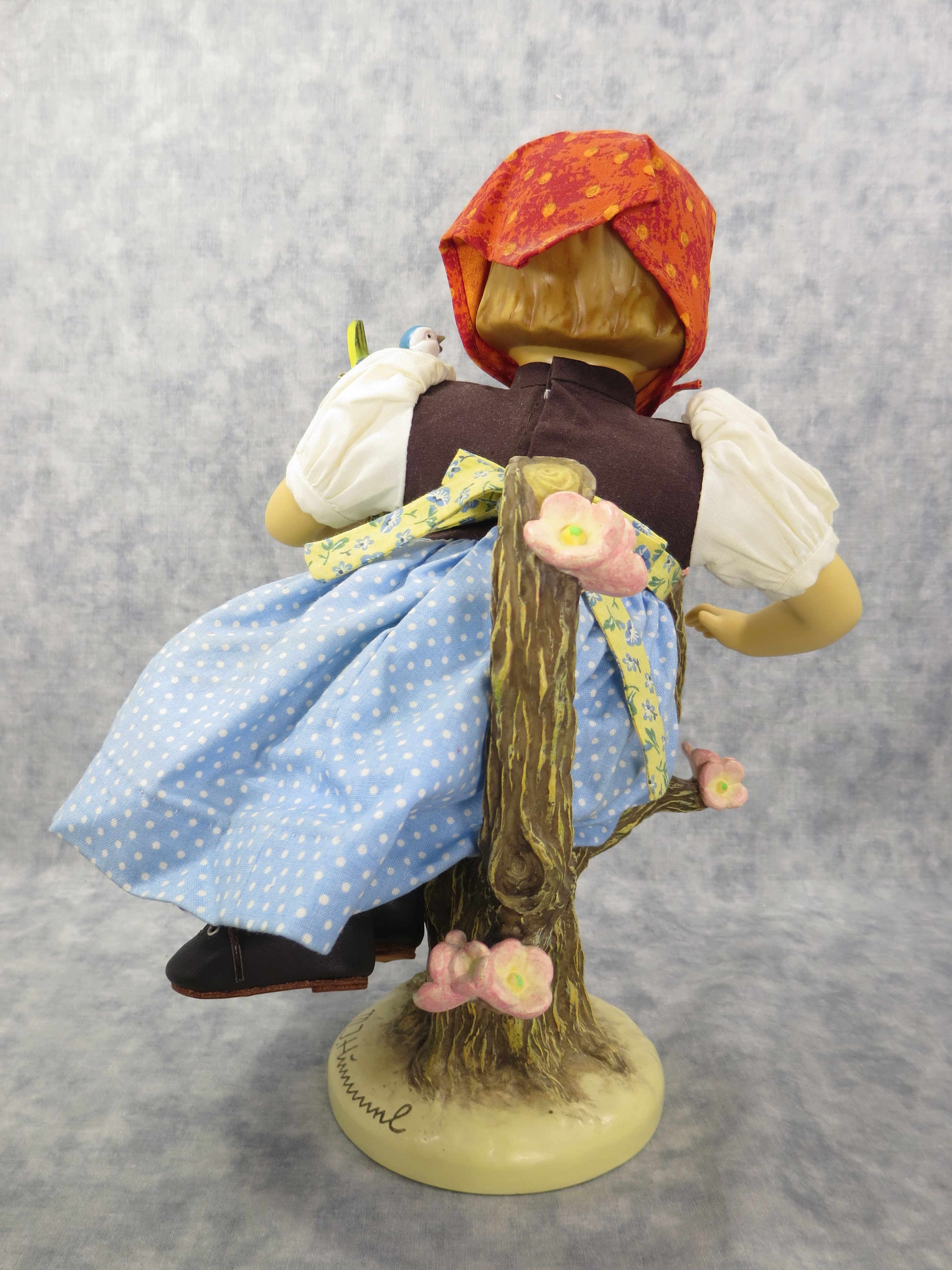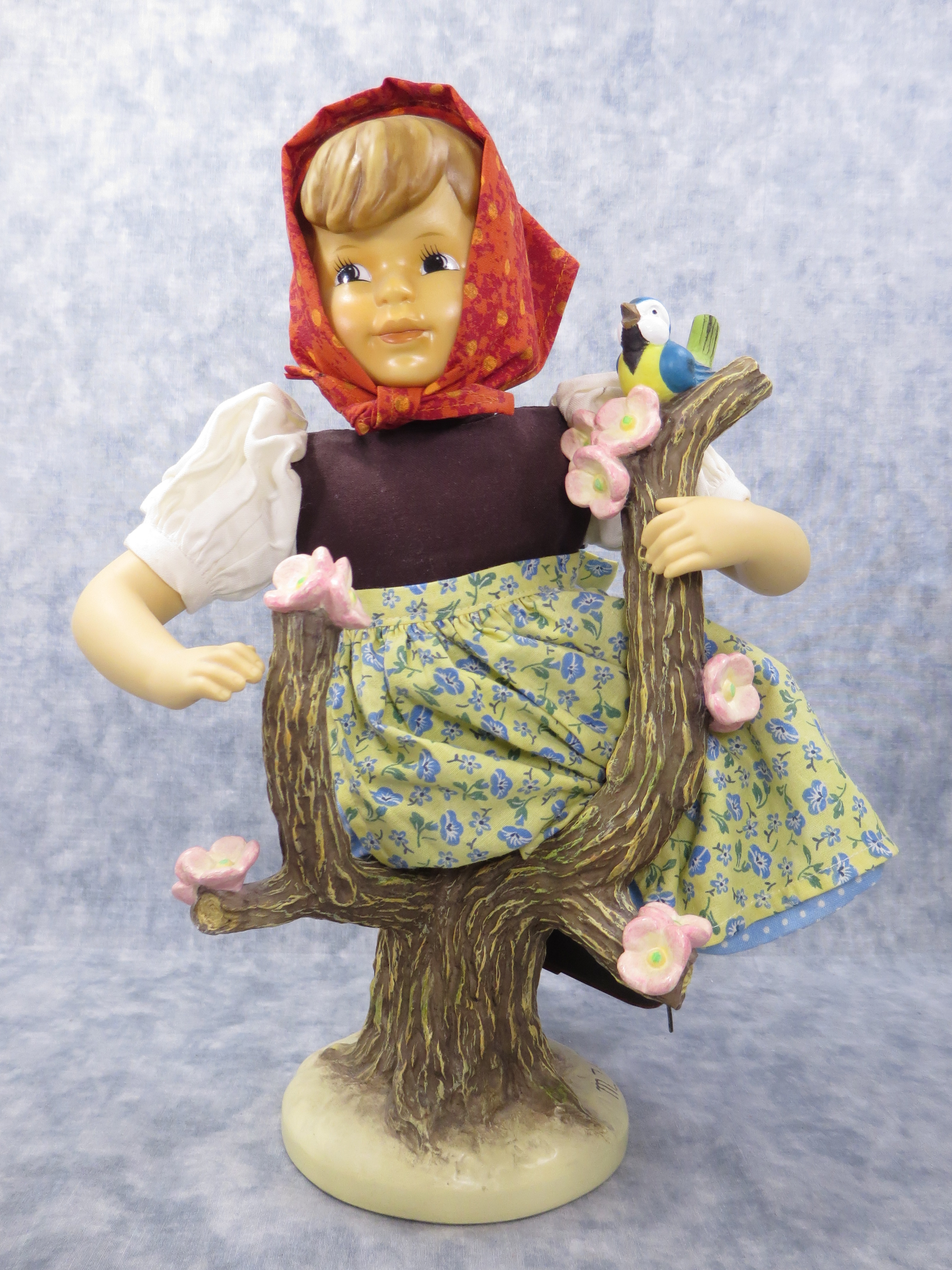 This Apple Tree Girl Doll was released in 1998 and is Goebel's continuation of the doll series began by Danbury Mint. Like the Apple Tree Boy Doll, this doll is costumed by world renowned doll designer Bette Ball and is seated in it's own tree display stand, detailed with apples, apple blossoms, and even a friendly bird. Master sculptor Marion Huschka modeled it in 1996.