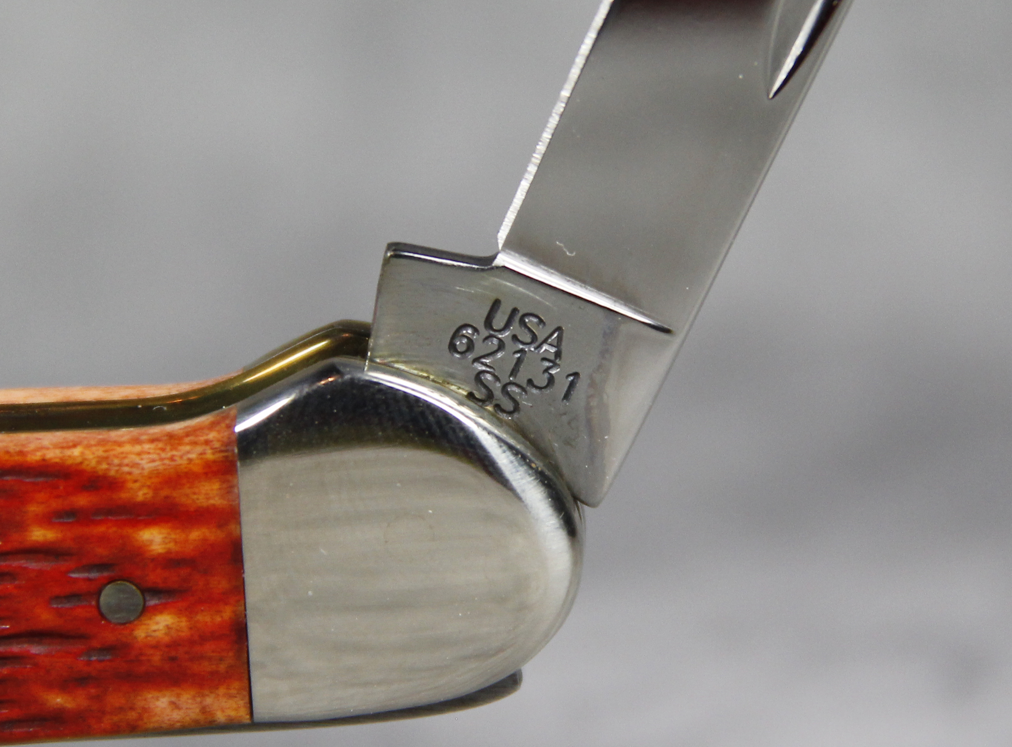 January 08, 2026 - 3-5/8 inches closed. 6-1/4 inches open. Made in USA. "CASE BROS. CUTLERY CO." and "USA 62131 SS" tang stamps. Badge shield. Stainless Steel blades. Jigged Bone handle. Nickel Silver bolsters. Brass liner.