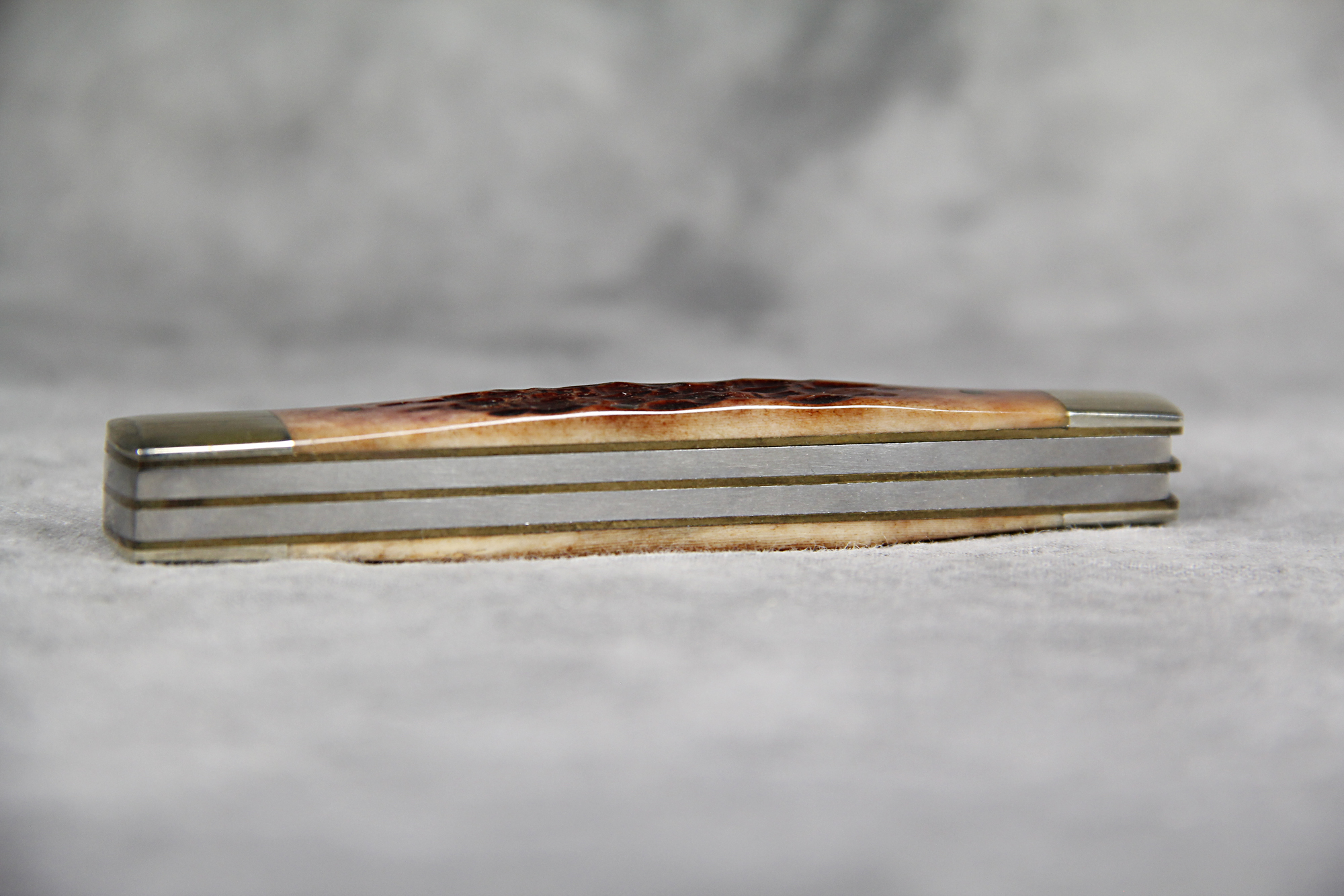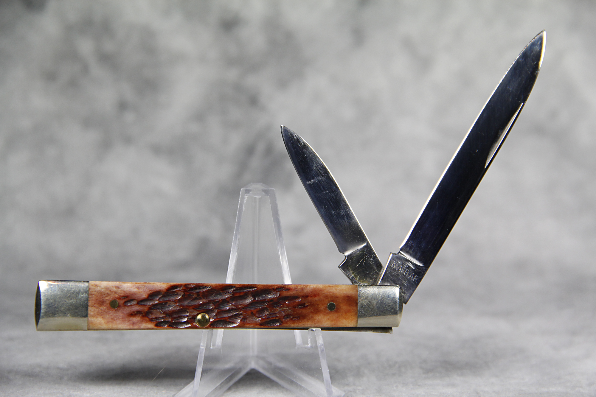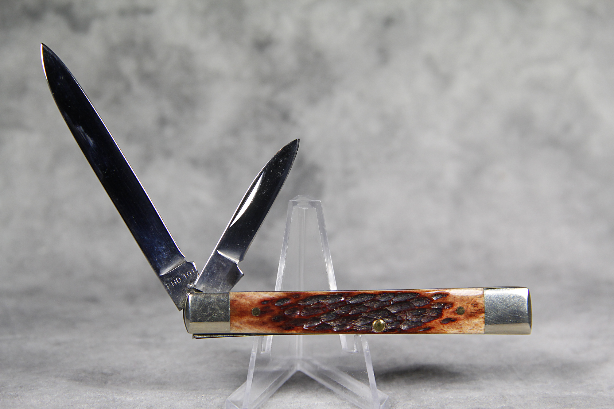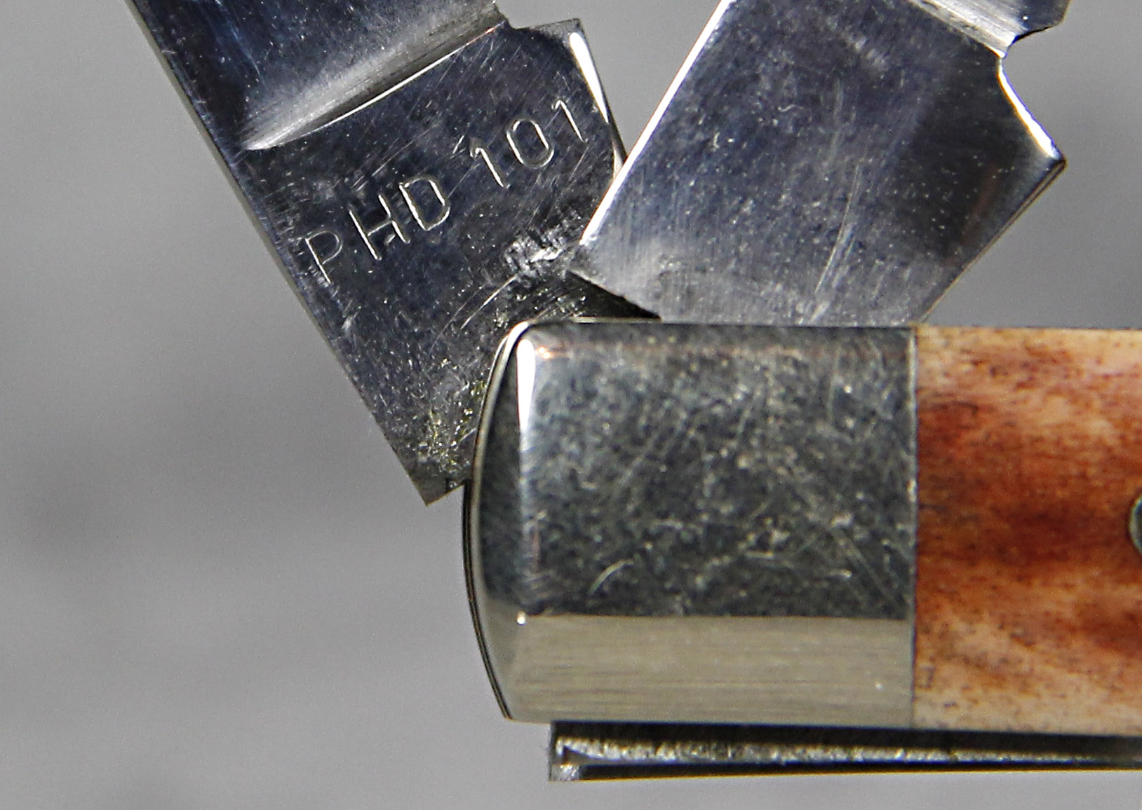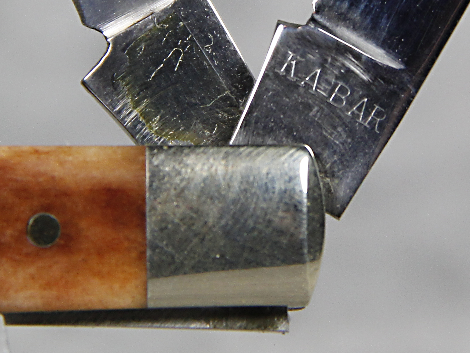 November 03, 2025 - 3-5/8 inches closed. 6-3/4 inches open. Made in USA. "KA-BAR" and "PHD 101" tang stamps. Jigged Bone handle. Nickel Silver bolsters. Brass liner.