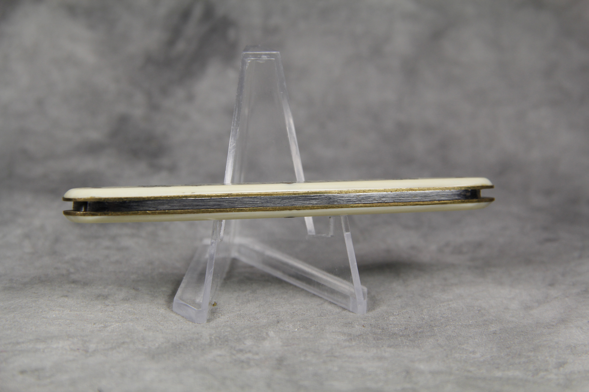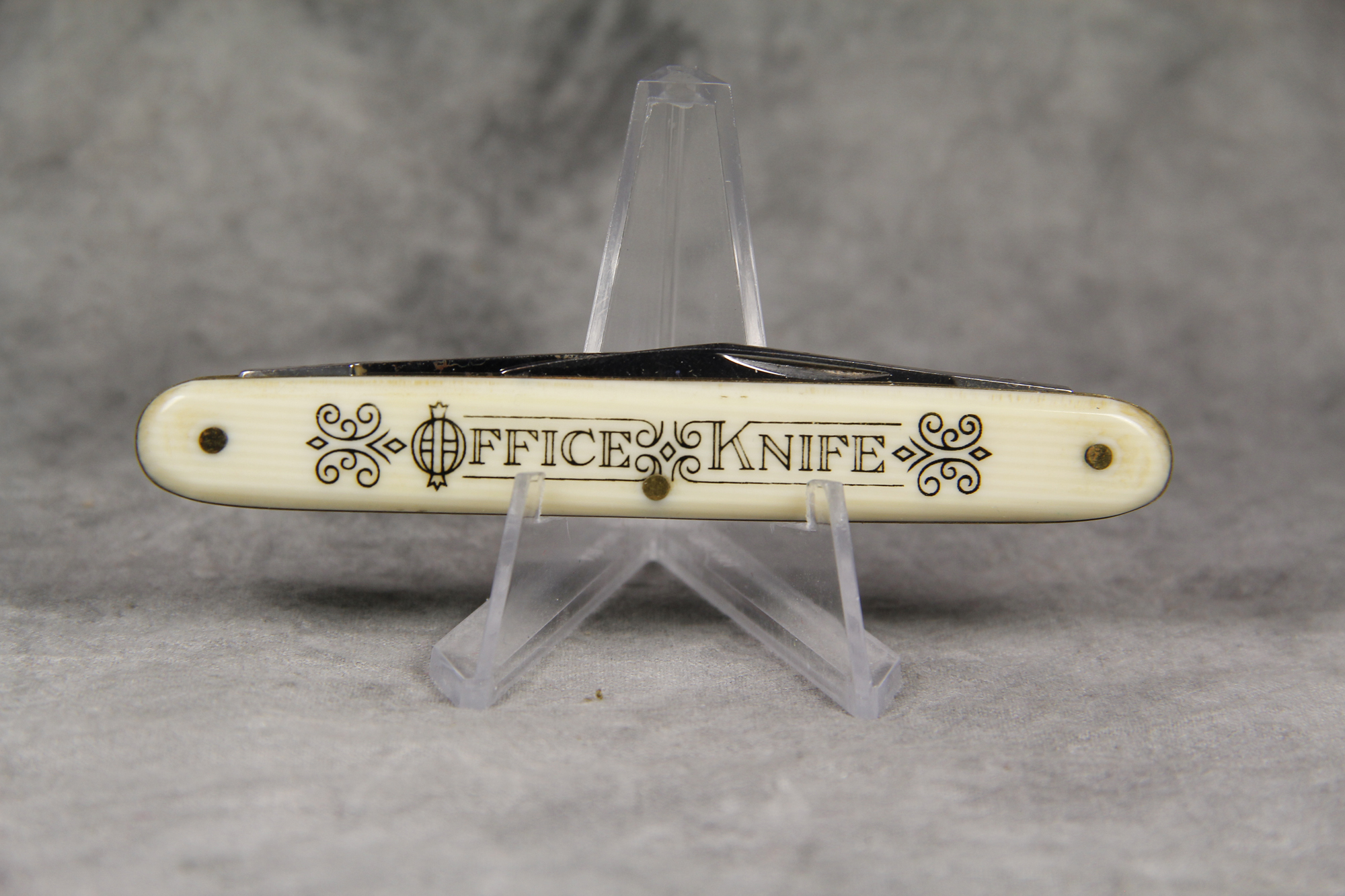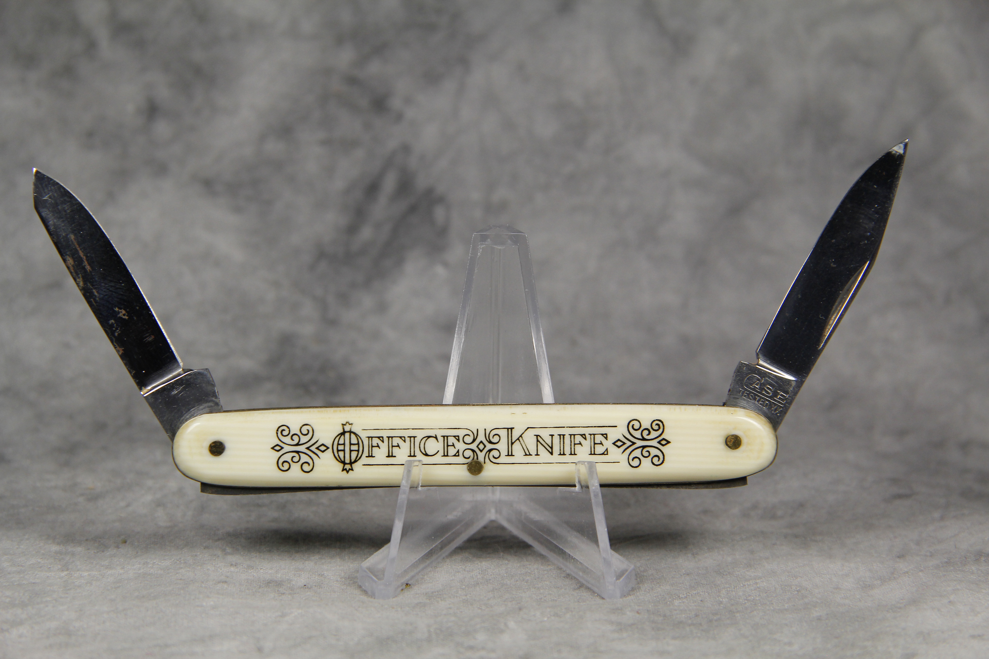 December 22, 2025 - 2-Blade Office Knife. Made in Germany. 3-3/4 inches closed. 5-5/8 inches open. "Long C" CASE TESTED XX" tang stamp (one on each blade). Tang stamps look like tang stamp from 1920-1940 era. Stainless Steel blades. Imitation Ivory handle stamped with scrollwork and "OFFICE KNIFE". Brass liner.