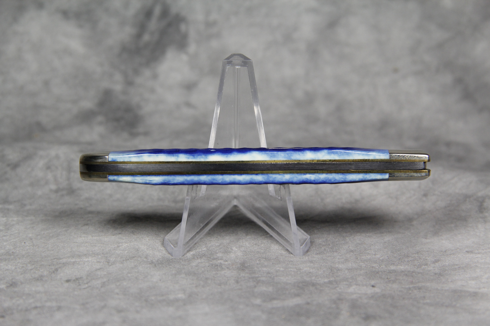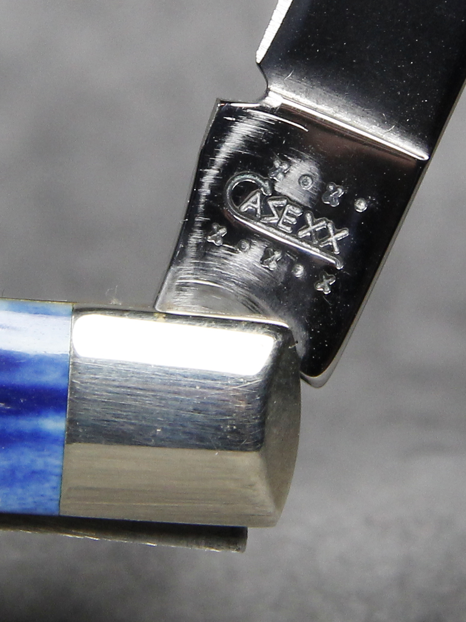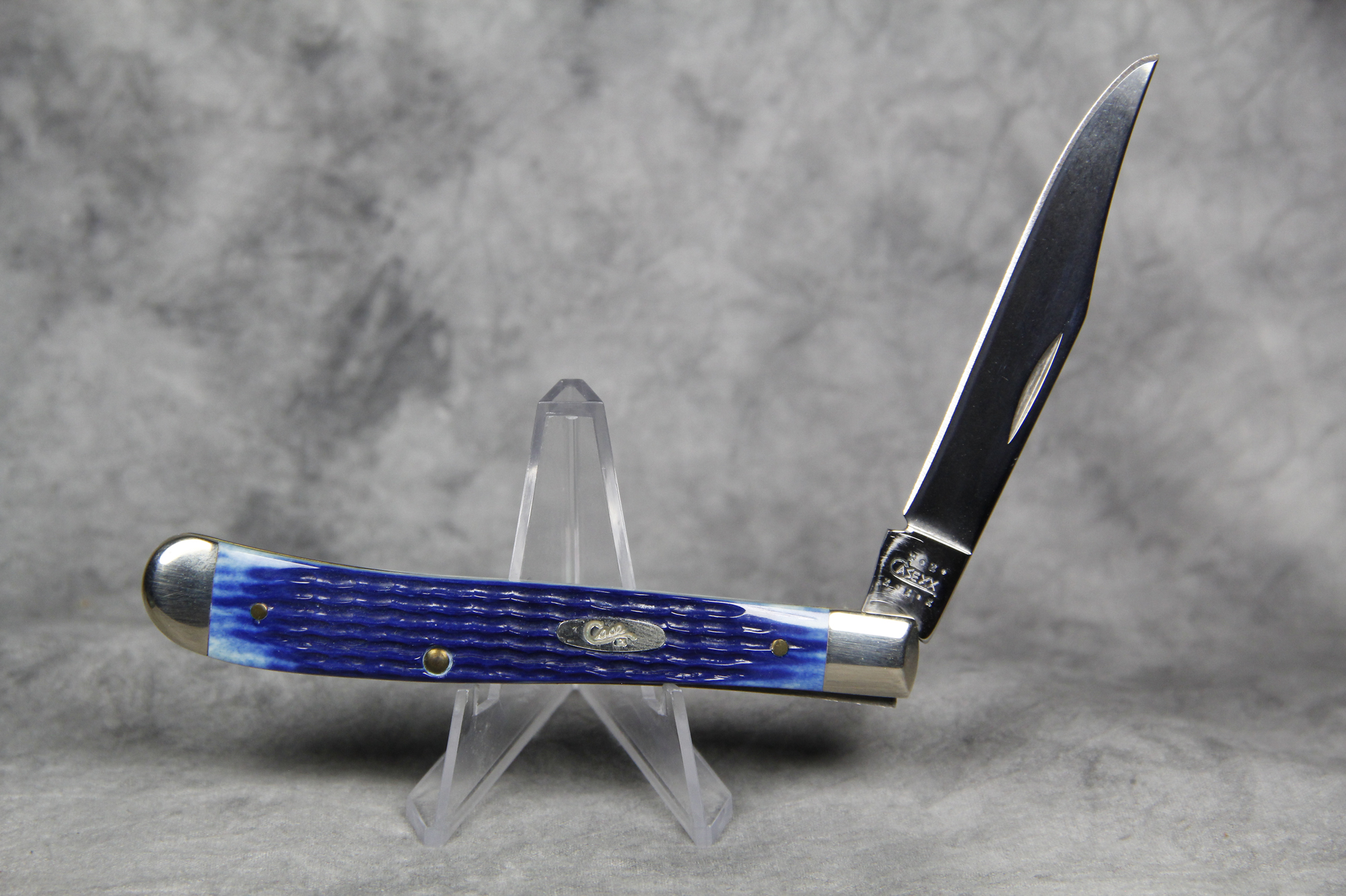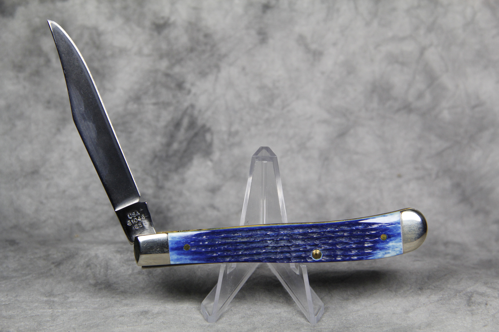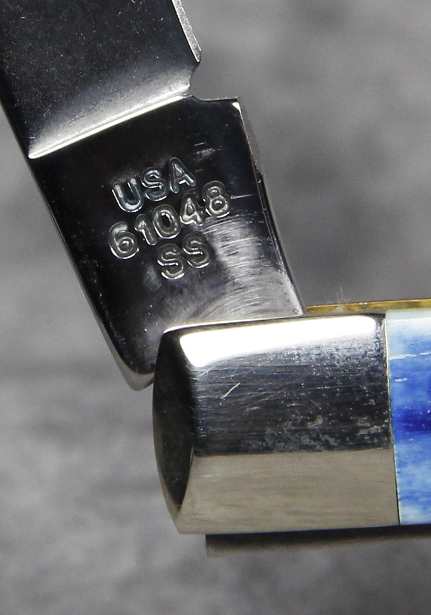 April 04, 2026 - 4-1/8 inches closed. 7-3/8 inches open. Made in USA. "   x*x*   CASE XX  x*x*x  " (with lightning bolt S) and "USA 61048 SS" tang stamps. Single oval 'Long C' CASE XX shield. Stainless Steel blade. Blue Jigged Bone handle. Nickel Silver bolsters. Brass liner.