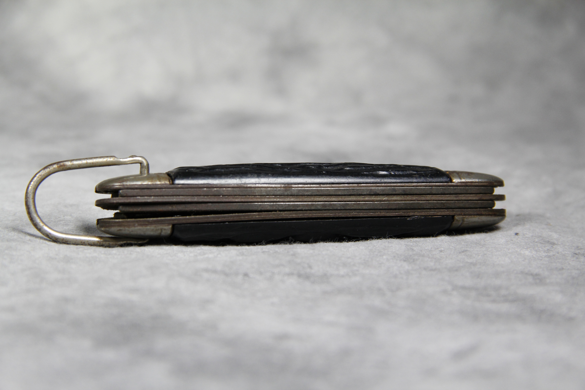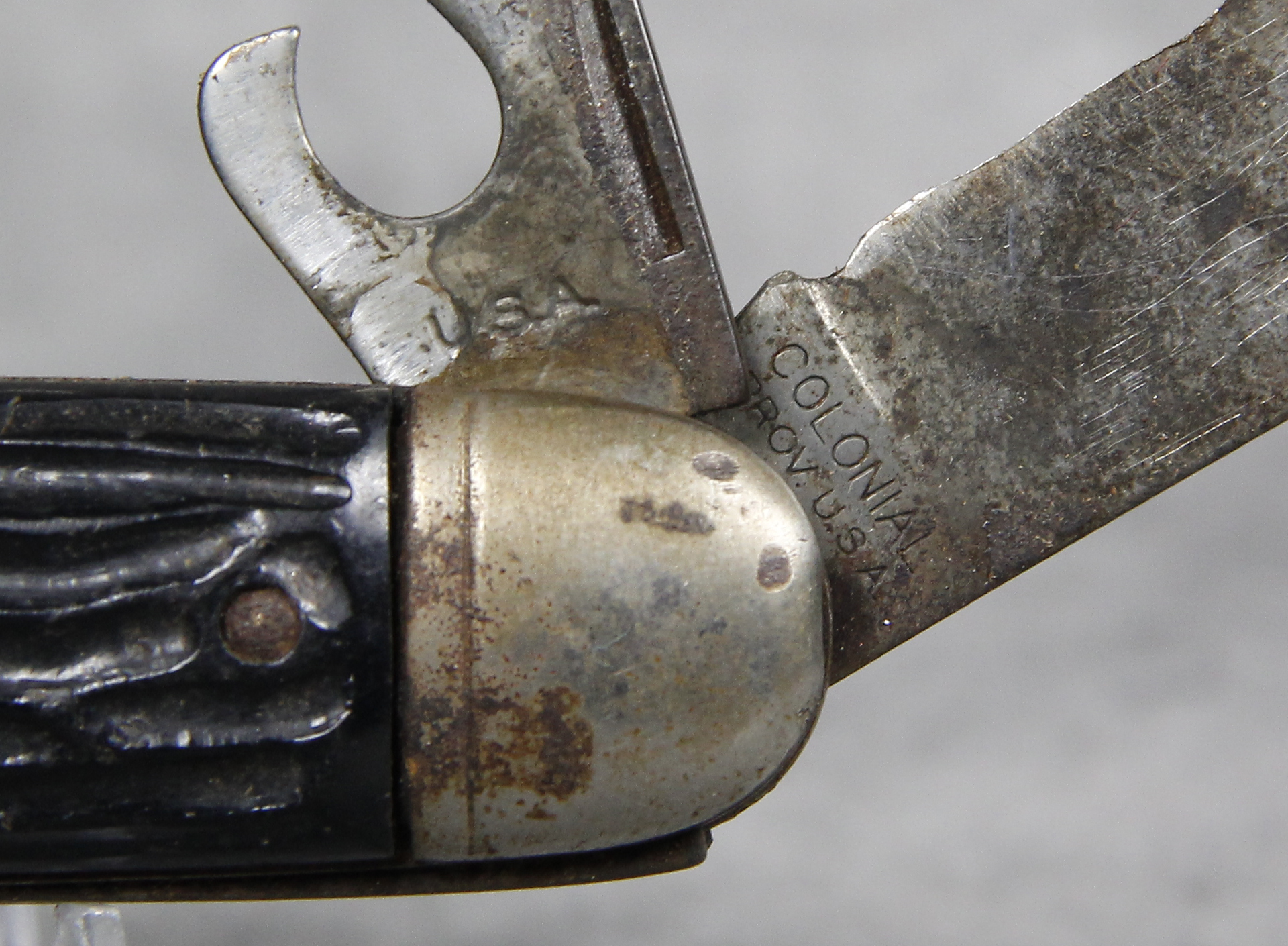 November 03, 2025 - 4-Blade "Forest Master" Utility Knife. 3-3/4 inches closed. 6-3/8 inches open. "COLONIAL PROV. U.S.A." tang stamp. Bowtie "FOREST MASTER" shield. Composition handle.