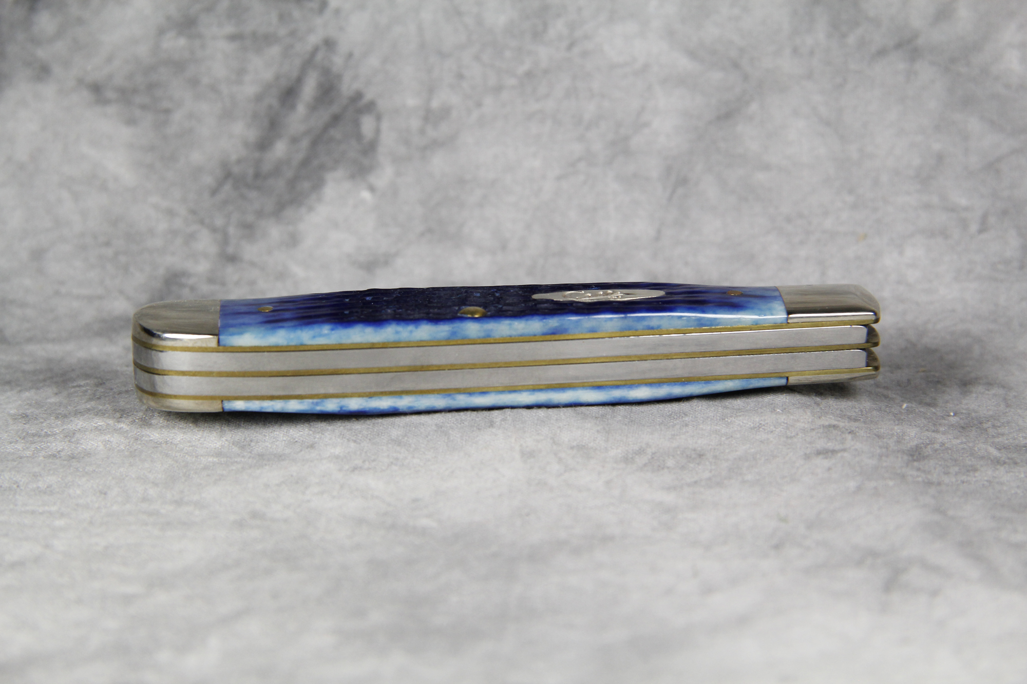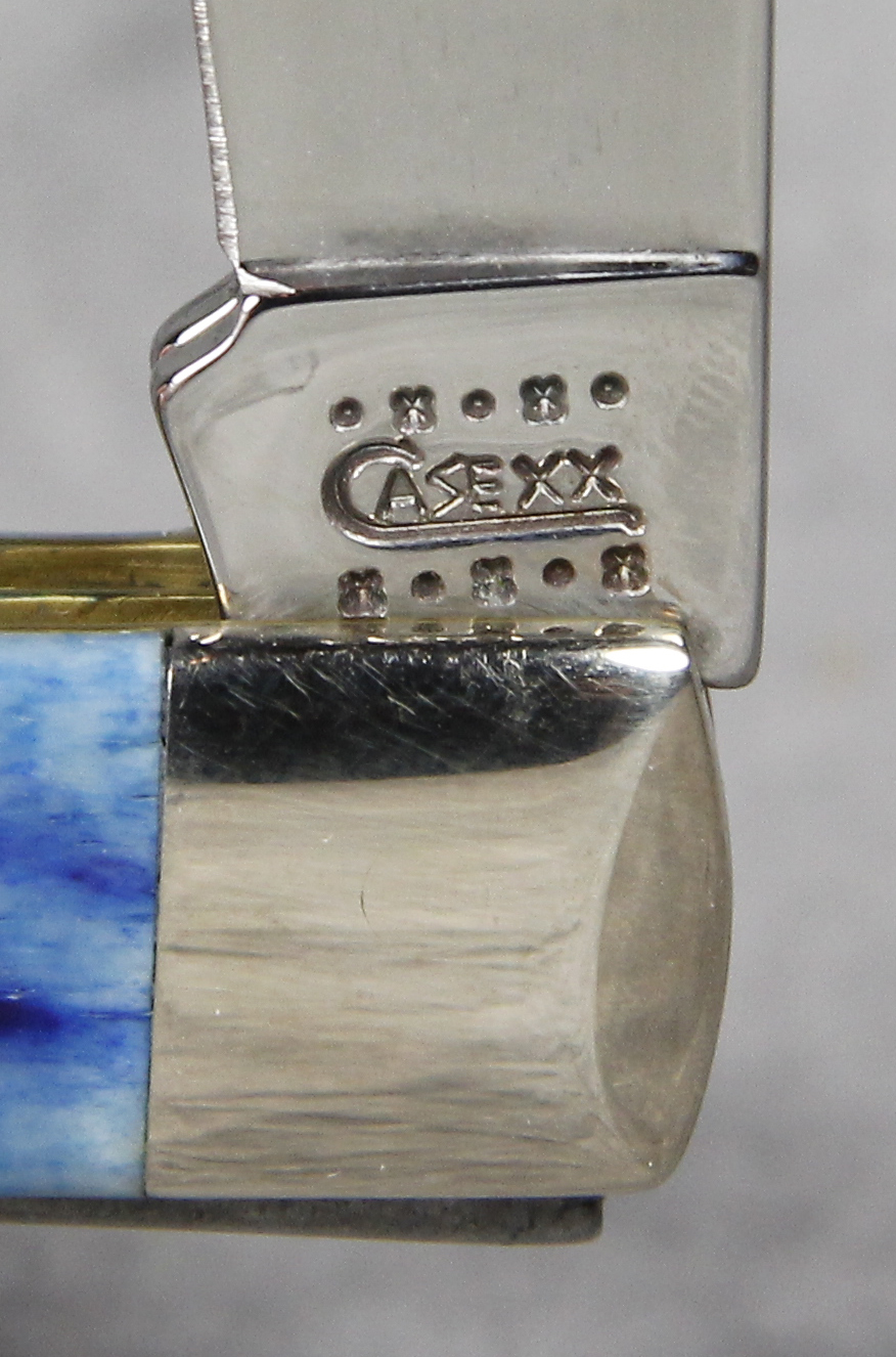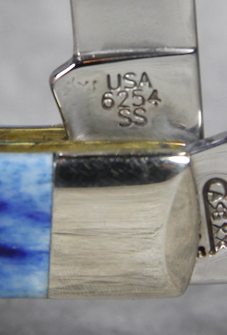 April 24, 2026 - 4-1/8 inches closed. 7-3/8 inches open. Made in USA. " *x*x* Case XX  x*x*x " (with lightning bolt S), "USA", and "USA 6254 SS" tang stamps. Oval Long C Script CASE XX shield. Stainless Steel blades. Blue Jigged Bone handle. Nickel Silver bolsters. Brass liner.