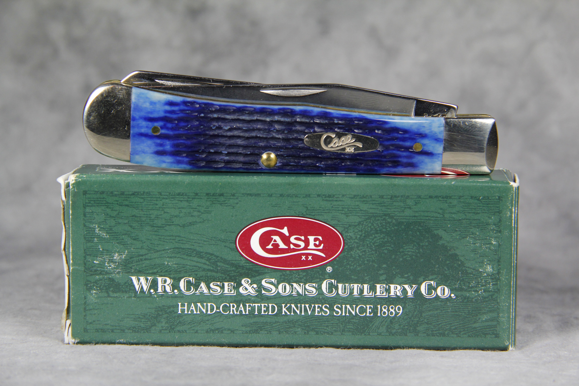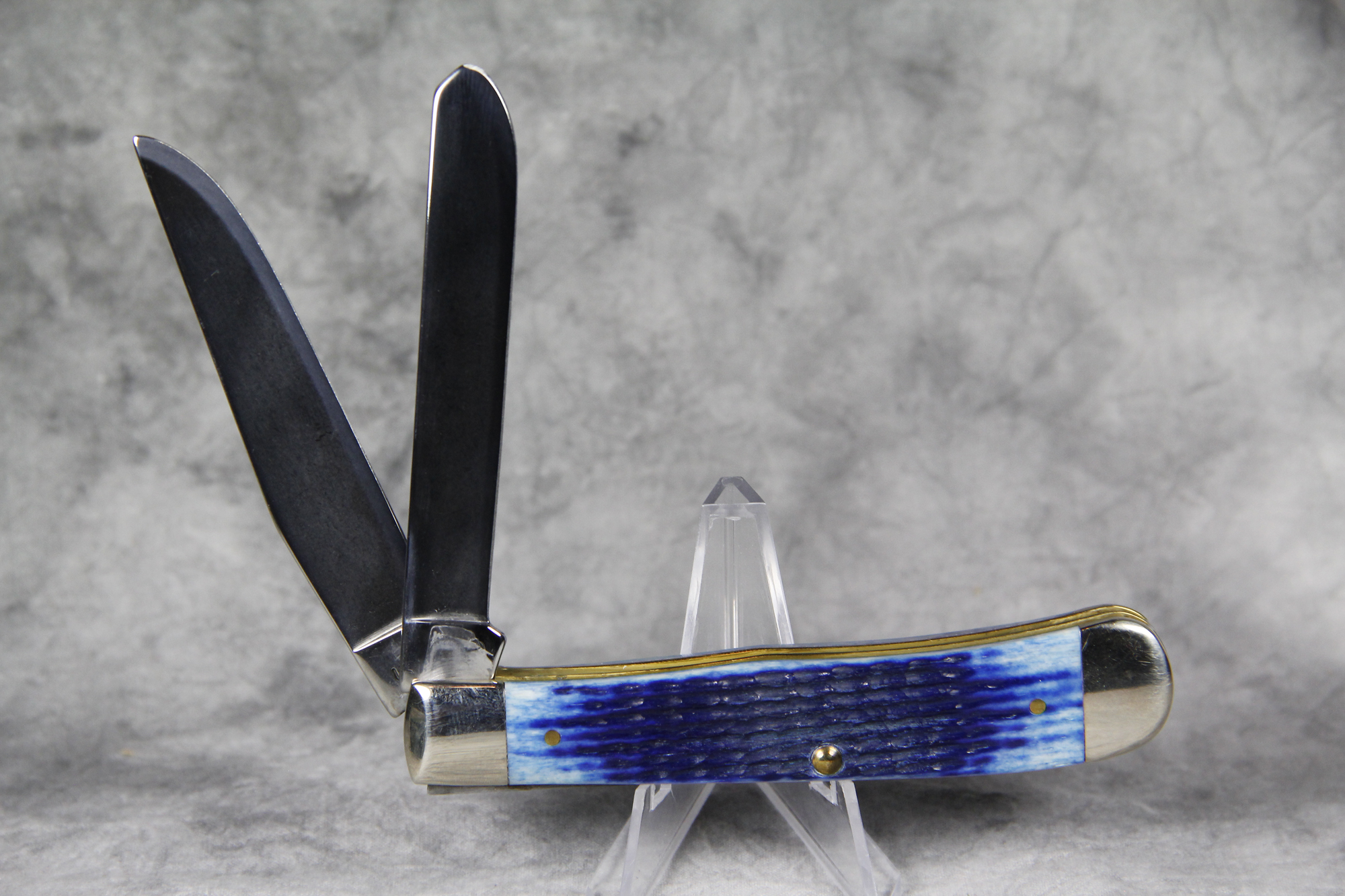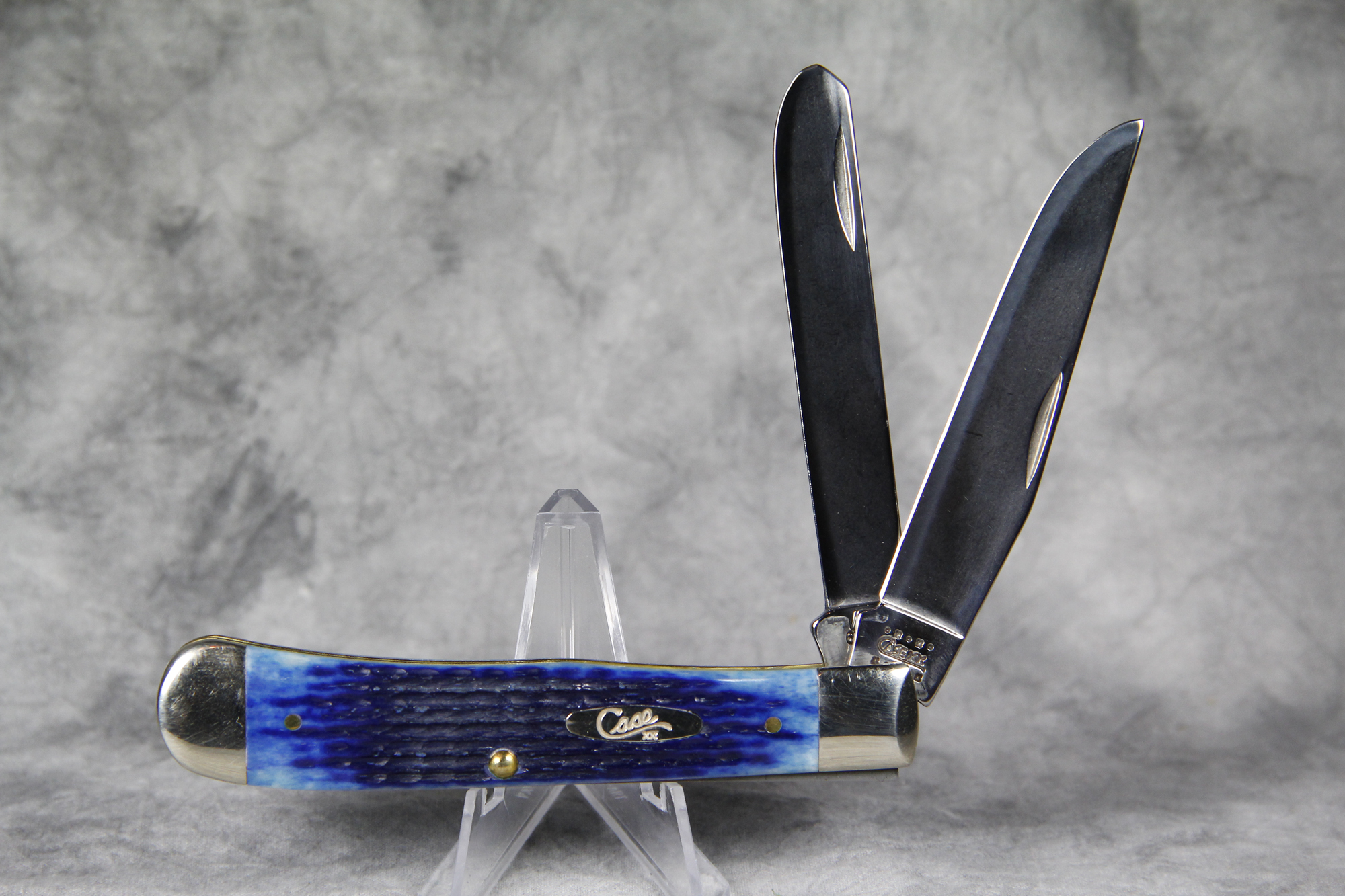 April 24, 2026 - 4-1/8 inches closed. 7-3/8 inches open. Made in USA. " *x*x* Case XX  x*x*x " (with lightning bolt S), "USA", and "USA 6254 SS" tang stamps. Oval Long C Script CASE XX shield. Stainless Steel blades. Blue Jigged Bone handle. Nickel Silver bolsters. Brass liner.