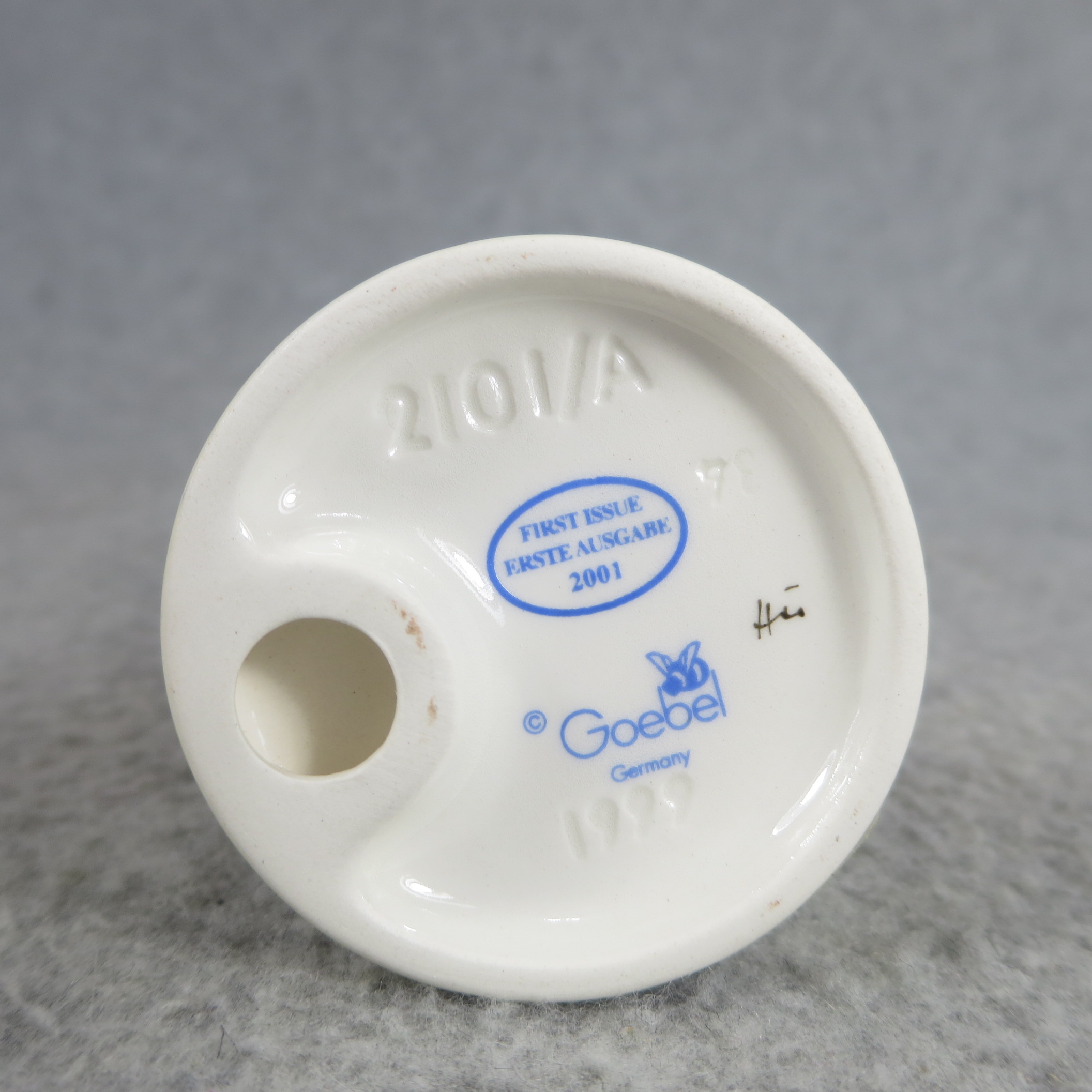March 13, 2026 - 4 inches tall. Base is incised 2101/A and 1999. Goebel TMK 8 trademark and 'FIRST ISSUE 2001' imprinted in blue on bottom of base. Painter hand-initialed in black ink on bottom of base.